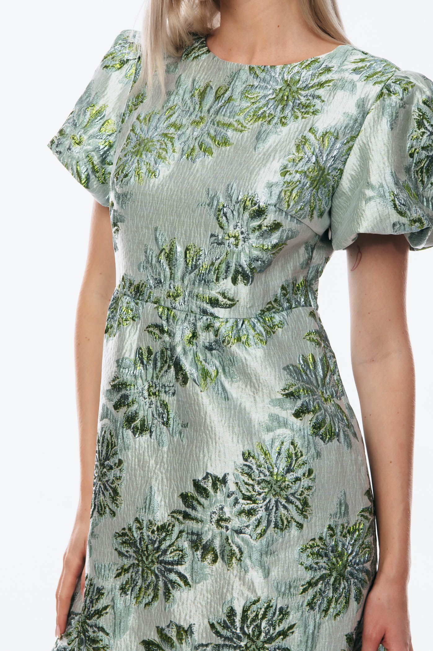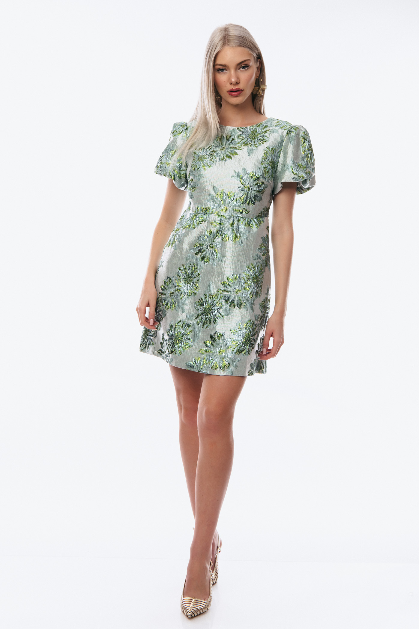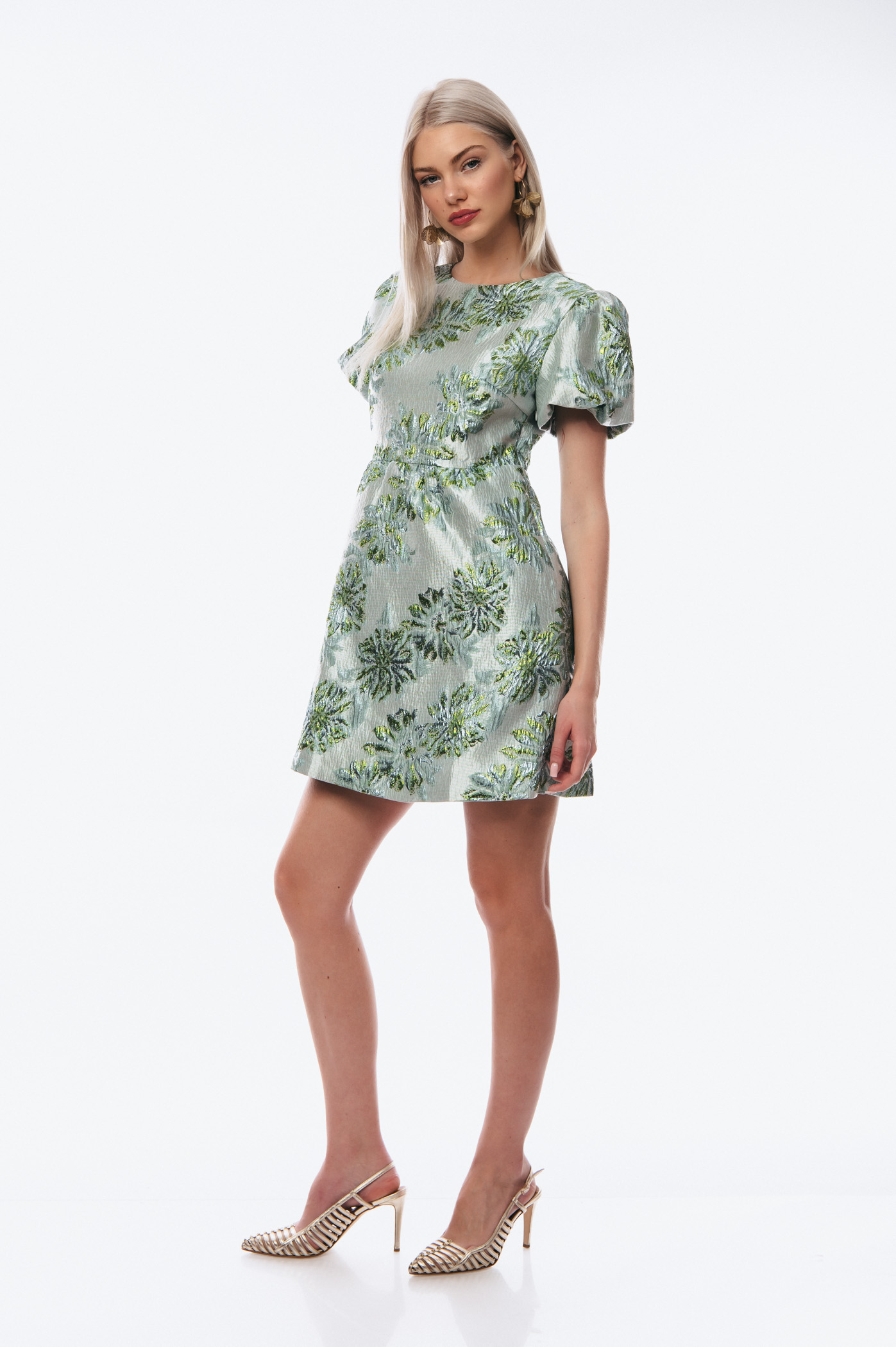 Αναδείξτε τη θηλυκότητά σας με αυτό το εκθαμβωτικό φόρεμα σε Α γραμμή, διακοσμημένο με περίτεχνο φλοράλ μποκάρ σε πράσινη-βεραμάν απόχρωση με χρυσές λεπτομέρειες. Οι φουσκωτοί κοντοί ώμοι προσθέτουν μια ρομαντική νότα και ο λαιμός είναι στρογγυλός. Το φόρεμα διαθέτει ένα ιδιαίτερο άνοιγμα στην πλάτη που προσδίδει μια σύγχρονη και τολμηρή πινελιά.