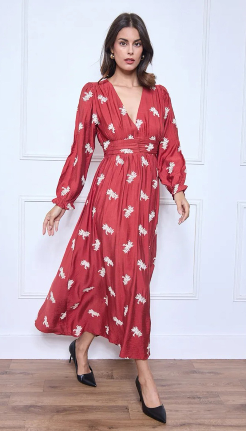 Ένα εντυπωσιακό φόρεμα σε κόκκινο χρώμα, διακοσμημένο με λευκά κεντήματα που δημιουργούν ένα λεπτό σχέδιο. Διαθέτει μακριά, φουσκωτά μανίκια με λάστιχο στους καρπούς και λαιμόκοψη σε σχήμα V. Η μέση είναι τονισμένη με σούρα και το φόρεμα πέφτει άνετα, σε γραμμή Α, μέχρι τους αστραγάλους.