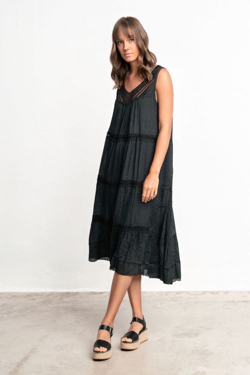 Φόρεμα με χοντρή ράντα και λεπτομέρεις στο λαιμό και στο μήκος του.