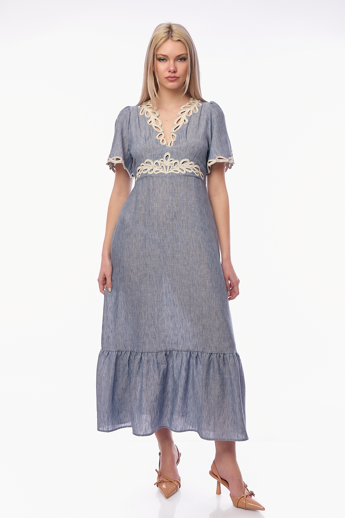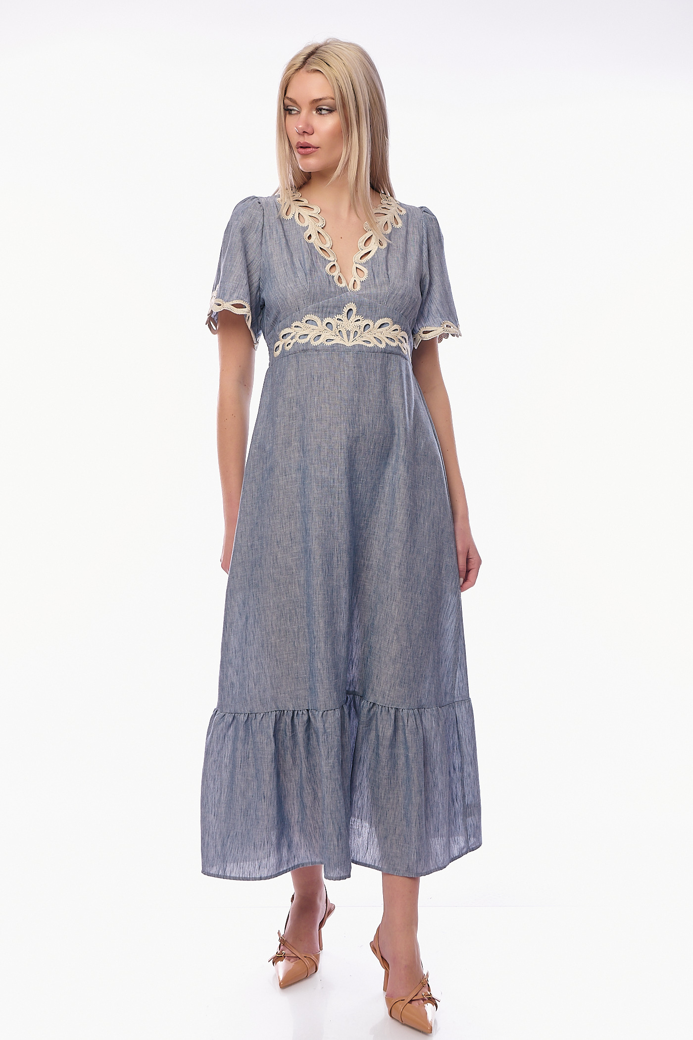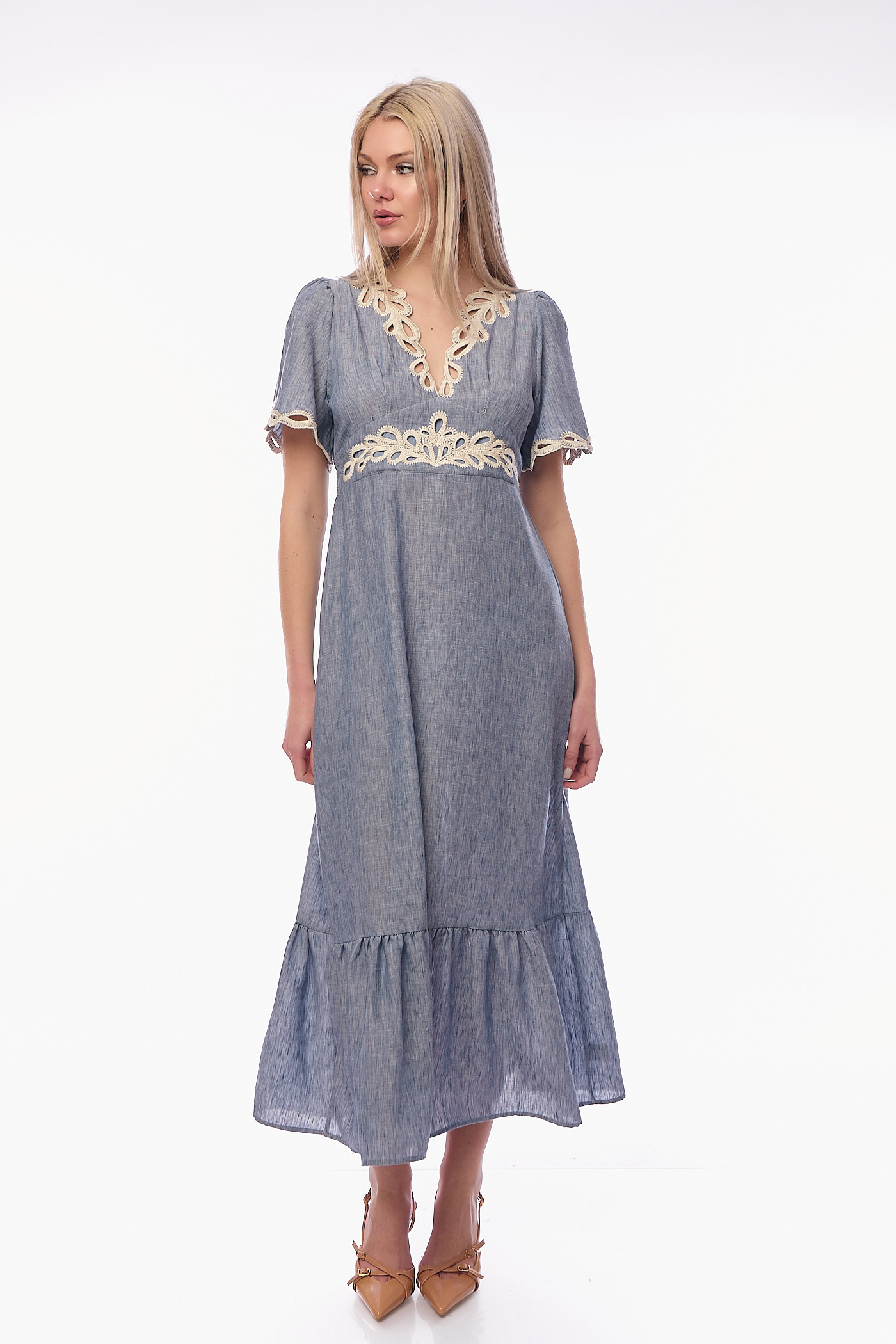 Αναδείξτε τη θηλυκότητά σας με ένα φόρεμα που συνδυάζει την αέρινη κίνηση με την πολυτέλεια του κεντήματος. Αυτό το midi φόρεμα σε απαλή denim-blue απόχρωση ξεχωρίζει για το περίτεχνο guipure κέντημα σε cream τόνους, το οποίο διακοσμεί τη V λαιμόκοψη, τη μέση και τα τελειώματα στα μανίκια.