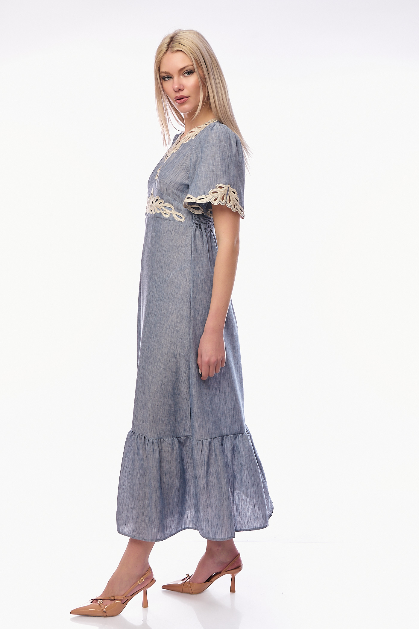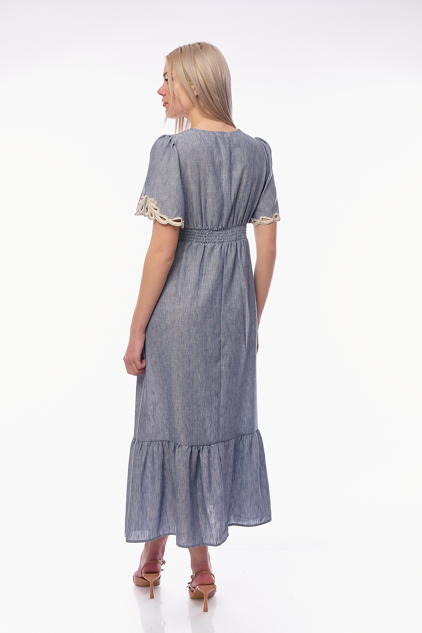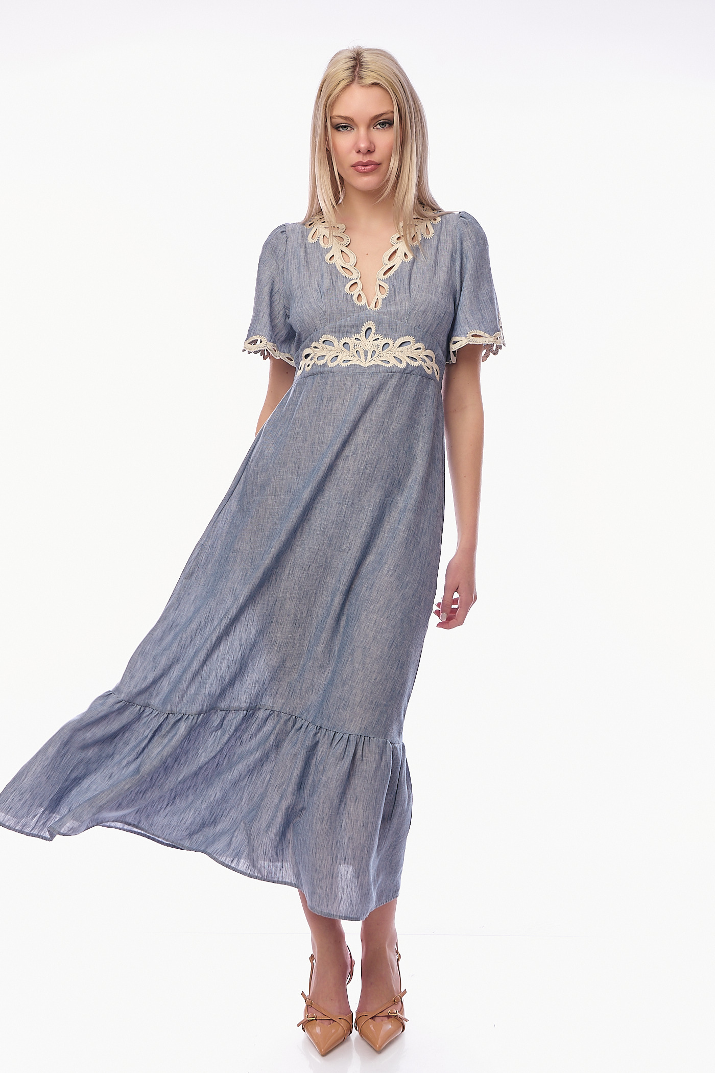 Αναδείξτε τη θηλυκότητά σας με ένα φόρεμα που συνδυάζει την αέρινη κίνηση με την πολυτέλεια του κεντήματος. Αυτό το midi φόρεμα σε απαλή denim-blue απόχρωση ξεχωρίζει για το περίτεχνο guipure κέντημα σε cream τόνους, το οποίο διακοσμεί τη V λαιμόκοψη, τη μέση και τα τελειώματα στα μανίκια.