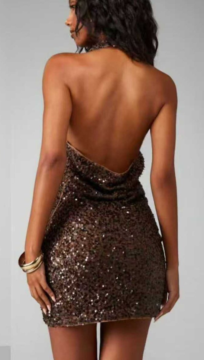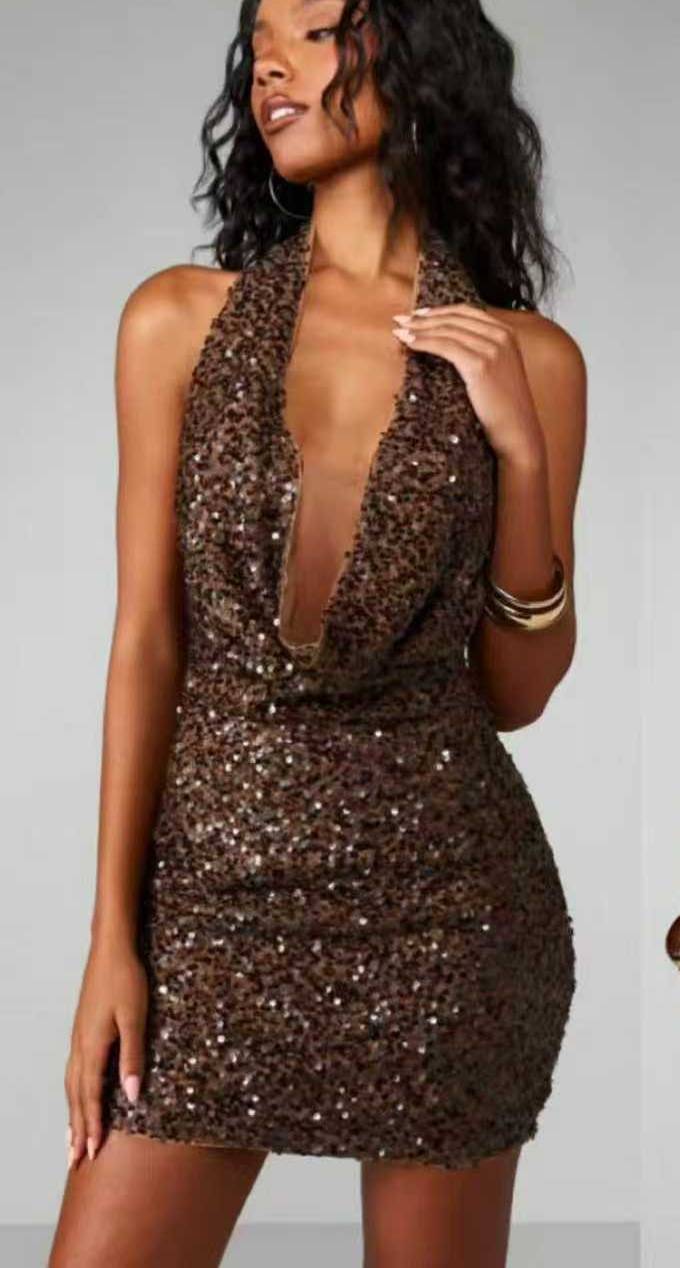 Mini Φόρεμα Halter-Neck με Βαθύ Ντεκολτέ, Πάγιέτες & Ανοιχτή Πλάτη Σκούρο Καφέ-FS57528