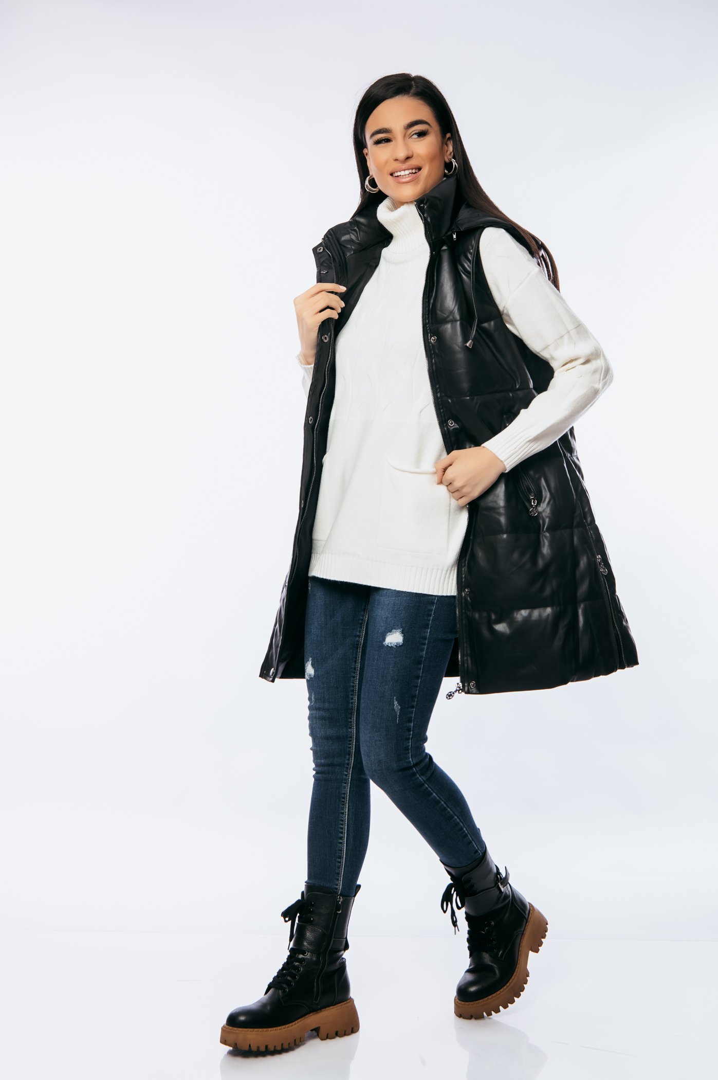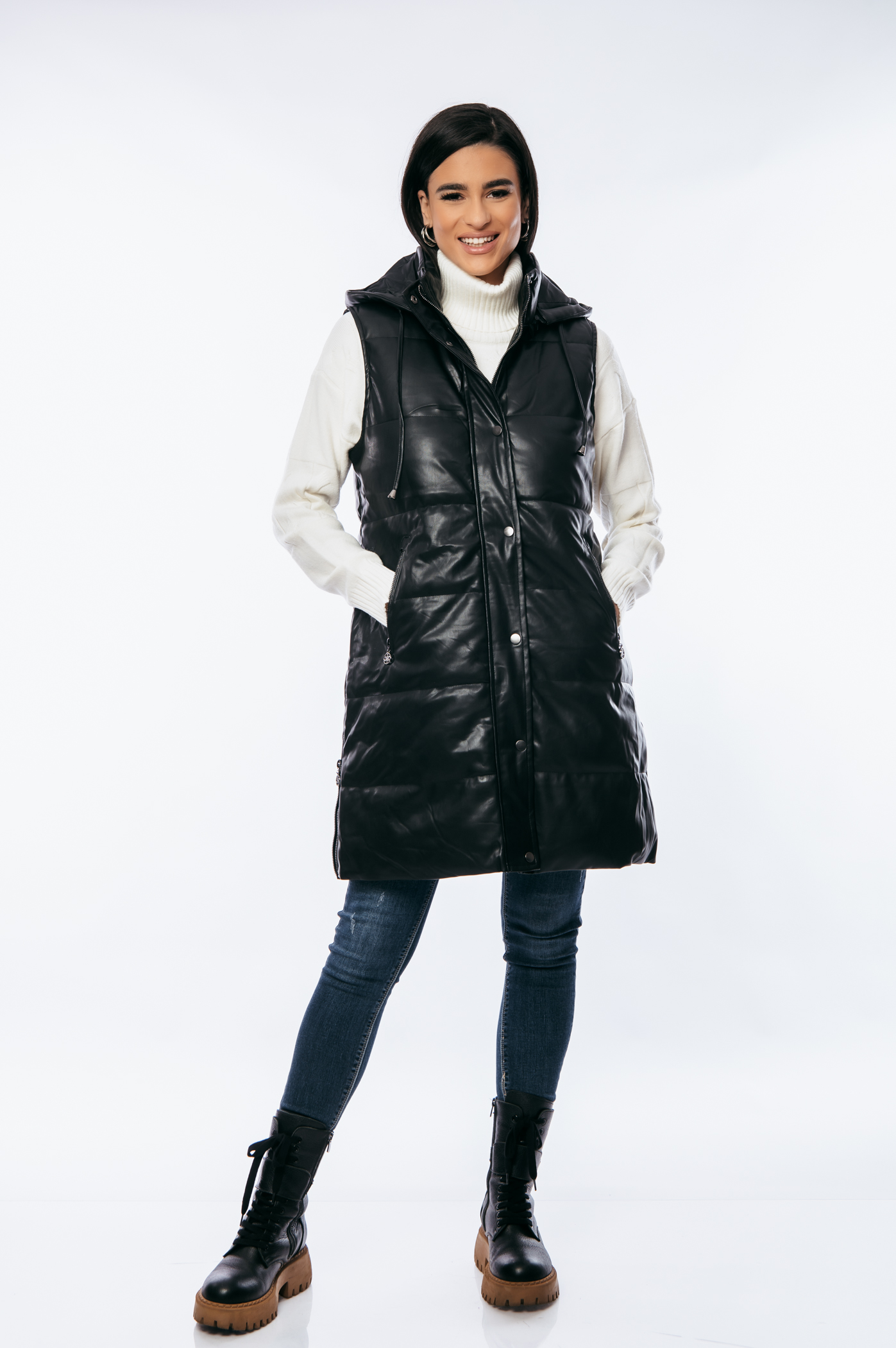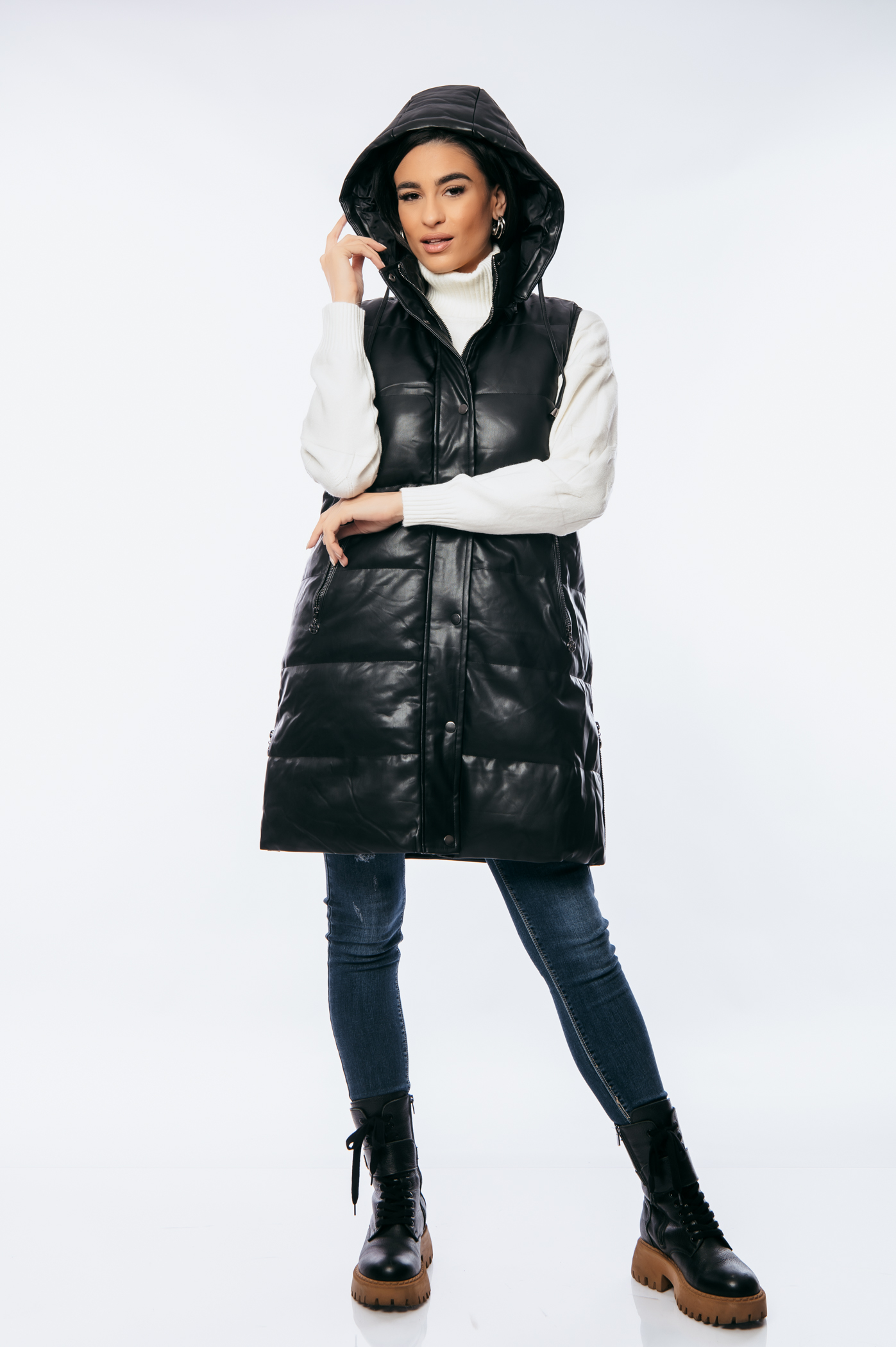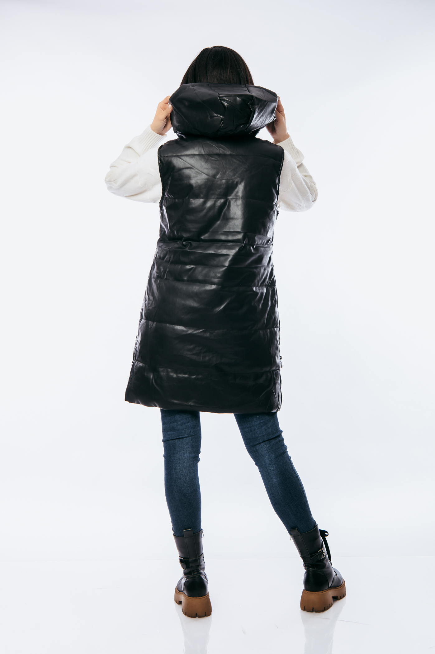 Αμάνικο τζάκετ δερματίνι μακρύ με τσέπες,κουμπιά και φερμουάρ και αποσπώμενη κουκούλα με κορδόνια.