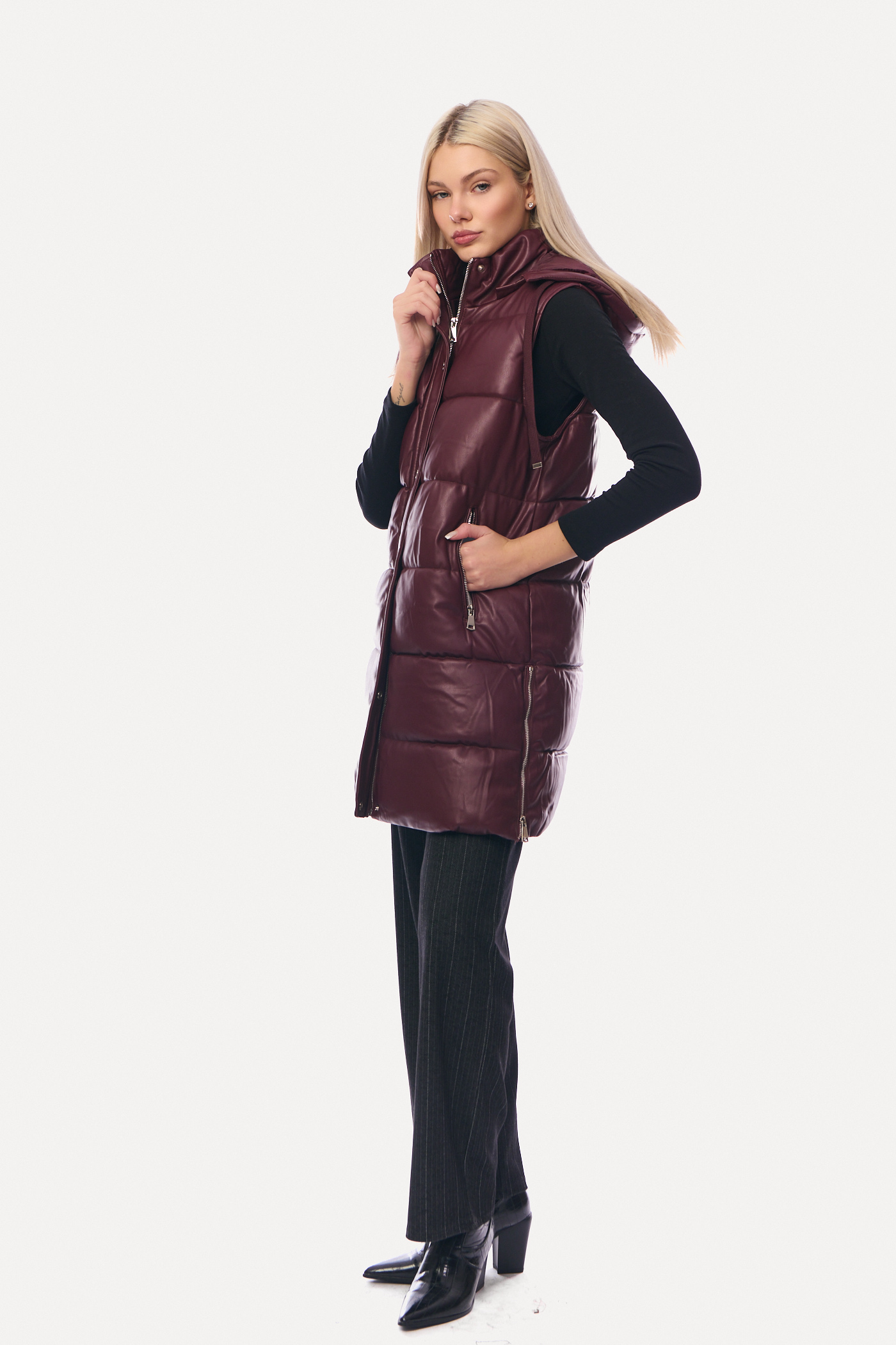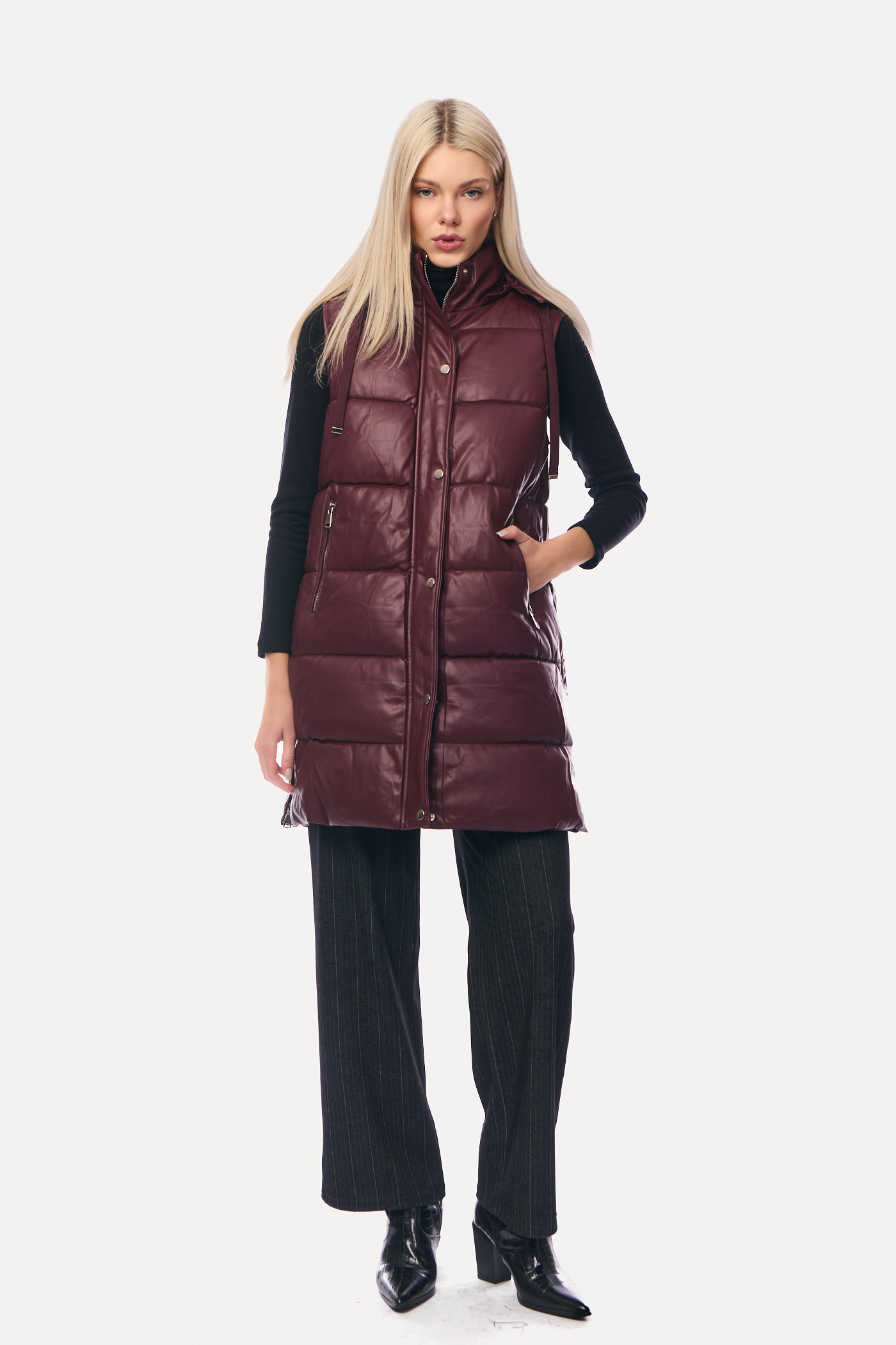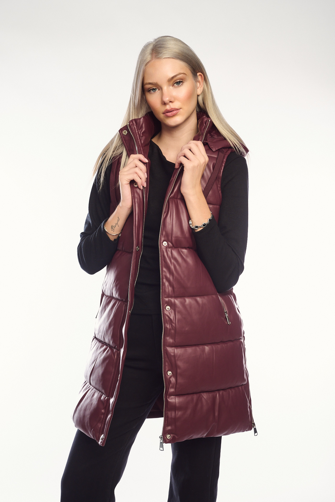 Μακρύ μπορντό γιλέκο δερματίνης Puffer-2333G