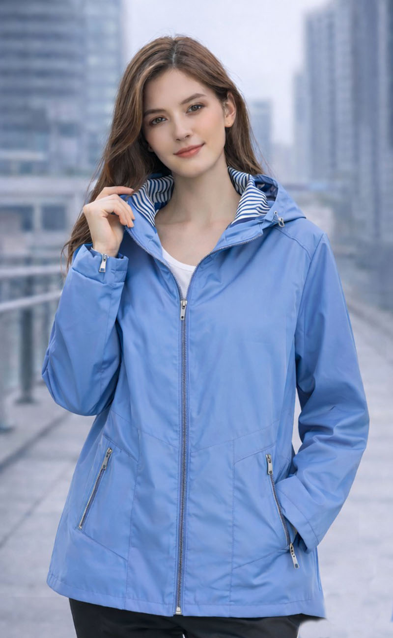 Γυναικεία Πανωφόρια : Γυναικείο Αντιανεμικό Μπουφάν σε Σιέλ Απόχρωση με Κουκούλα και Εσωτερική Ριγέ Λεπτομέρεια-A2681
