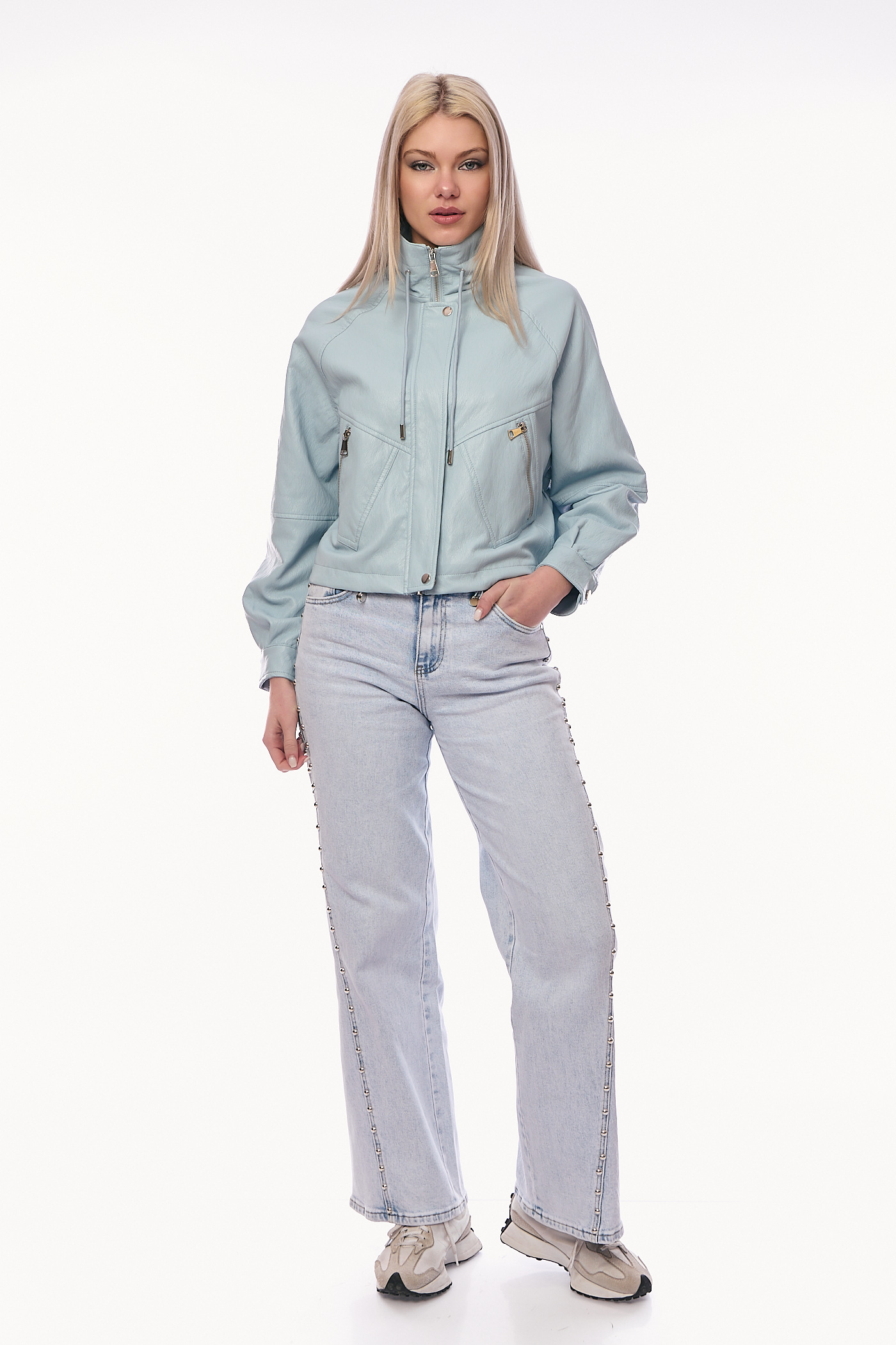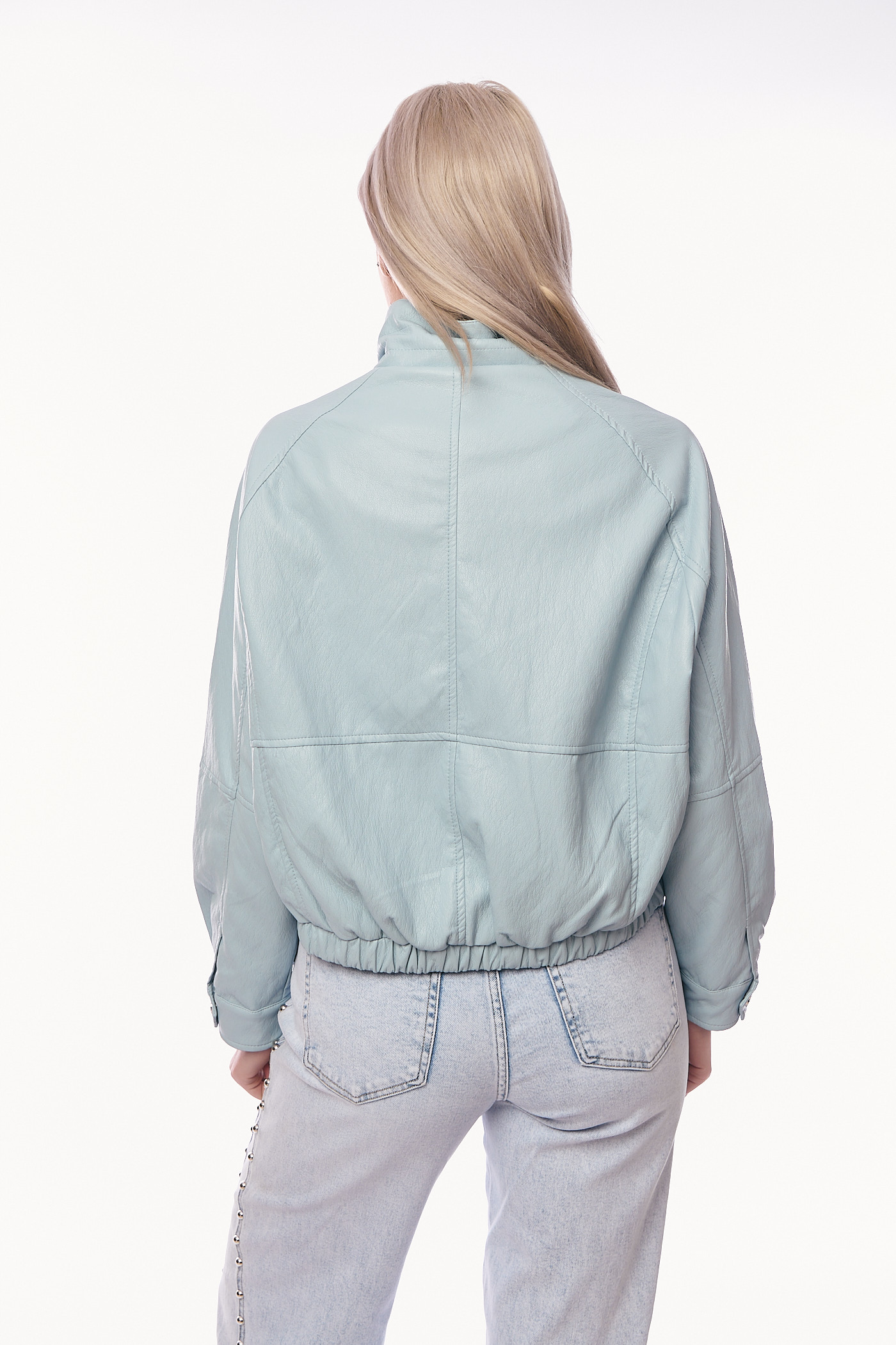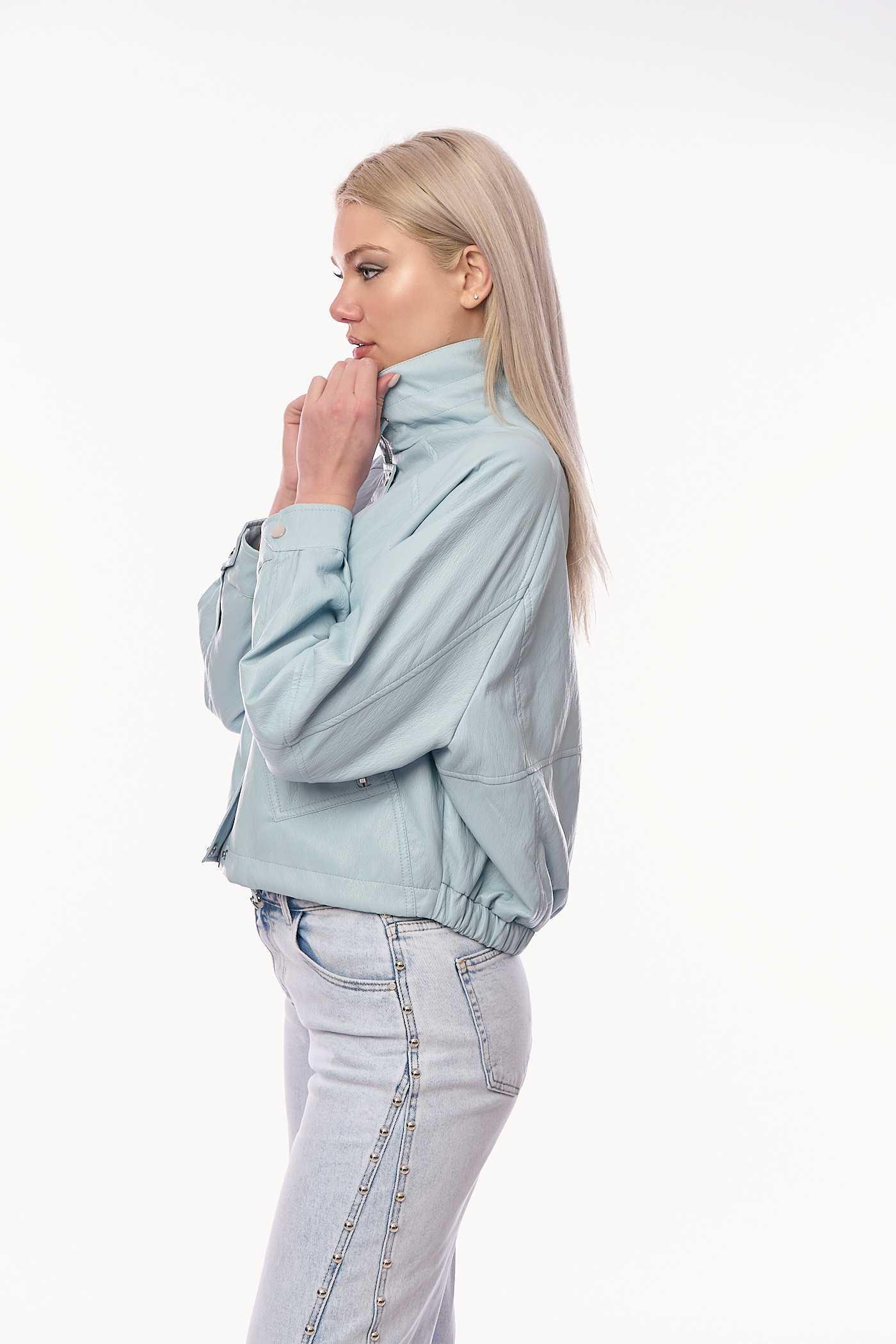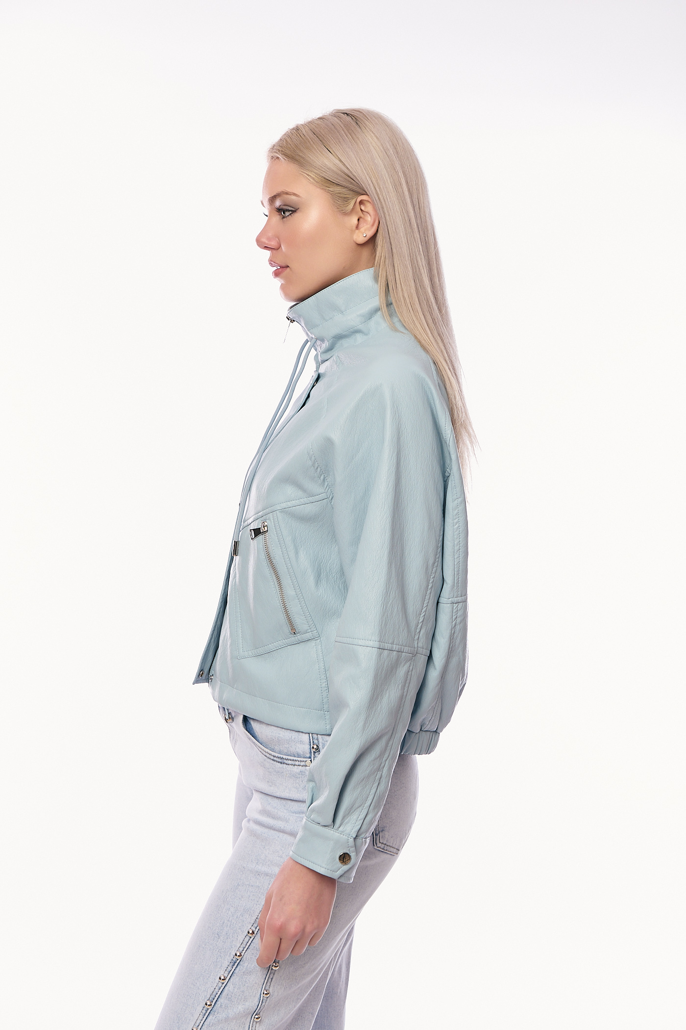 • Γυναικείο Γαλάζιο Bomber Jacket από Οικολογικό Δέρμα με Φερμουάρ, Τσέπες και Λάστιχο στη Μέση-S-5691B