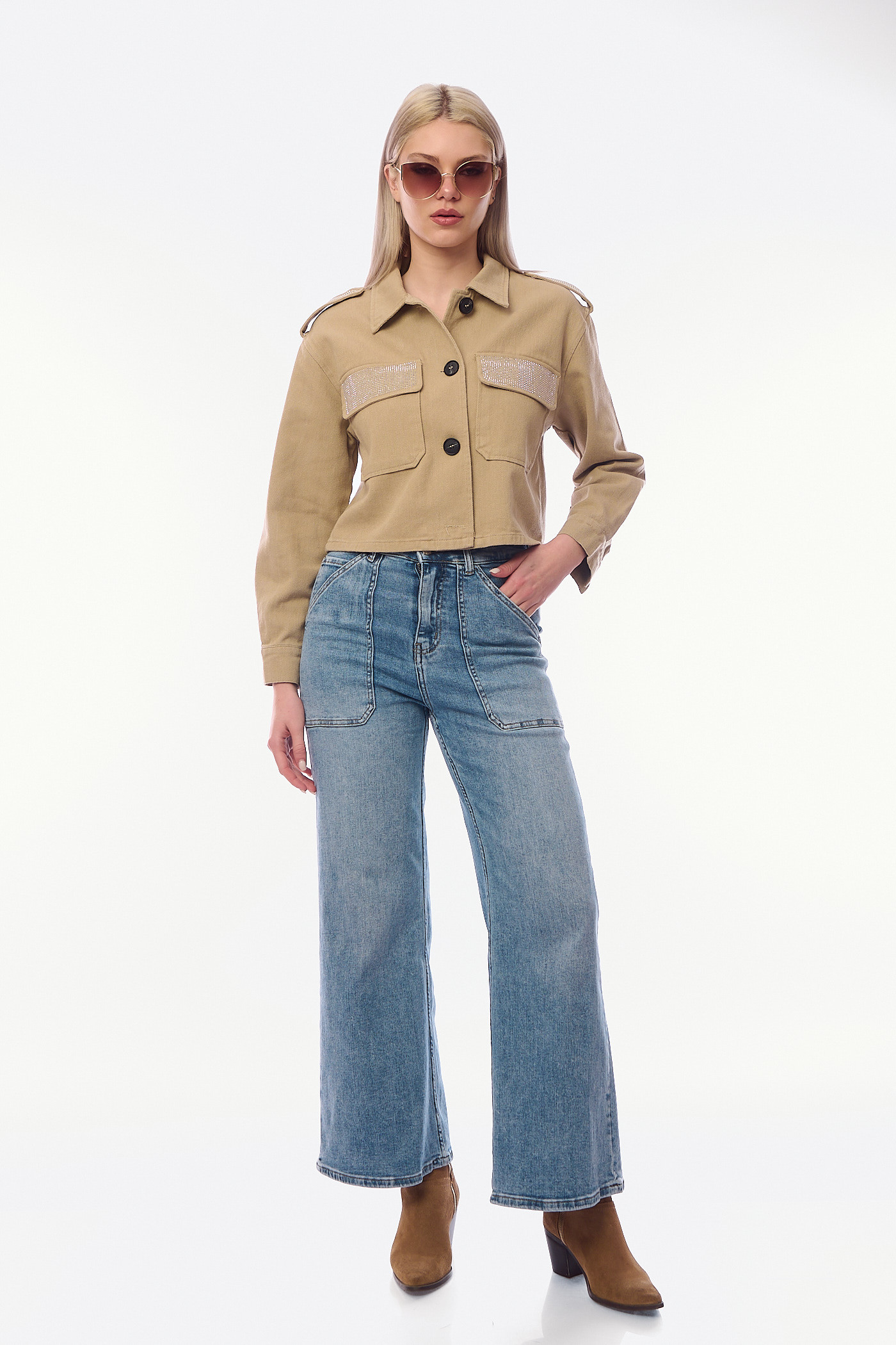 Γυναικεία Πανωφόρια : Γυναικείο Κοντό Τζιν Σακάκι σε Μπεζ Χρώμα με Διακοσμητικά Στρας στις Τσέπες και Επωμίδες-3364