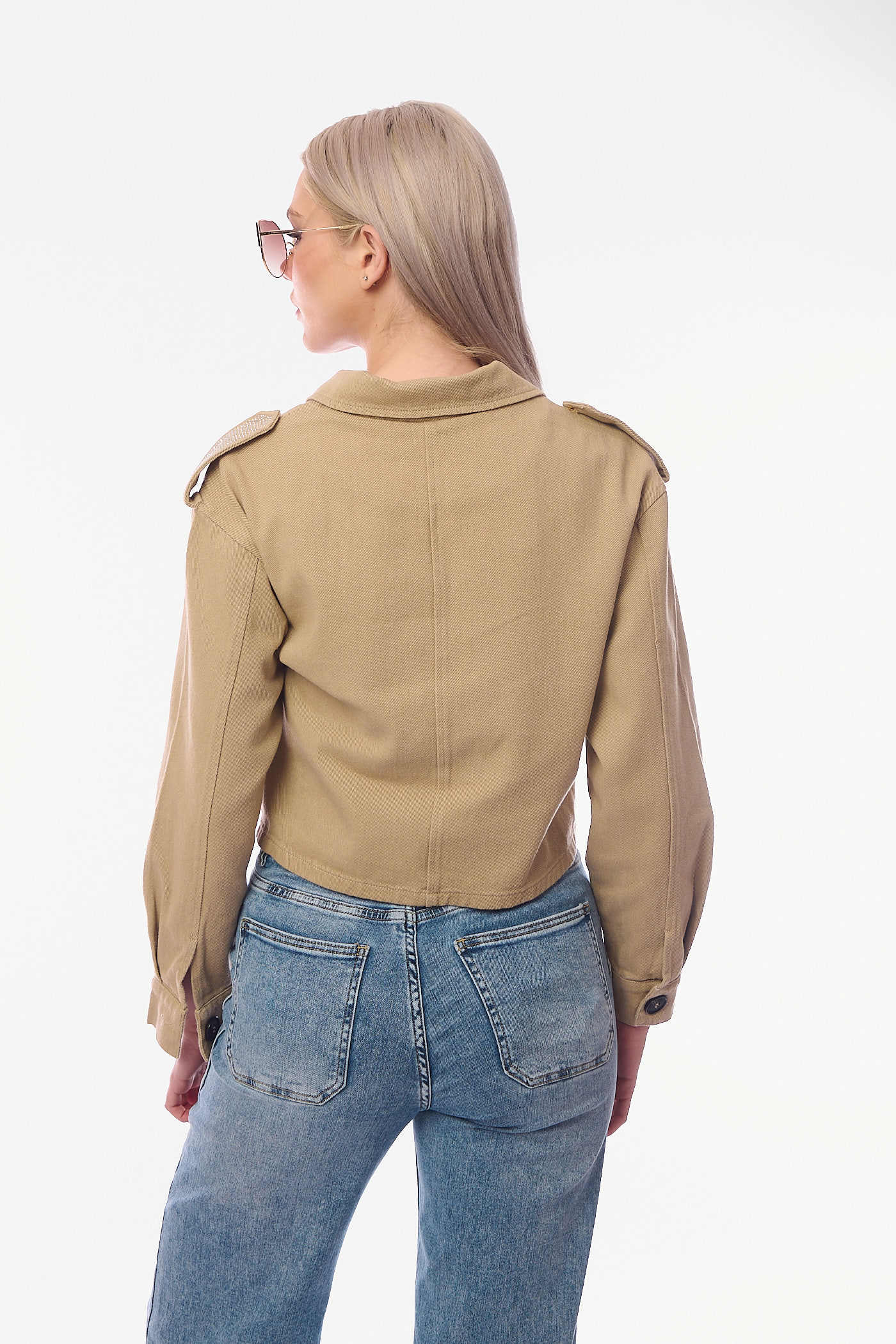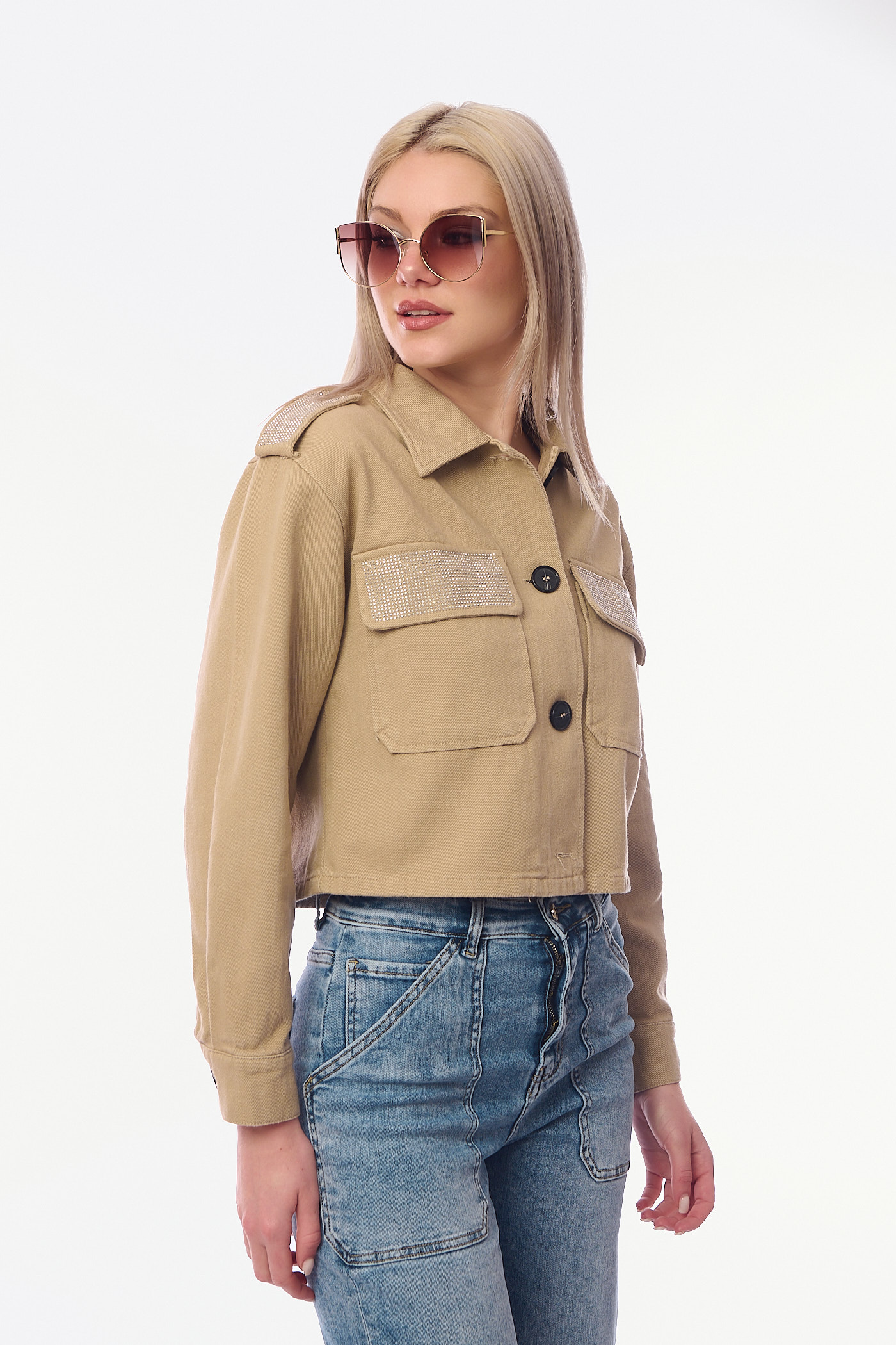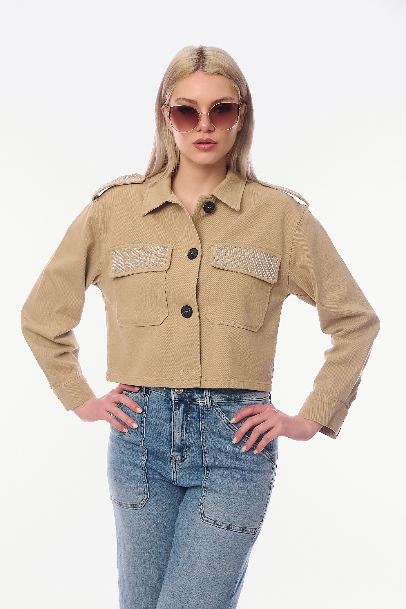 Γυναικείο Κοντό Τζιν Σακάκι σε Μπεζ Χρώμα με Διακοσμητικά Στρας στις Τσέπες και Επωμίδες-3364