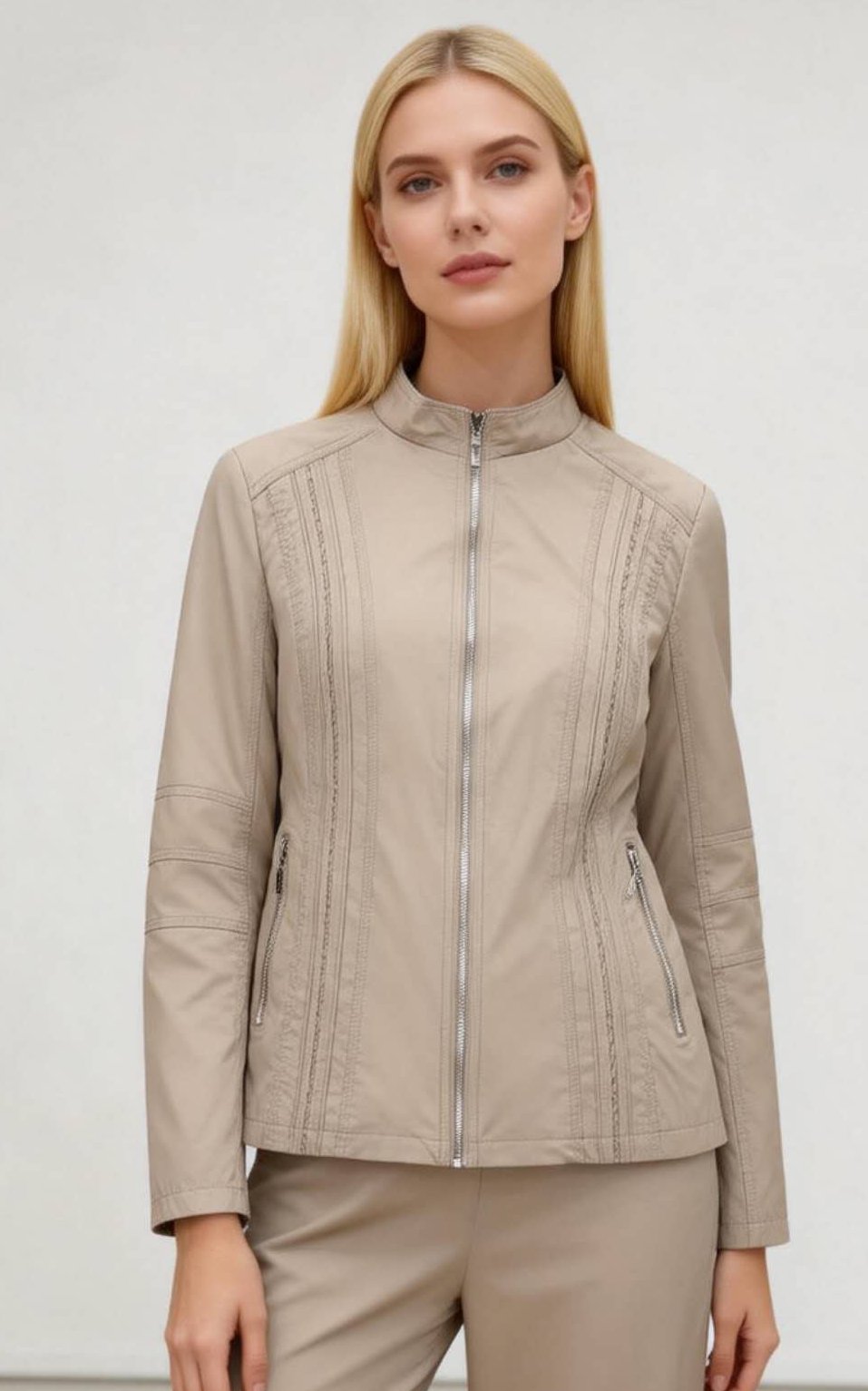 Η μίνιμαλ αισθητική συναντά τον δυναμισμό σε αυτό το κομψό τζάκετ, το οποίο ξεχωρίζει για την άψογη εφαρμογή του και τις κάθετες διακοσμητικές ραφές που επιμηκύνουν τη σιλουέτα, προσφέροντας μια απόλυτα σύγχρονη εμφάνιση. Διαθέτει όρθιο γιακά (mandarin collar) που κλείνει με κεντρικό φερμουάρ, πρακτικές πλαϊνές τσέπες που ασφαλίζουν επίσης με φερμουάρ και ιδιαίτερες οριζόντιες λεπτομέρειες στους βραχίονες, ενώ το υψηλής ποιότητας υλικό του σε γήινη μπεζ απόχρωση το καθιστά το ιδανικό πανωφόρι για τις μεταβατικές περιόδους. Συνδυάζεται μοναδικά με υφασμάτινο παντελόνι στην ίδια απόχρωση για ένα εντυπωσιακό μονοχρωματικό look ή με το αγαπημένο σας τζιν για μια πιο casual chic εμφάνιση που αποπνέει αυτοπεποίθηση.