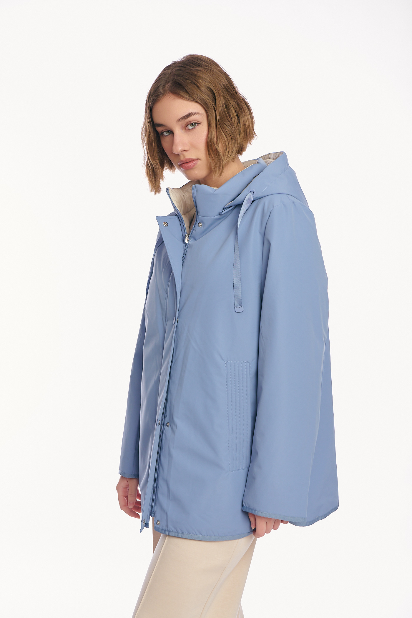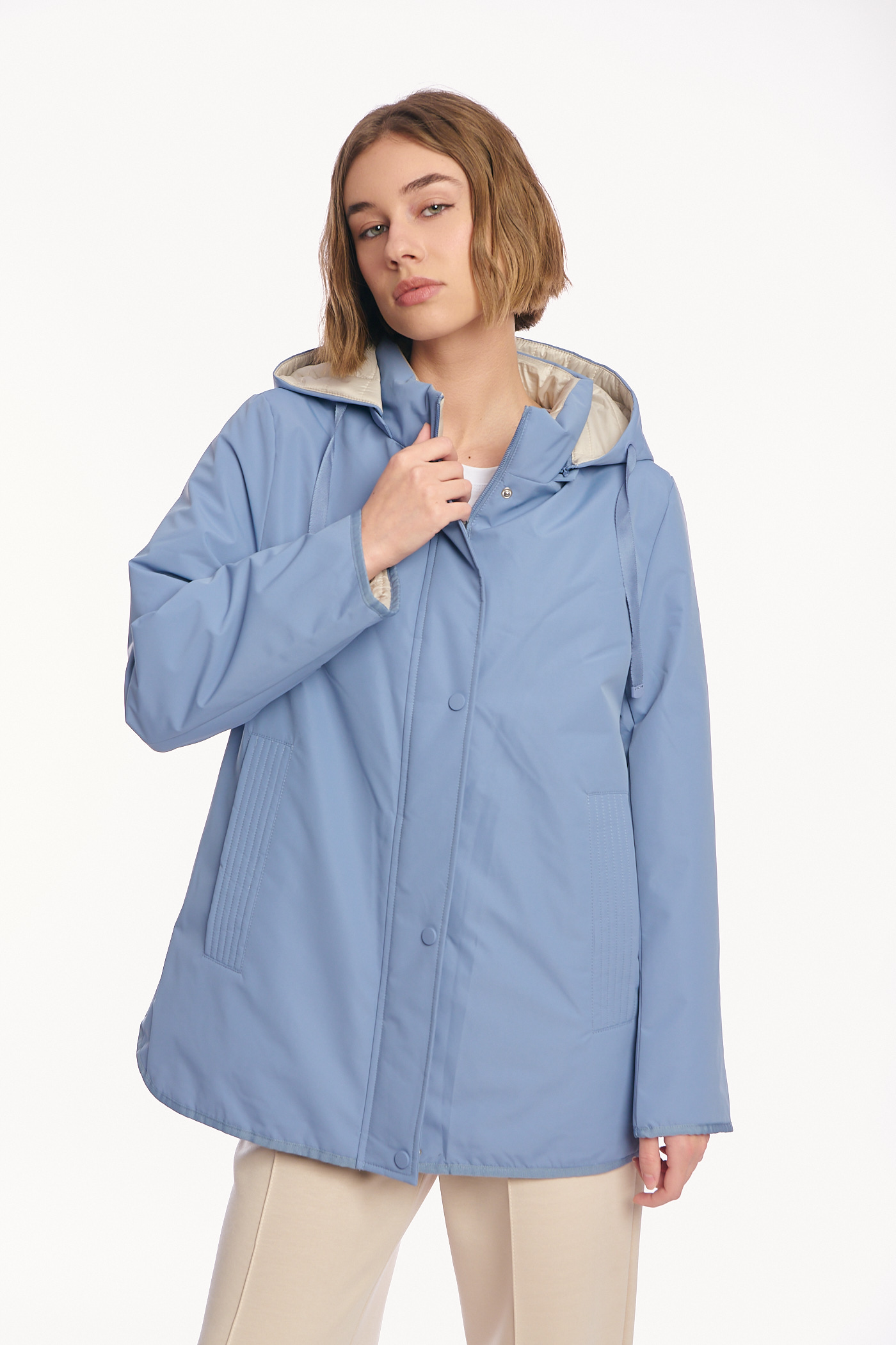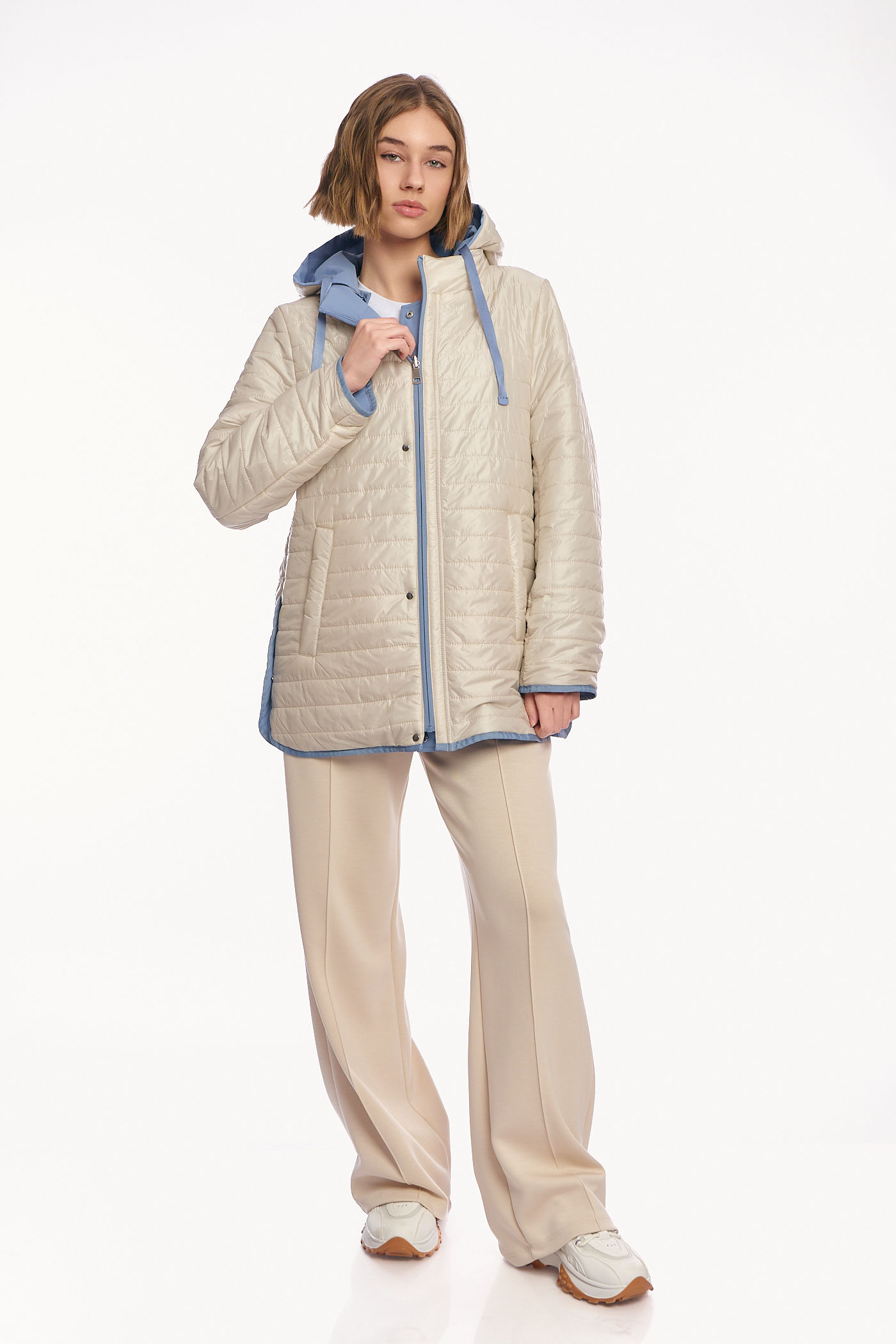 Γυναικείο Μπουφάν Διπλής Όψης με Κουκούλα και Συνδυασμό Υφών σε Σιέλ-Μπεζ-AB-879-8