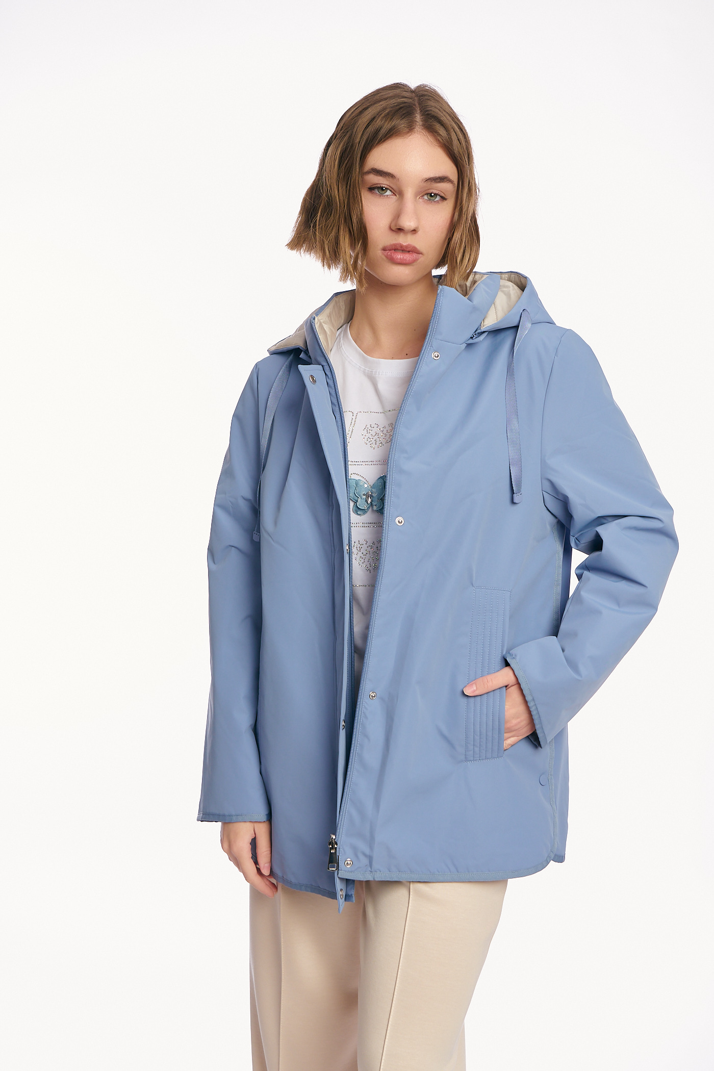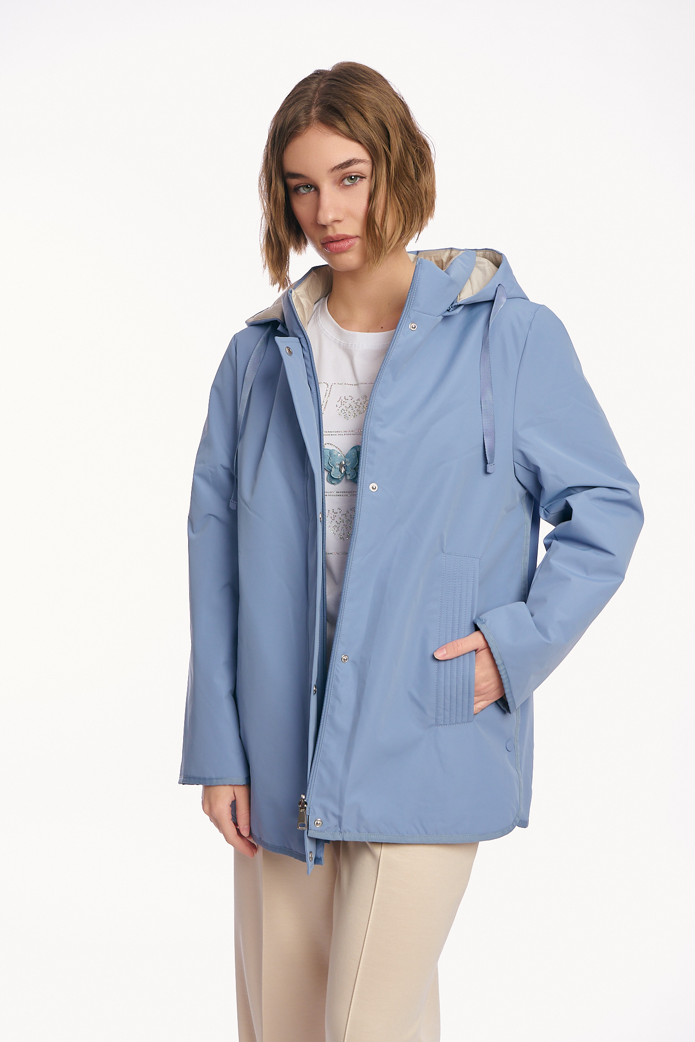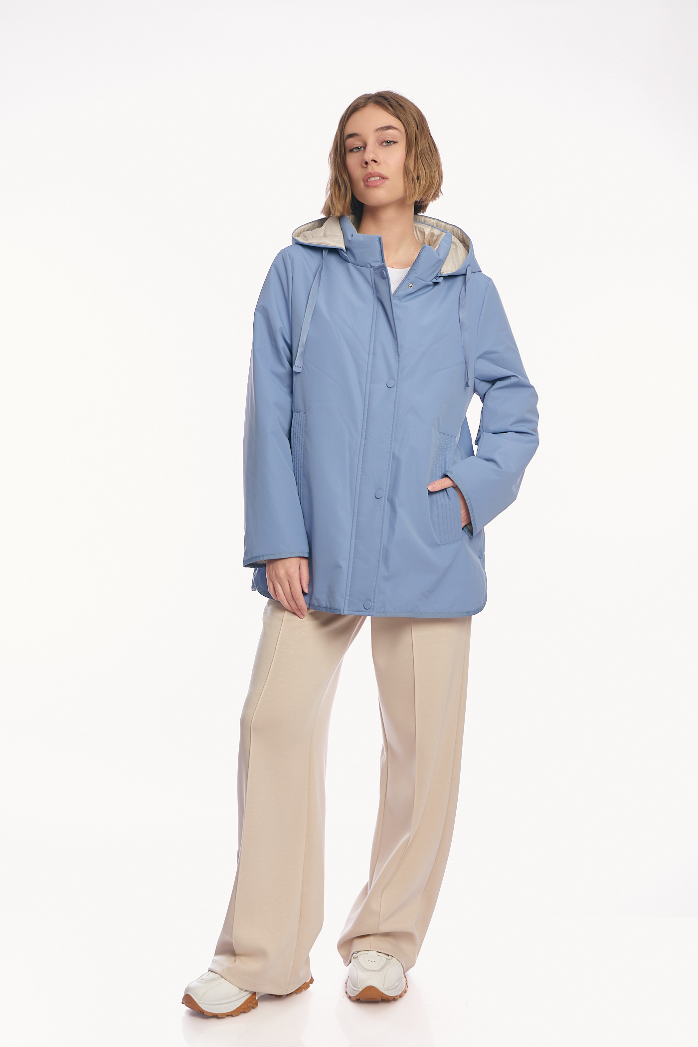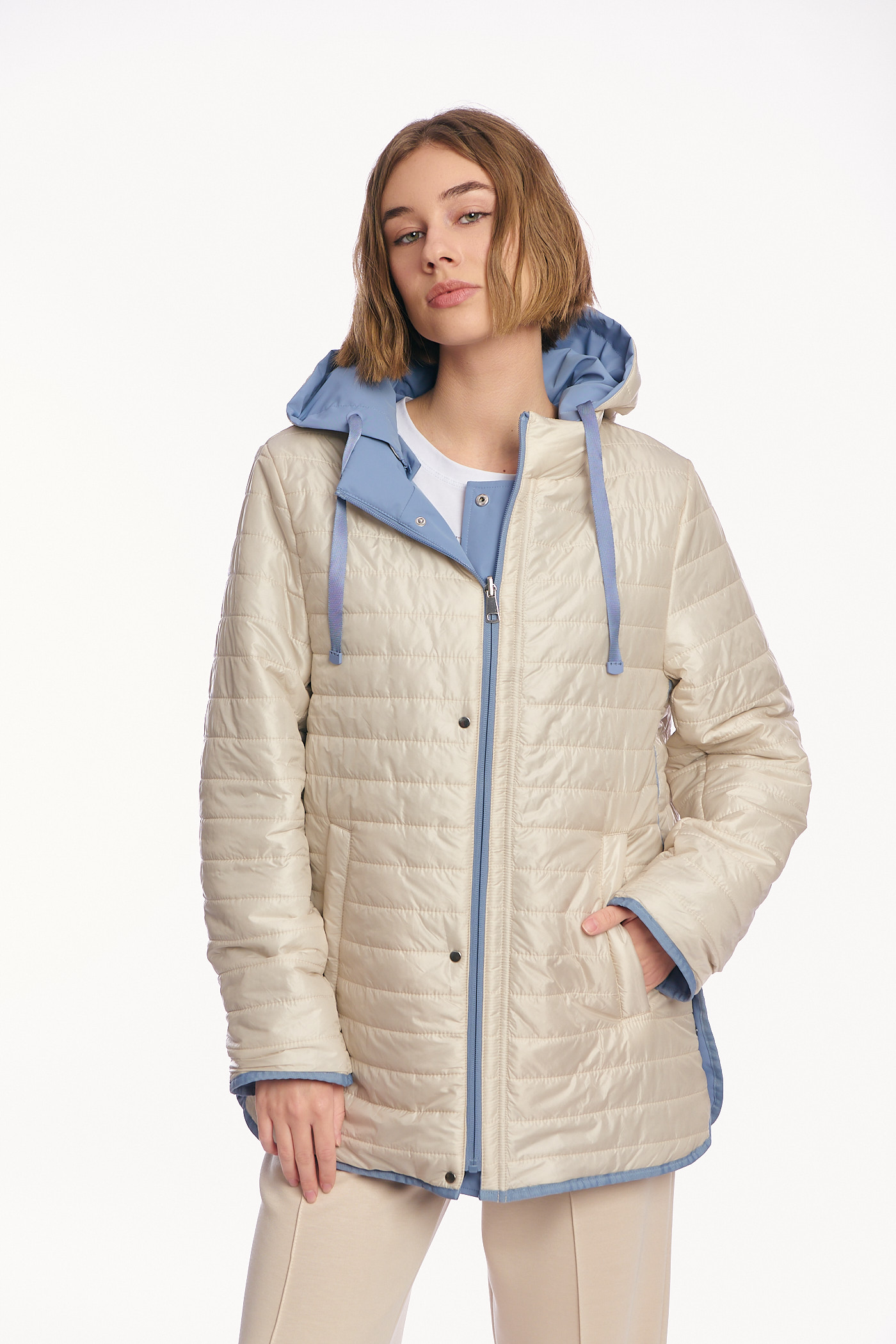 Γυναικείο Μπουφάν Διπλής Όψης με Κουκούλα και Συνδυασμό Υφών σε Σιέλ-Μπεζ-AB-879-8