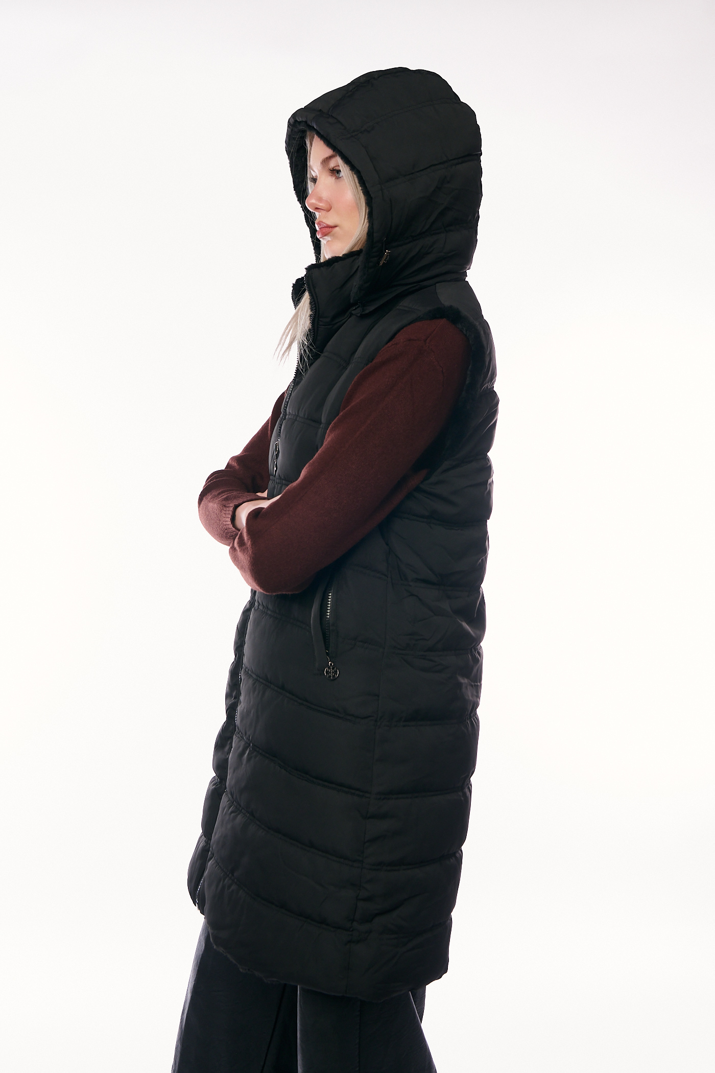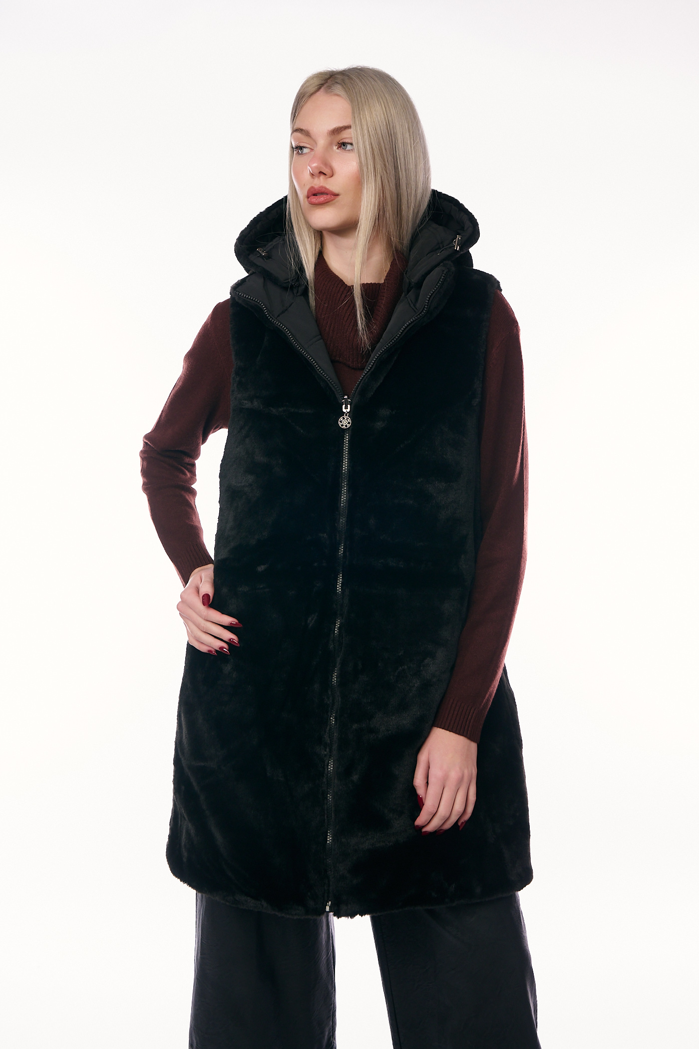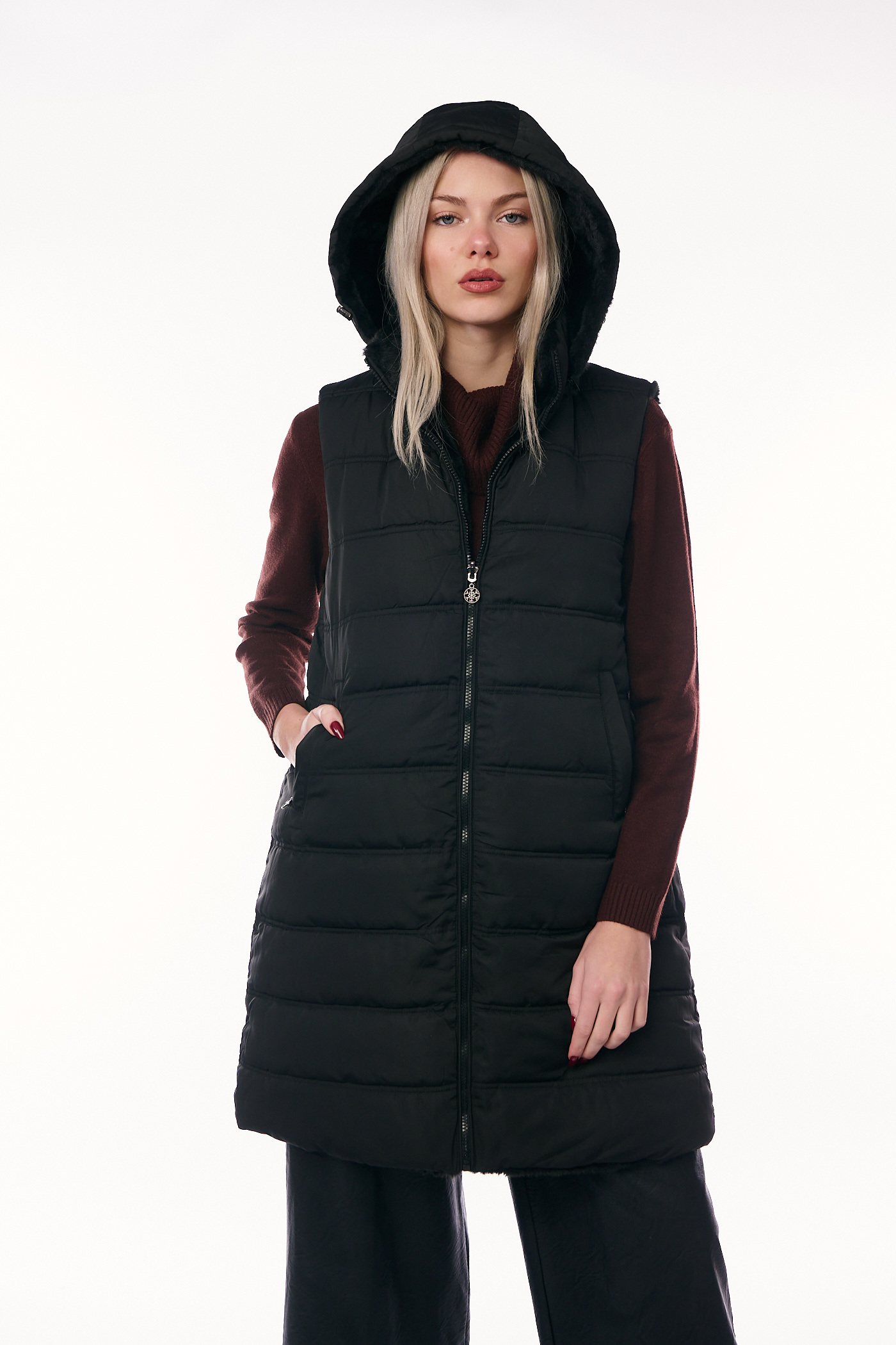 Αυτό το πολυμορφικό και πρακτικό μακρύ αμάνικο μπουφάν (γιλέκο) ξεχωρίζει καθώς είναι διπλής όψης, προσφέροντας δύο διαφορετικές στυλιστικές επιλογές σε ένα ρούχο. Η μία πλευρά, όπως φαίνεται στην εικόνα, διαθέτει κλασικό καπιτονέ σχέδιο με οριζόντιες ραφές σε διαχρονικό μαύρο χρώμα, ενώ η δεύτερη όψη προσφέρει μια γούνινη υφή για εναλλακτικές εμφανίσεις. Το γιλέκο έχει άνετη, ίσια γραμμή και μήκος που καλύπτει τους γοφούς, είναι εξοπλισμένο με ενσωματωμένη ζεστή κουκούλα, κλείνει με κεντρικό φερμουάρ και διαθέτει λειτουργικές πλάγιες τσέπες.