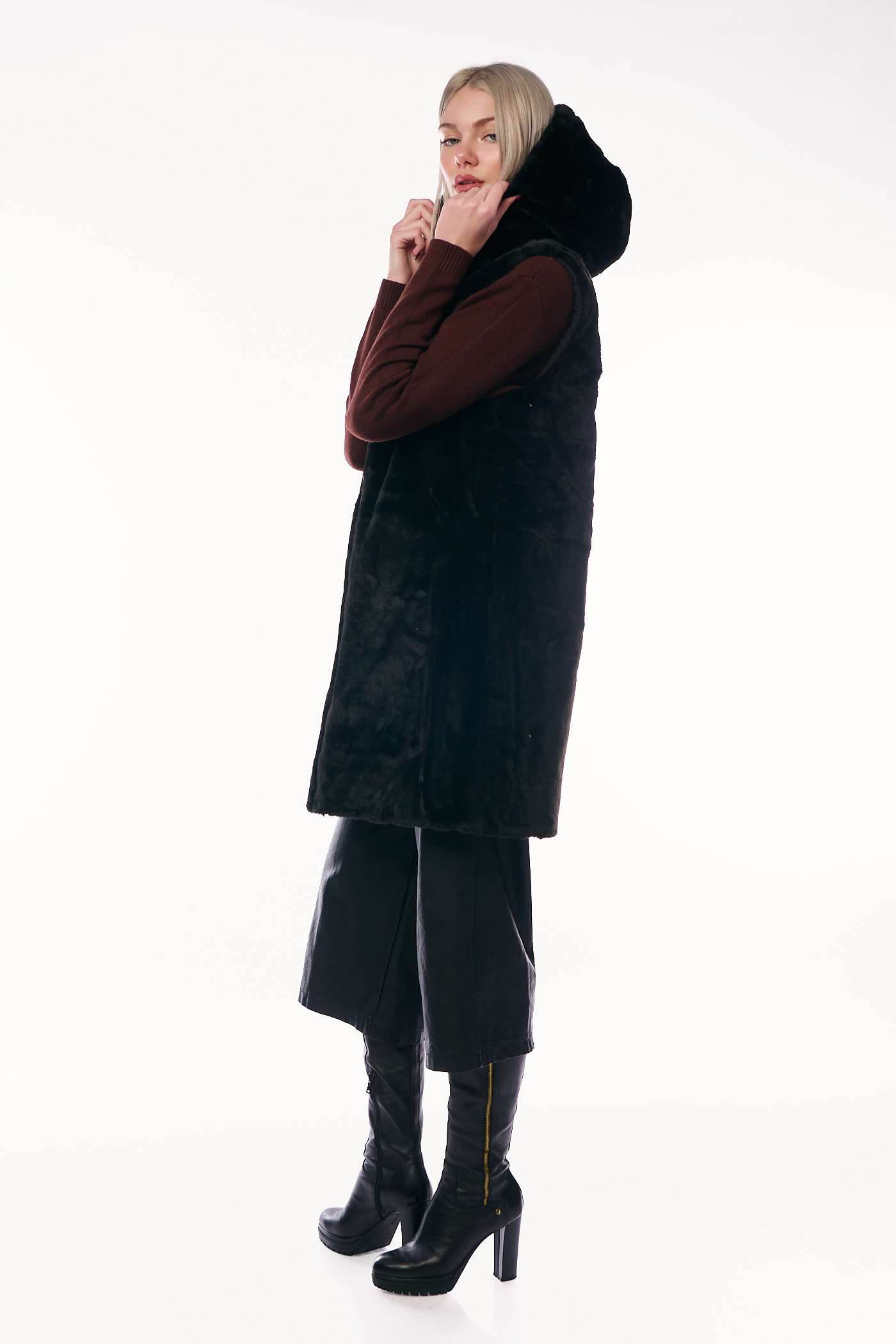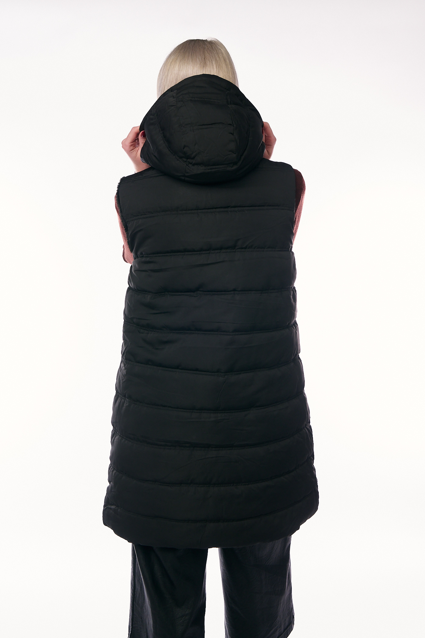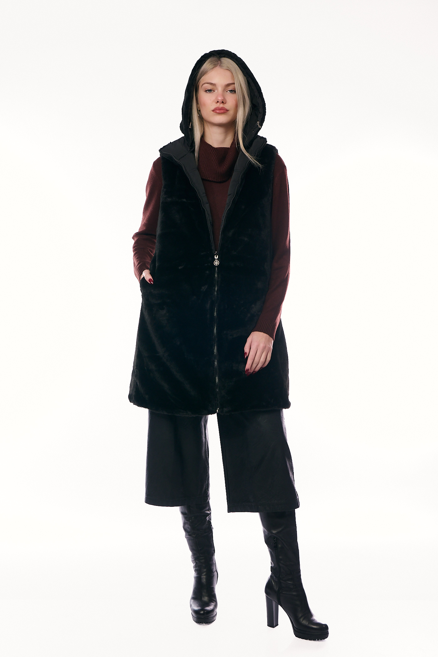 Αυτό το πολυμορφικό και πρακτικό μακρύ αμάνικο μπουφάν (γιλέκο) ξεχωρίζει καθώς είναι διπλής όψης, προσφέροντας δύο διαφορετικές στυλιστικές επιλογές σε ένα ρούχο. Η μία πλευρά, όπως φαίνεται στην εικόνα, διαθέτει κλασικό καπιτονέ σχέδιο με οριζόντιες ραφές σε διαχρονικό μαύρο χρώμα, ενώ η δεύτερη όψη προσφέρει μια γούνινη υφή για εναλλακτικές εμφανίσεις. Το γιλέκο έχει άνετη, ίσια γραμμή και μήκος που καλύπτει τους γοφούς, είναι εξοπλισμένο με ενσωματωμένη ζεστή κουκούλα, κλείνει με κεντρικό φερμουάρ και διαθέτει λειτουργικές πλάγιες τσέπες.