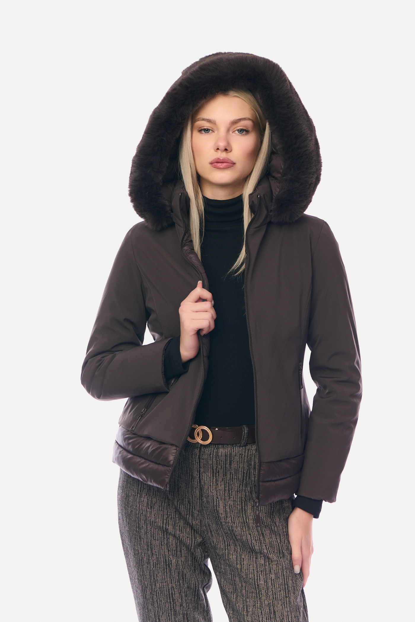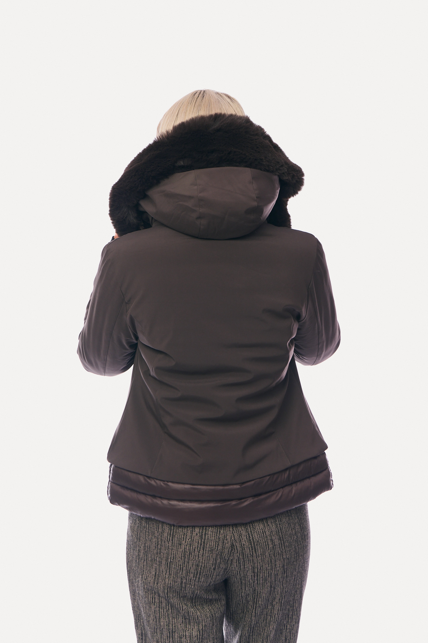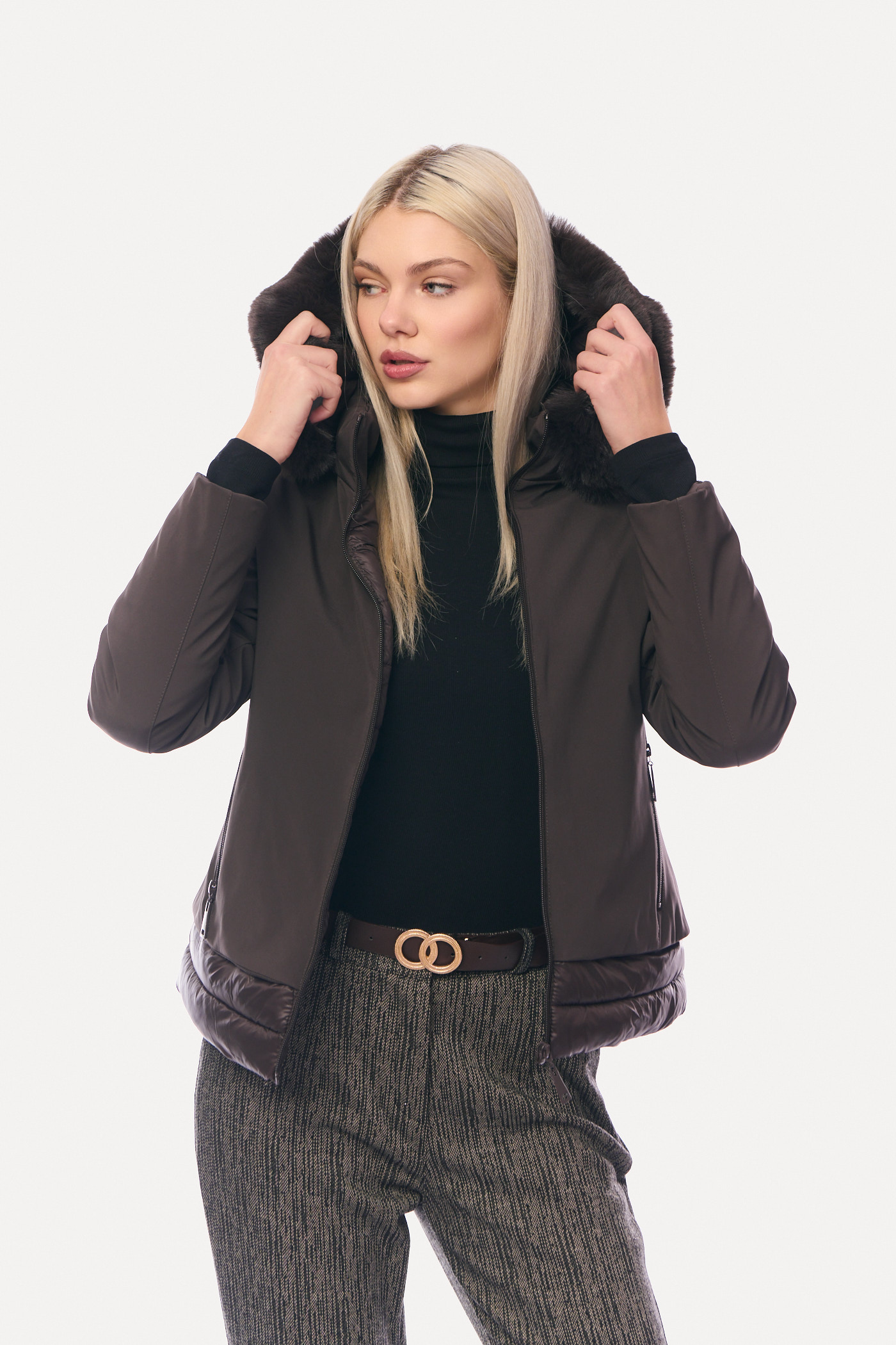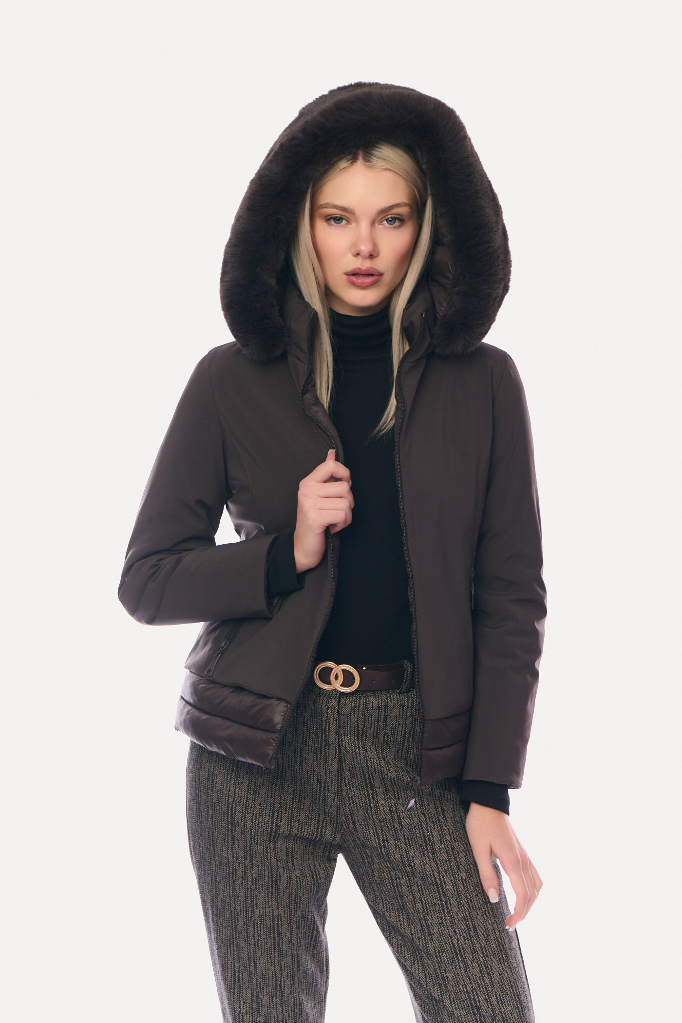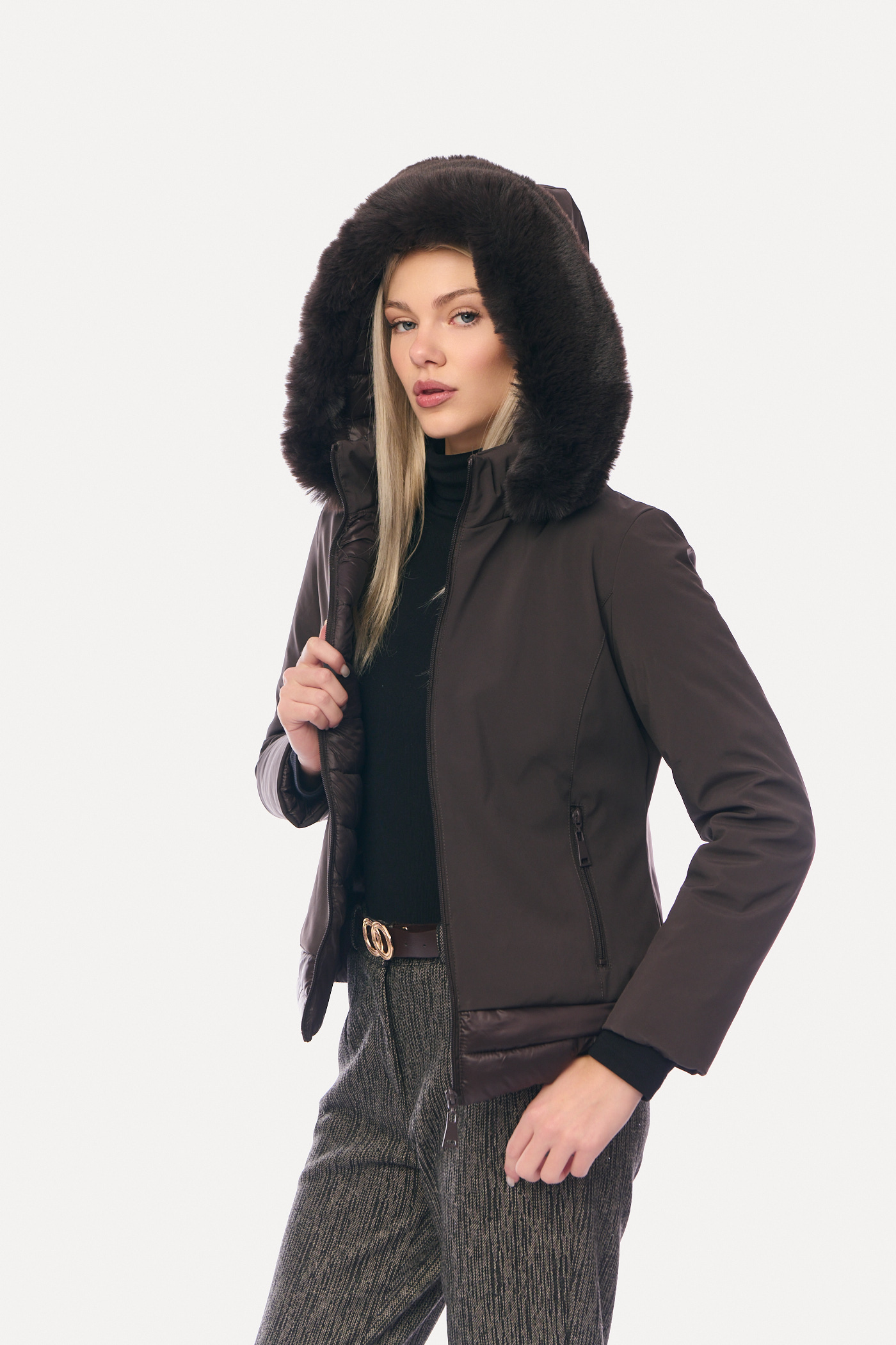 Μπουφάν Κοντό Διπλής Όψης με Αποσπώμενη Γούνα & Κουκούλα Καφέ-8158