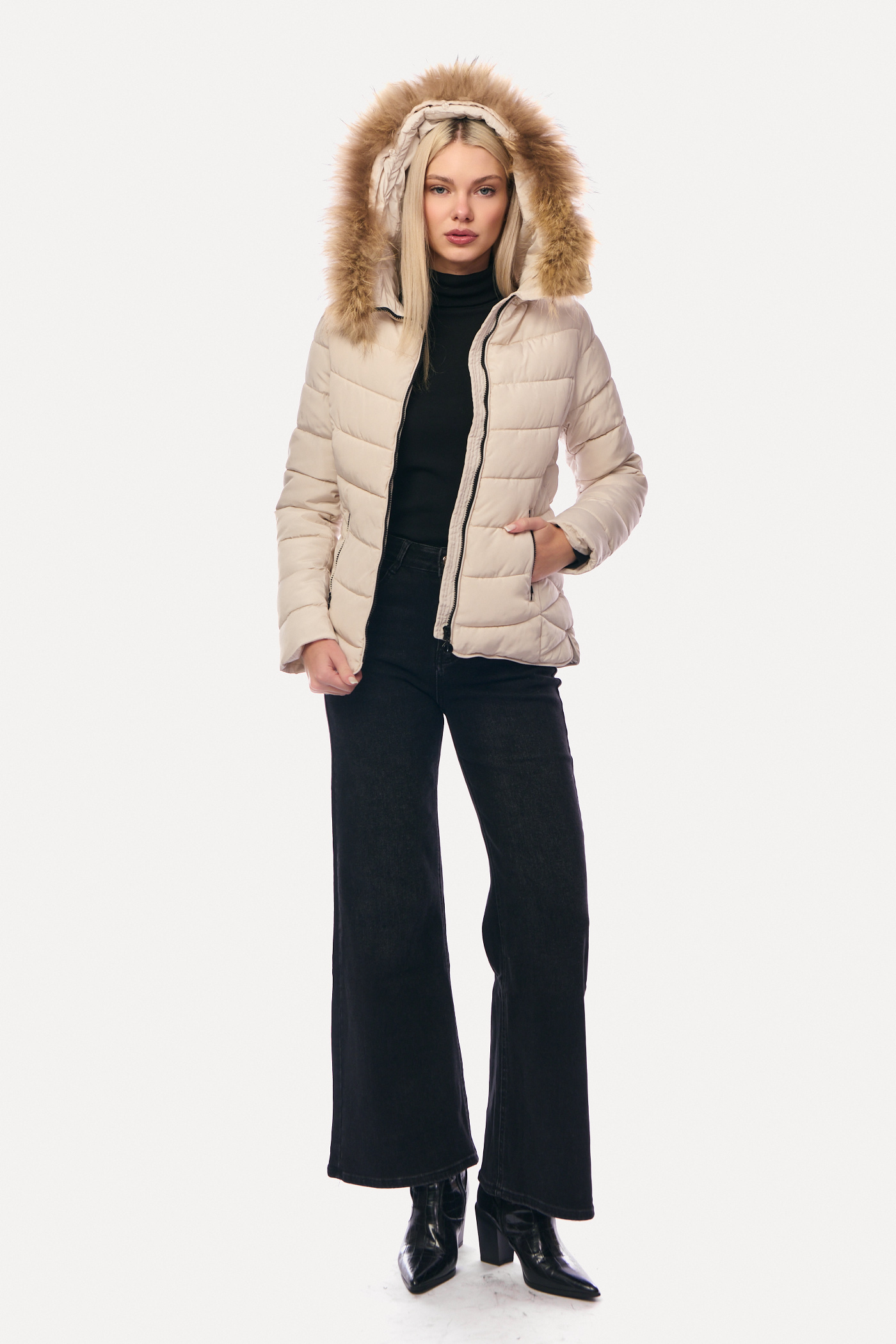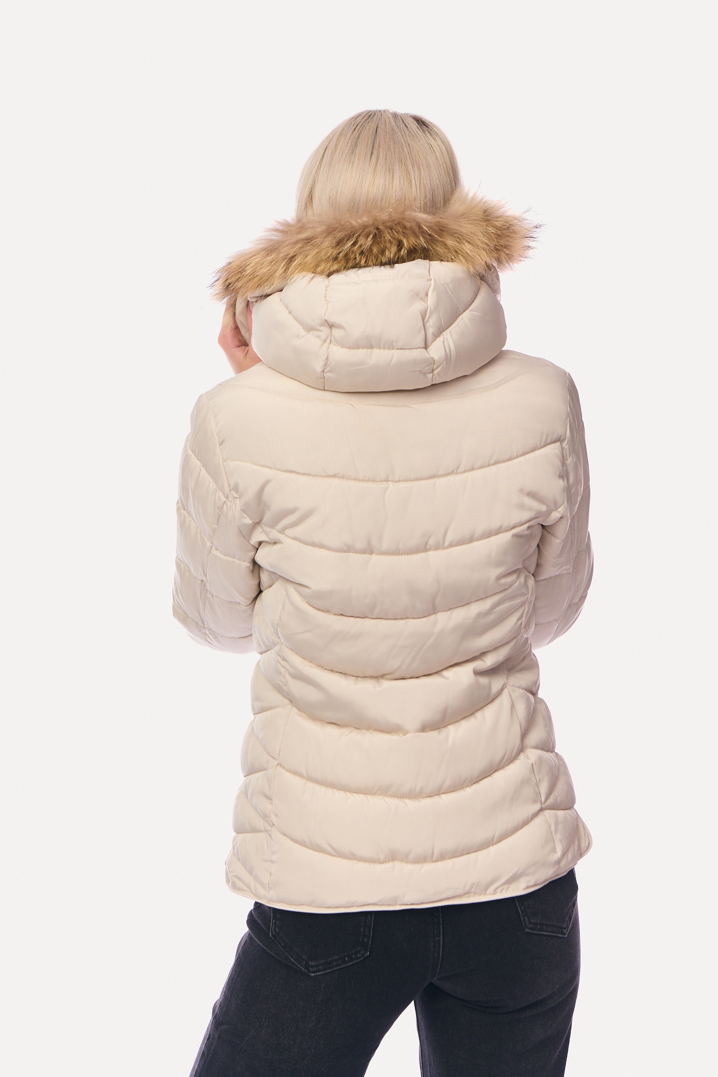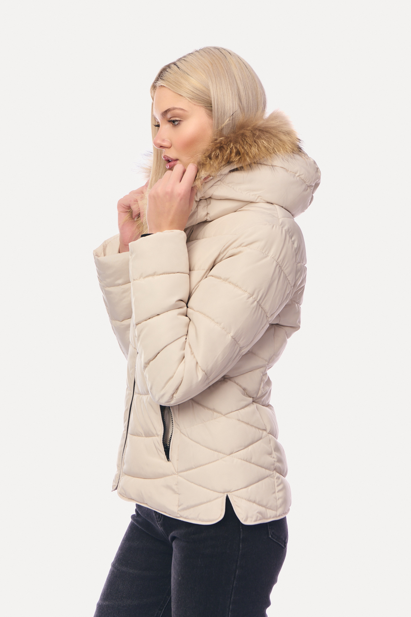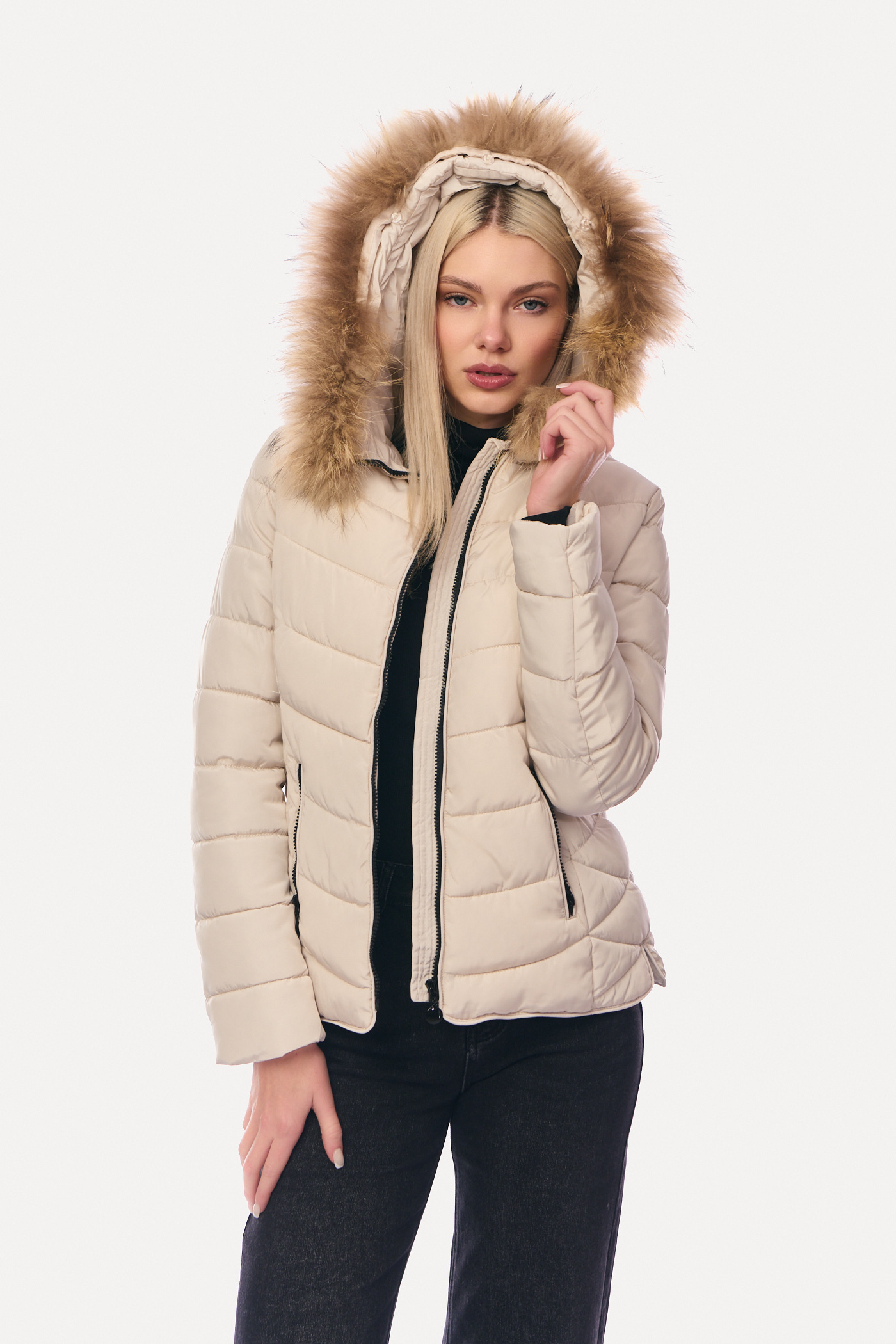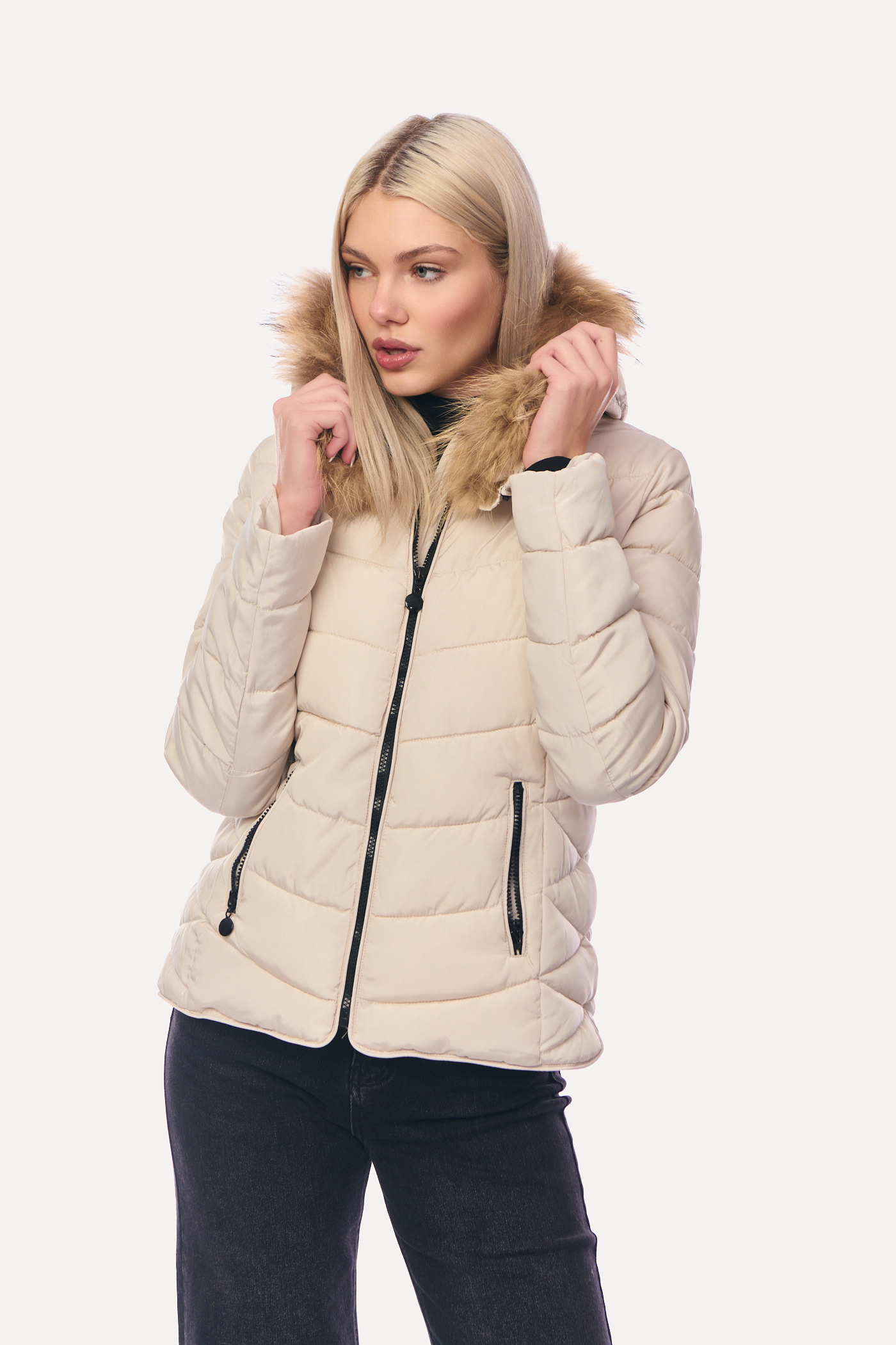 Μπουφάν Puffer Κοντό με Αποσπώμενη Γούνα & Καπιτονέ Γάζωμα Mπεζ-6627
