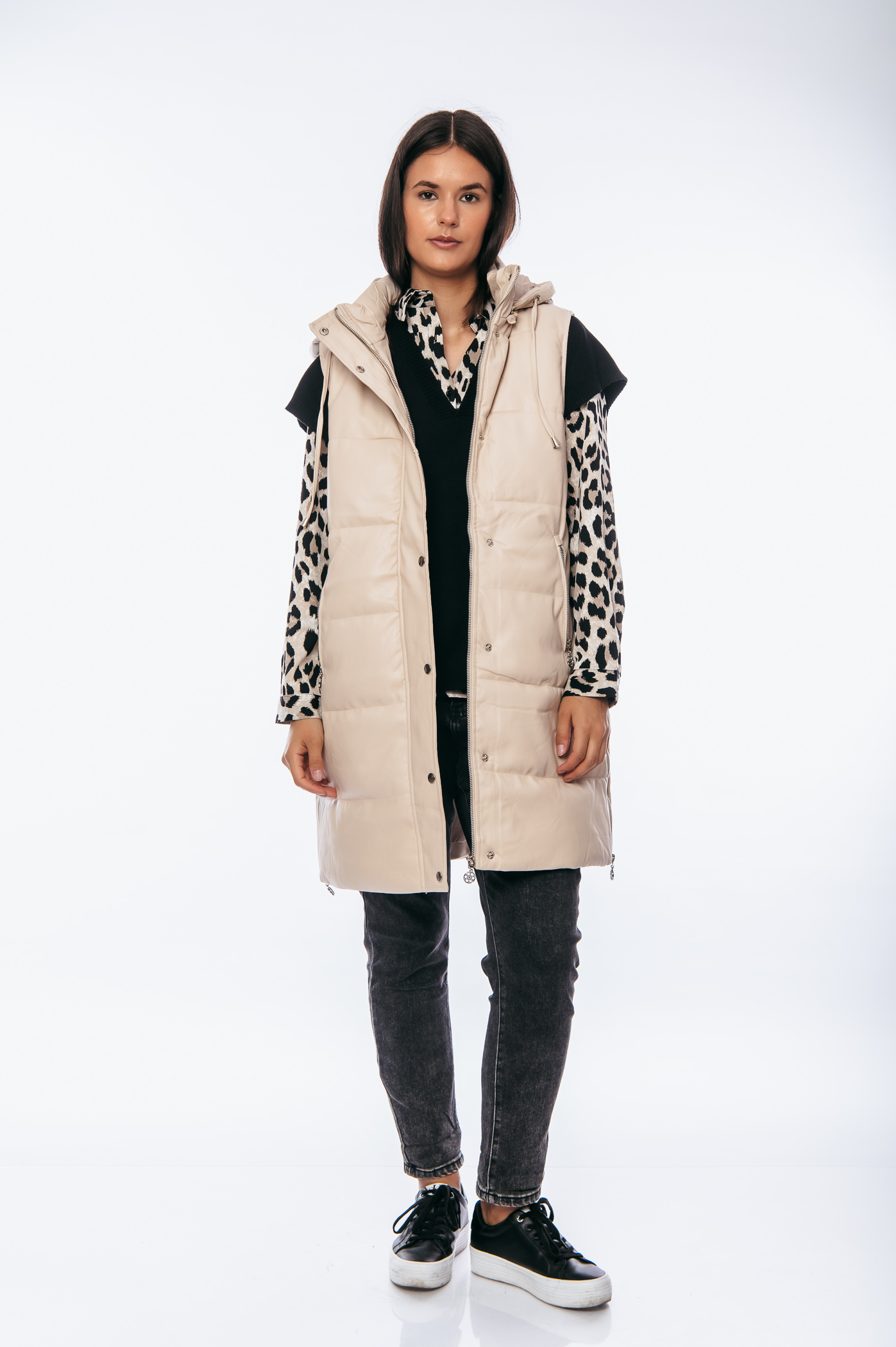 Αμάνικο τζάκετ δερματίνι μακρύ με τσέπες,κουμπιά και φερμουάρ και αποσπώμενη κουκούλα με κορδόνια.