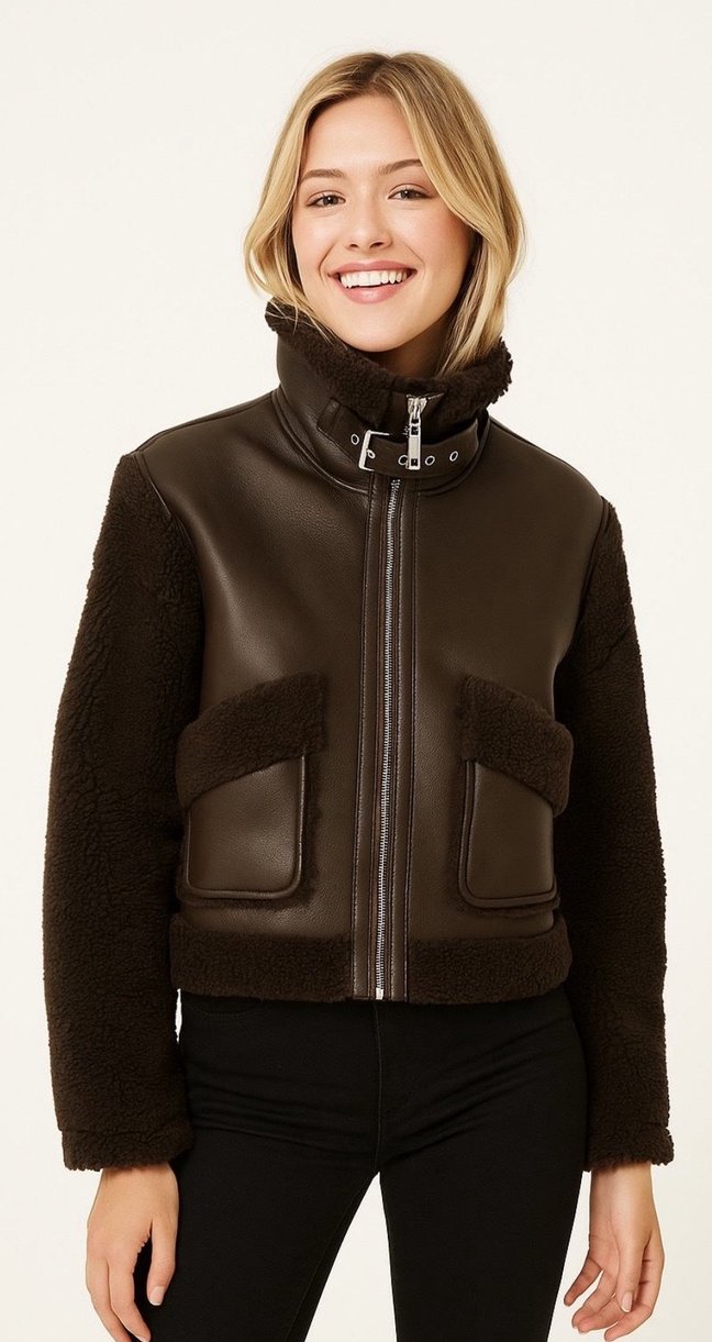 Είναι ένα μοντέρνο και ζεστό cropped μπουφάν, που συνδυάζει την εμφάνιση σκούρου καφέ δερματίνης στο σώμα με χνουδωτό ύφασμα (sherpa/teddy fabric) στα μανίκια, το γιακά και τα τελειώματα. Διαθέτει ψηλό γιακά με αγκράφα, φερμουάρ σε ασημί τόνο και δύο τετράγωνες τσέπες μπροστά. Ιδανικό για φθινοπωρινές και χειμωνιάτικες εμφανίσεις.
