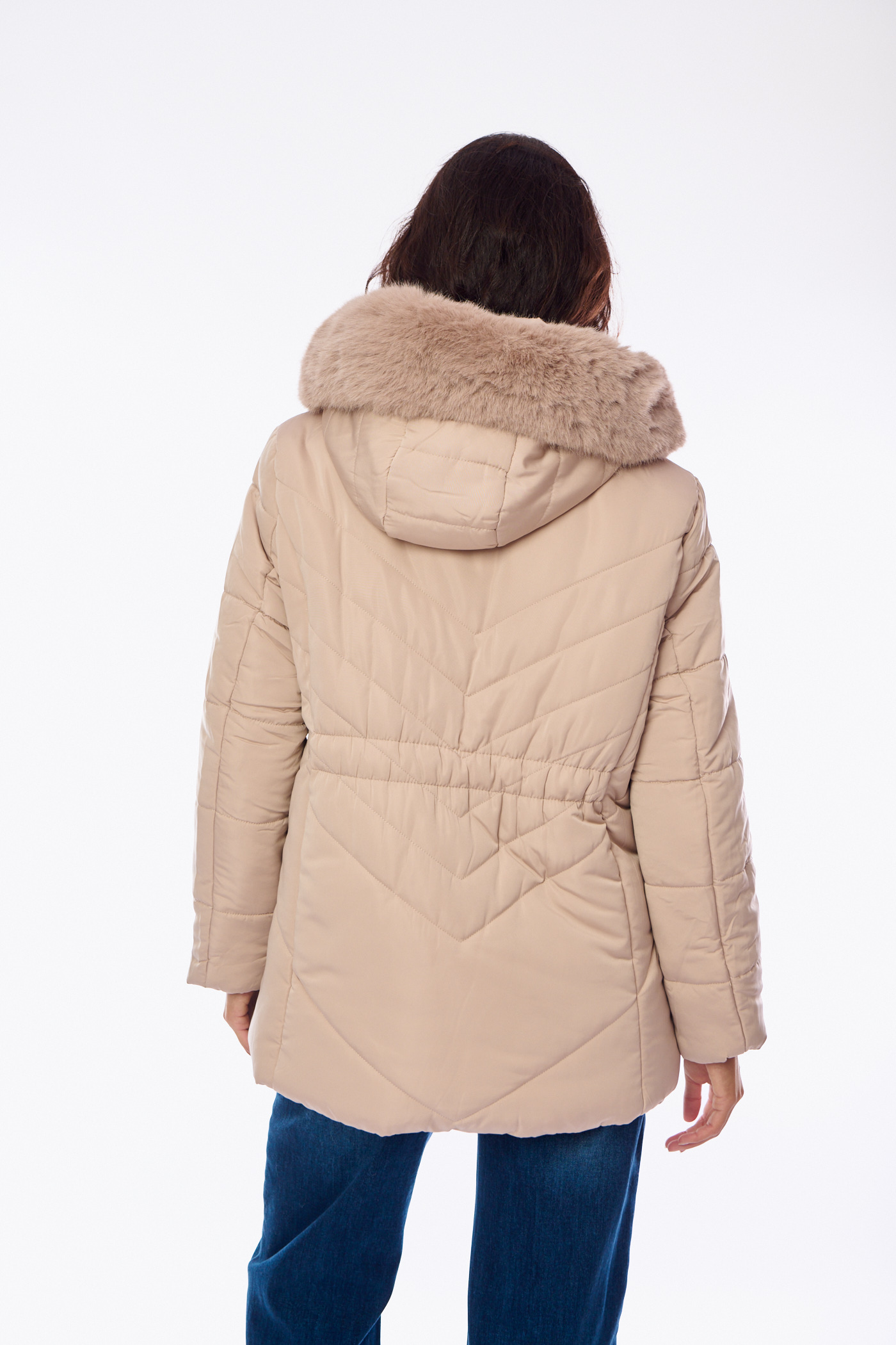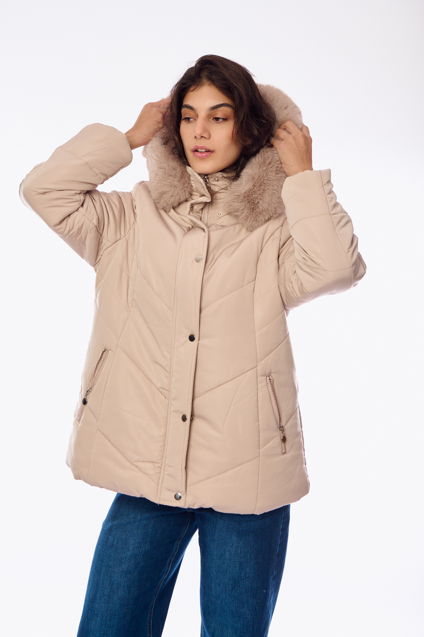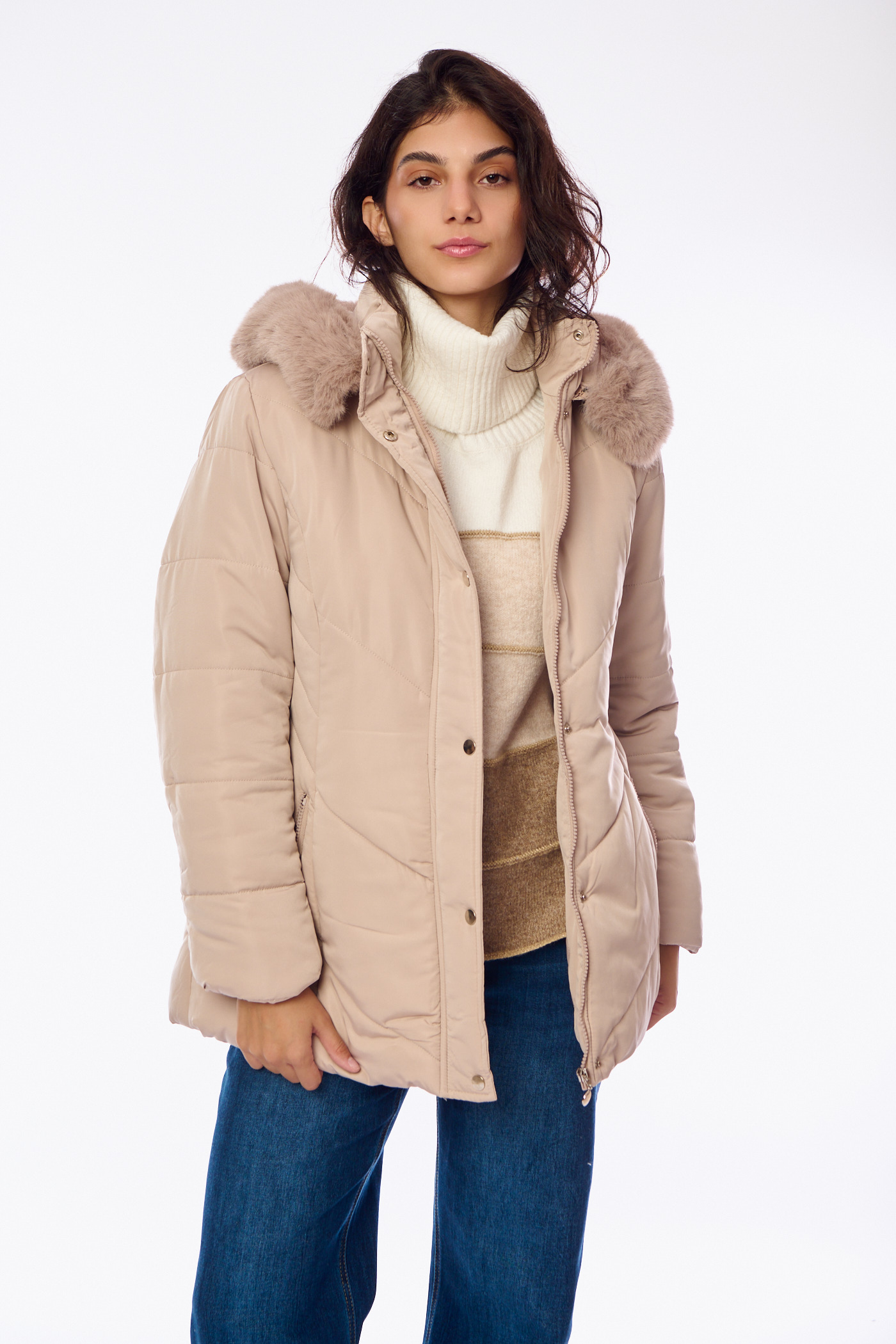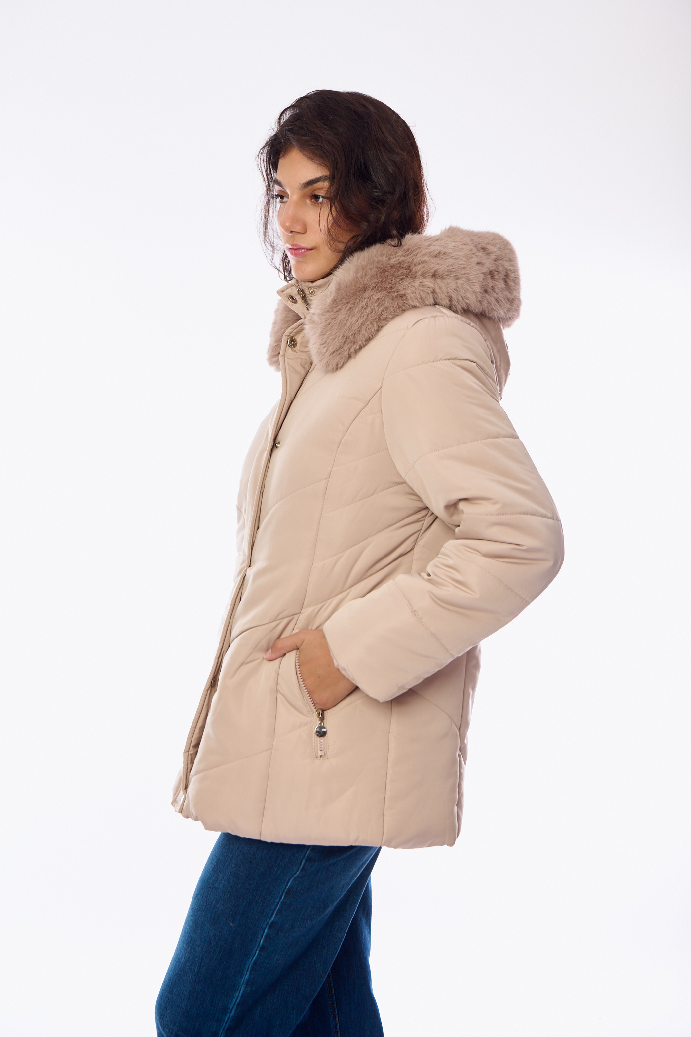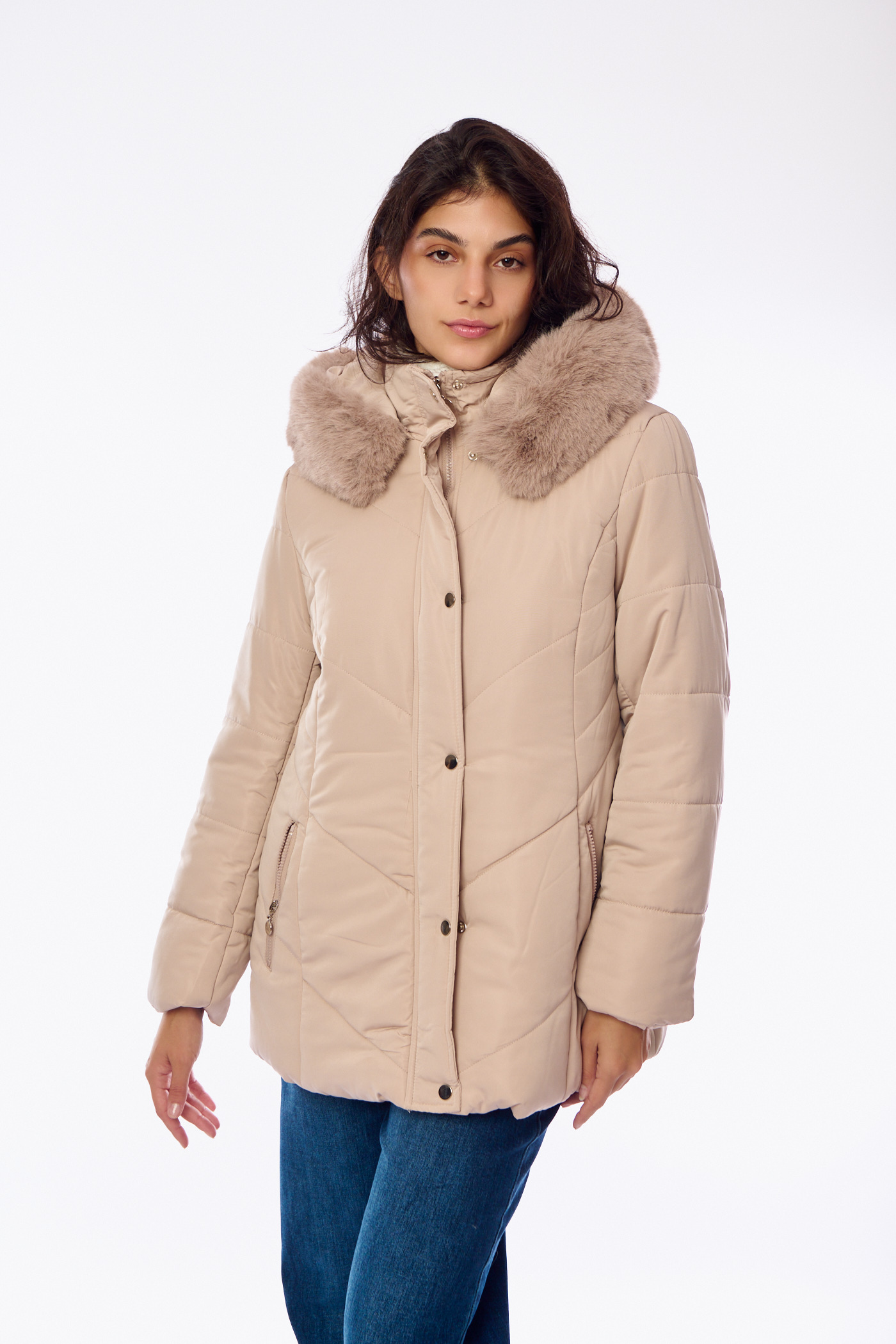 Κοντό Καπιτονέ Μπουφάν με Μεγάλη Κουκούλα Γούνας Μπεζ-A2427