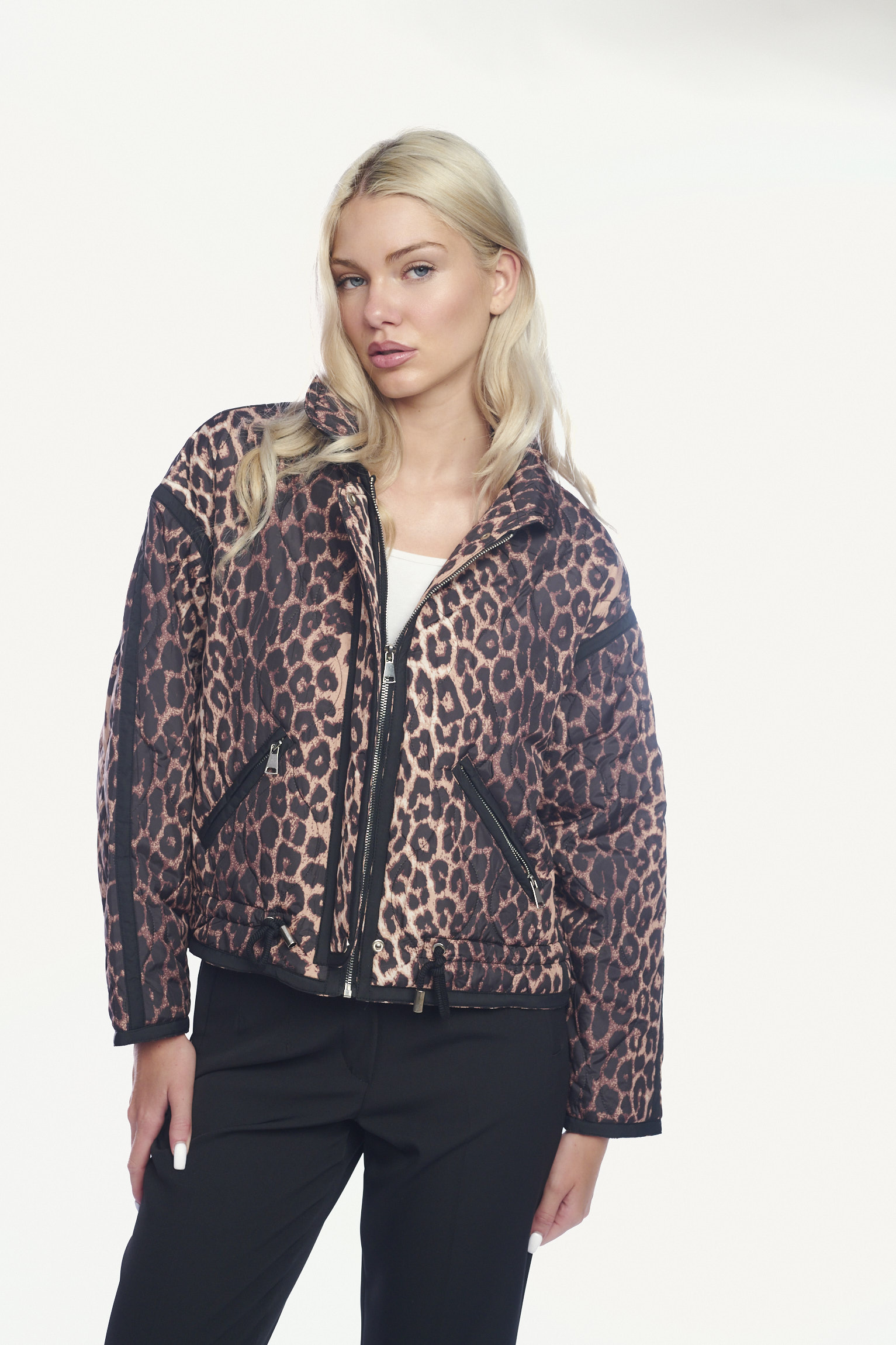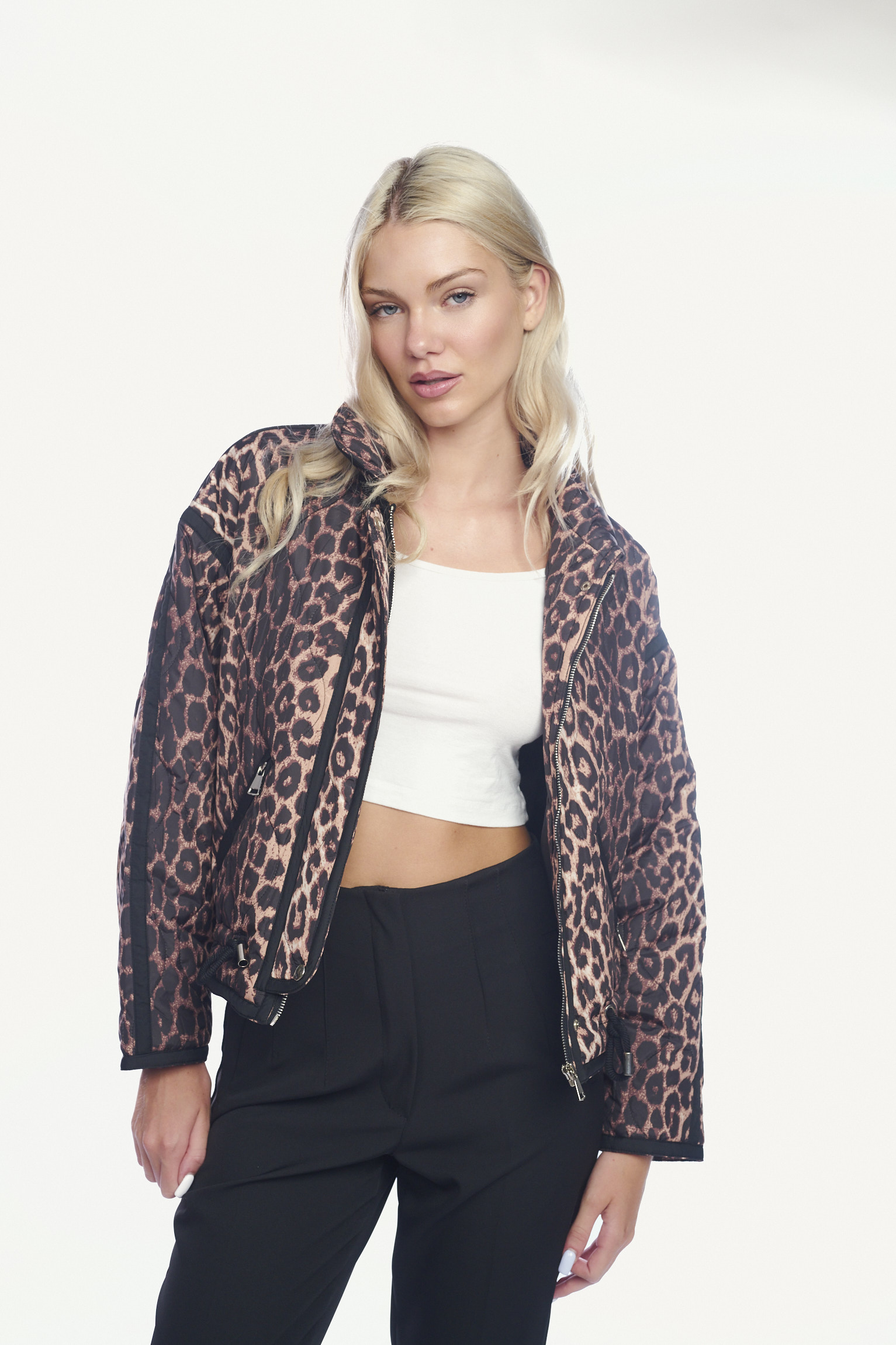 Αναβαθμίστε το στυλ σας με αυτό το εντυπωσιακό κοντό μπουφάν σε λεοπάρ print, ιδανικό για να προσθέσετε μια τολμηρή πινελιά σε κάθε σας εμφάνιση. Η καπιτονέ υφή του προσφέρει ζεστασιά και μοντέρνα αισθητική, ενώ το μήκος του το καθιστά ιδανικό για layering.
