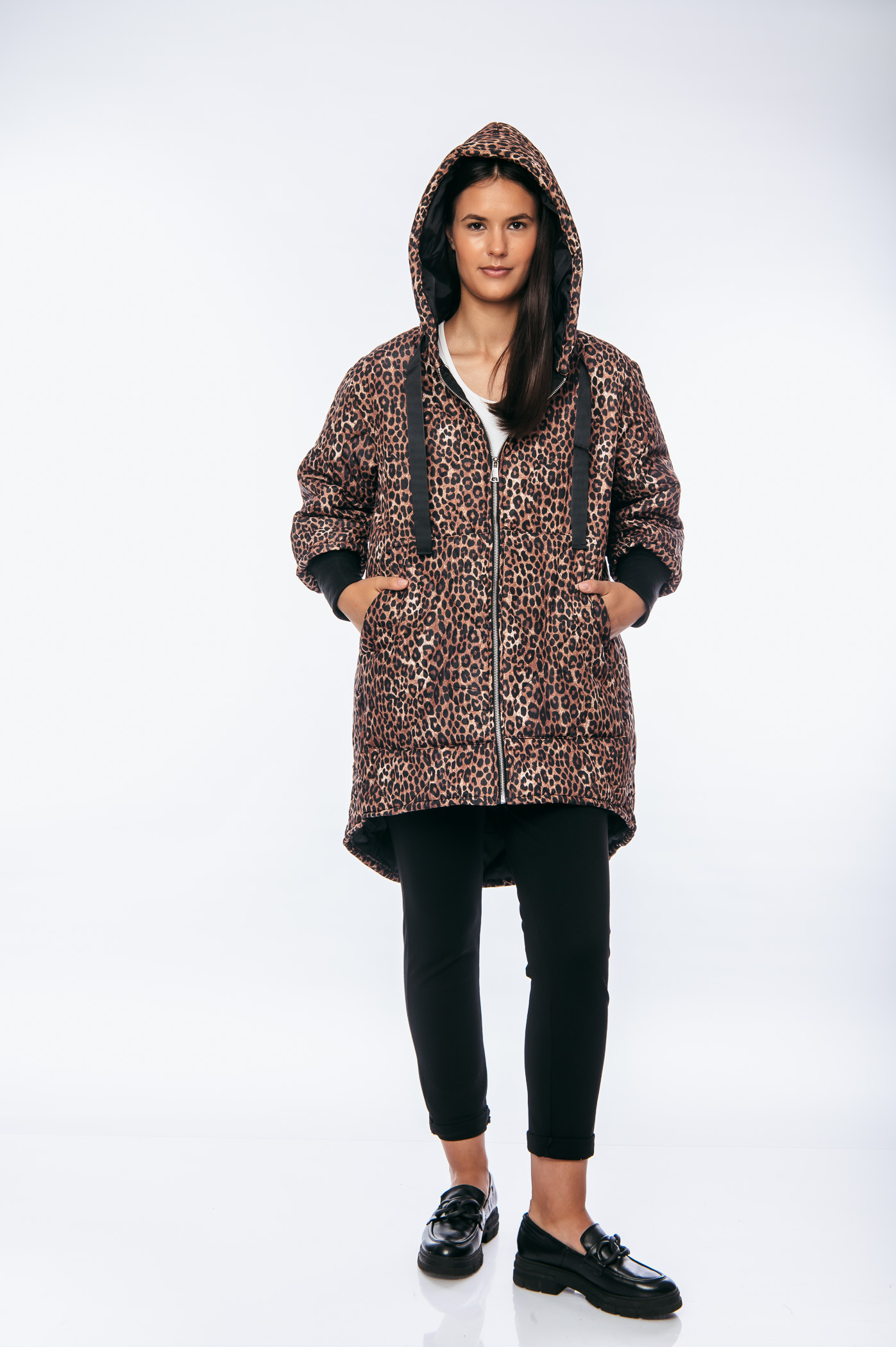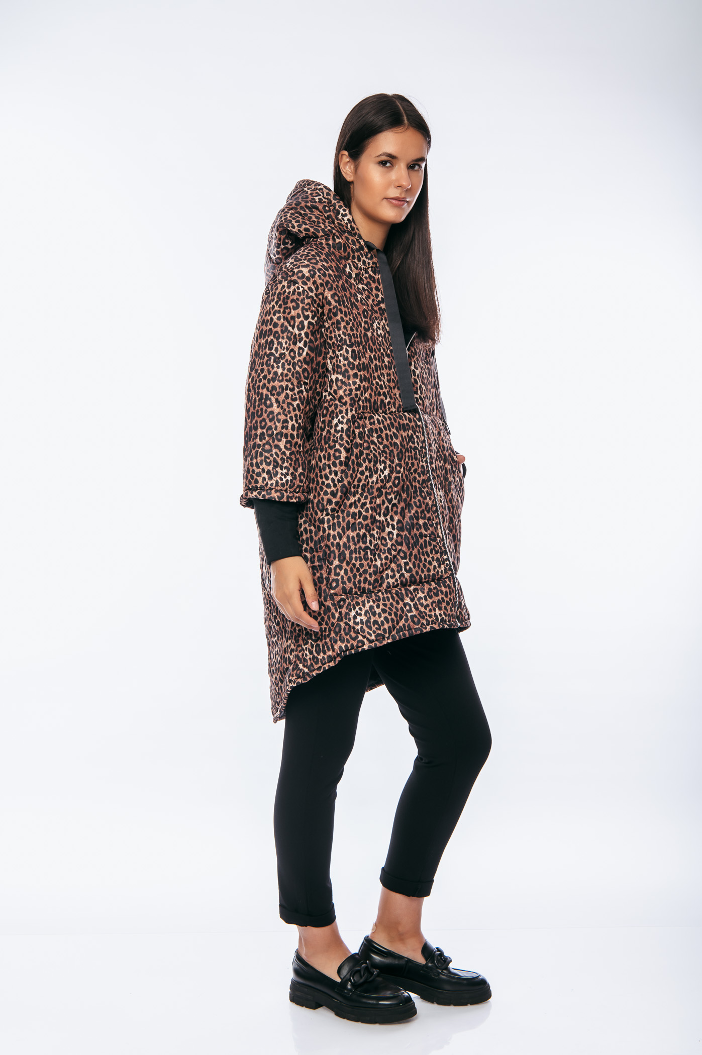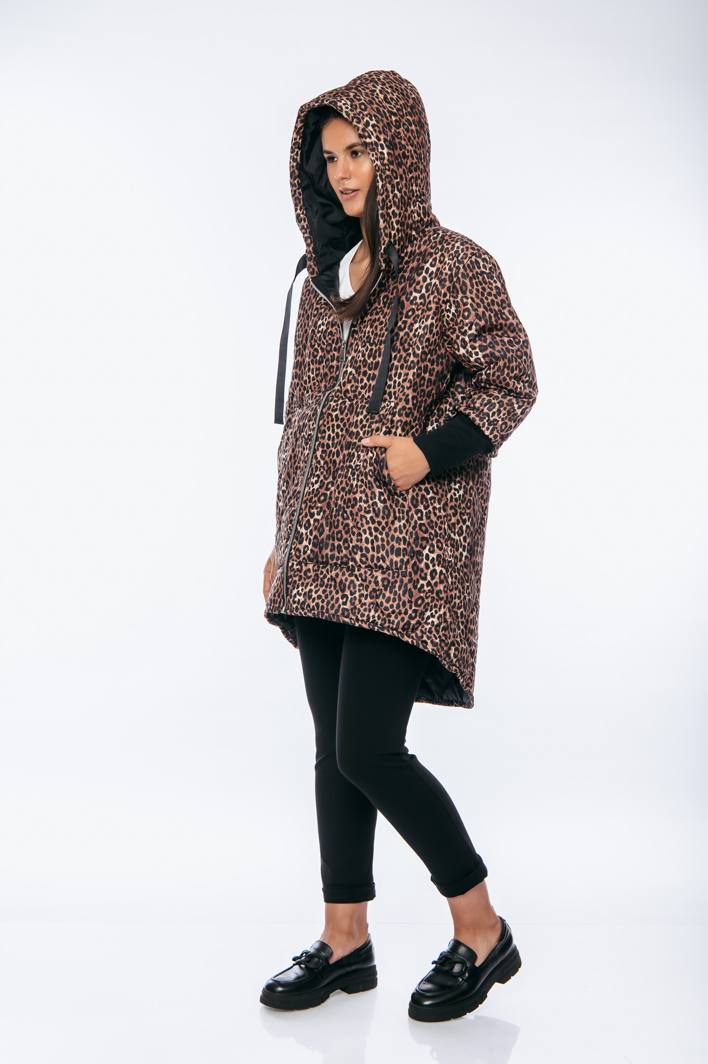 Μπουφάν animal print over size μακρύ με κουκούλα και κορδόνια.