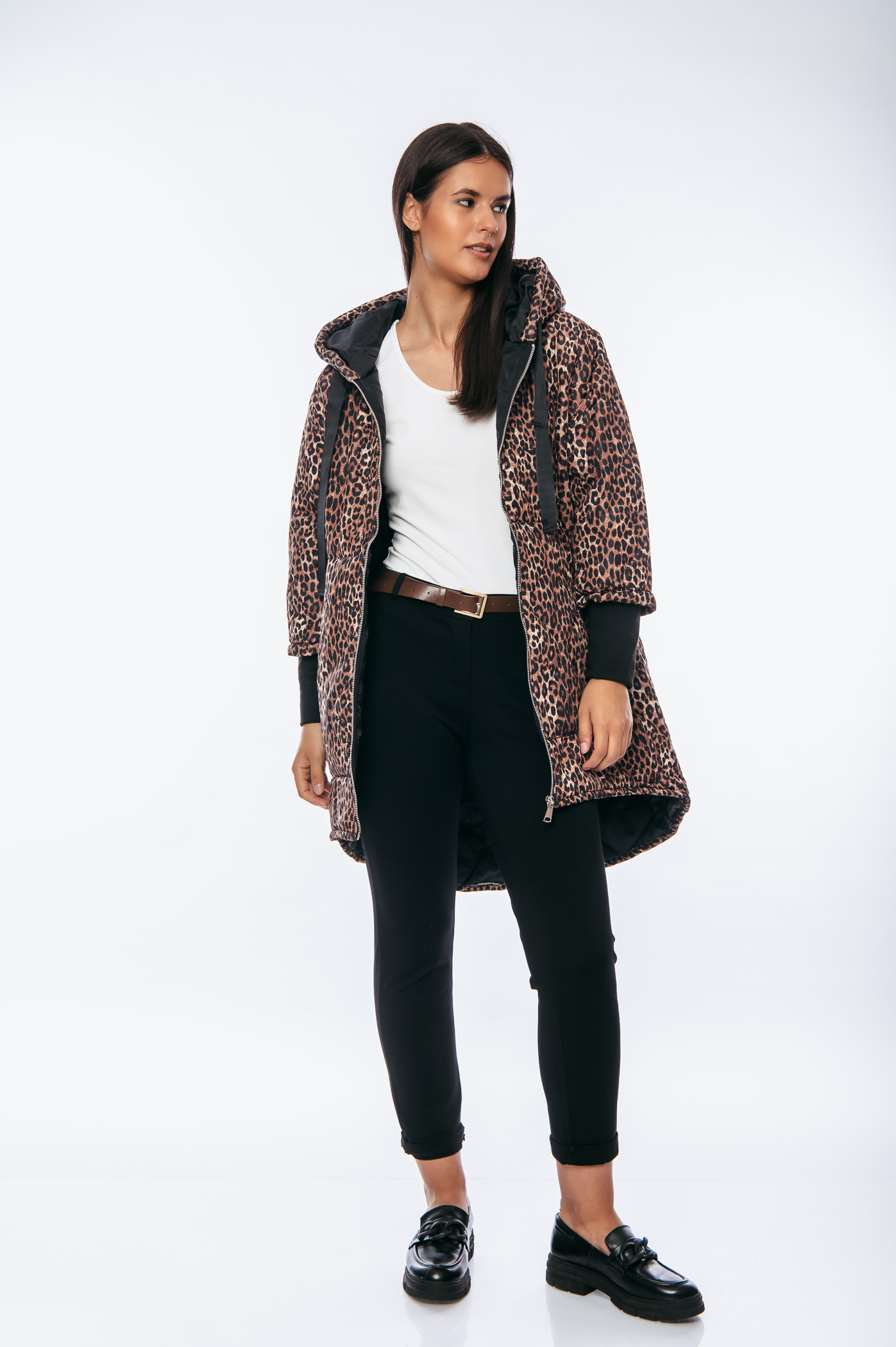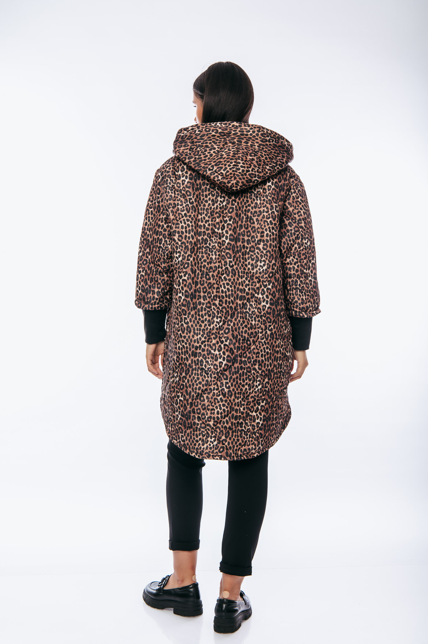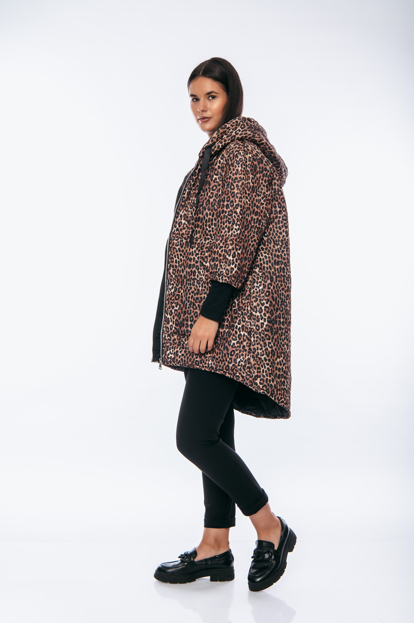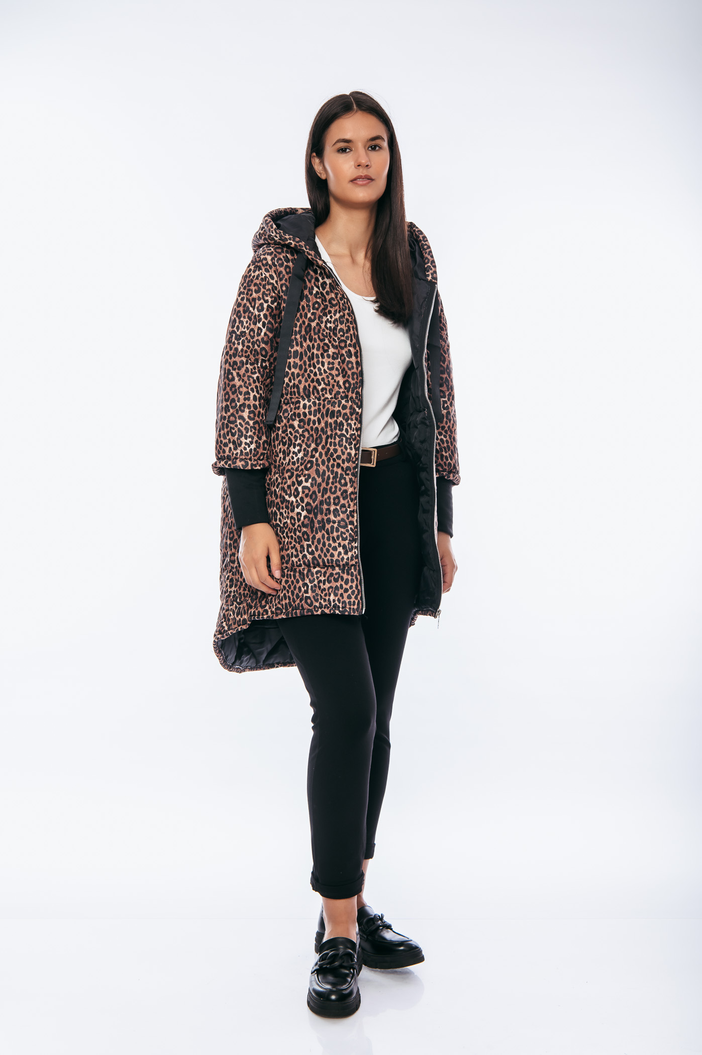 Μπουφάν animal print over size μακρύ με κουκούλα και κορδόνια.