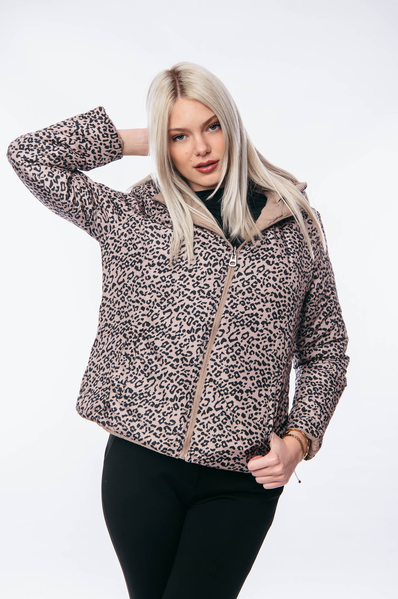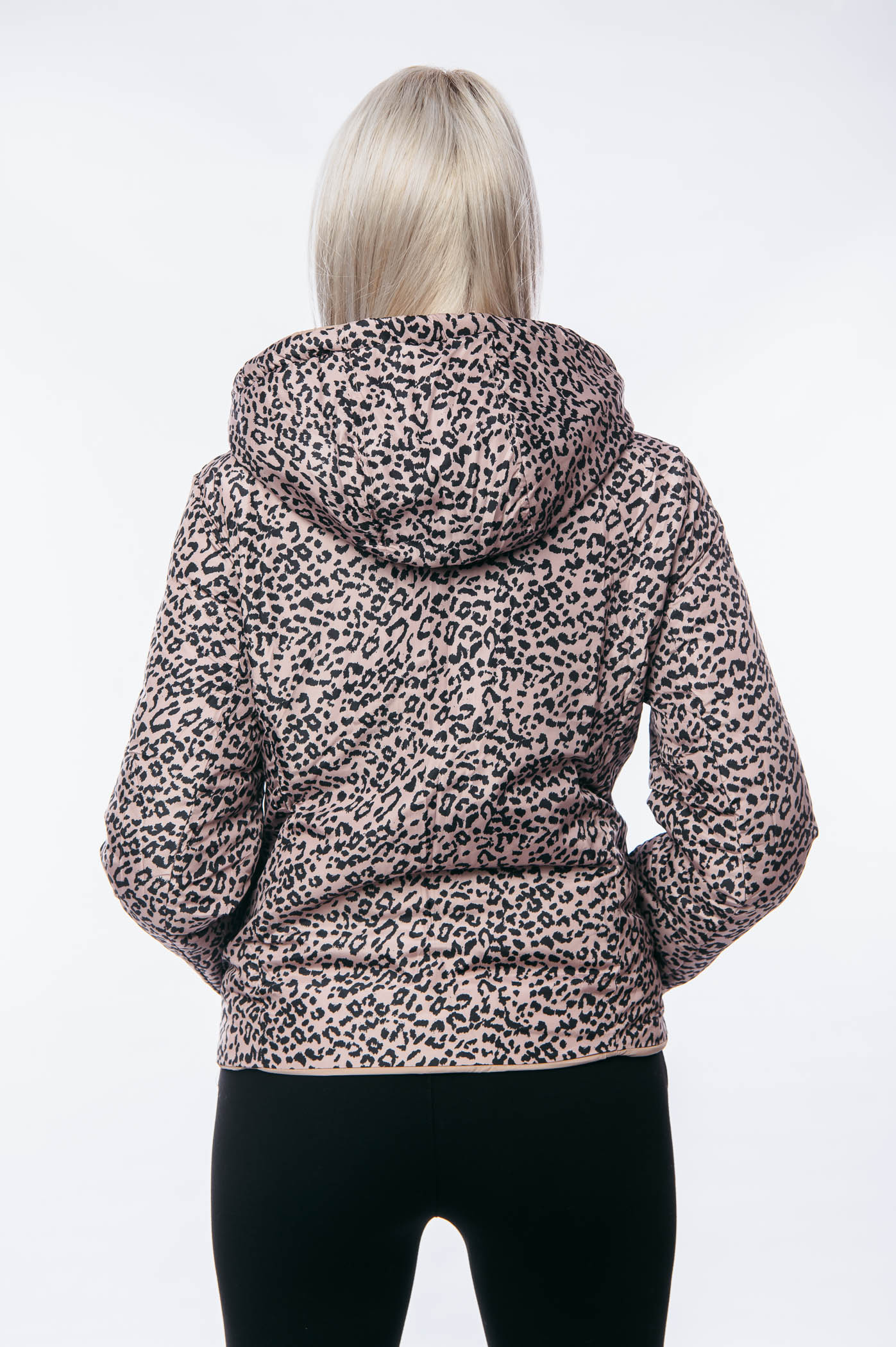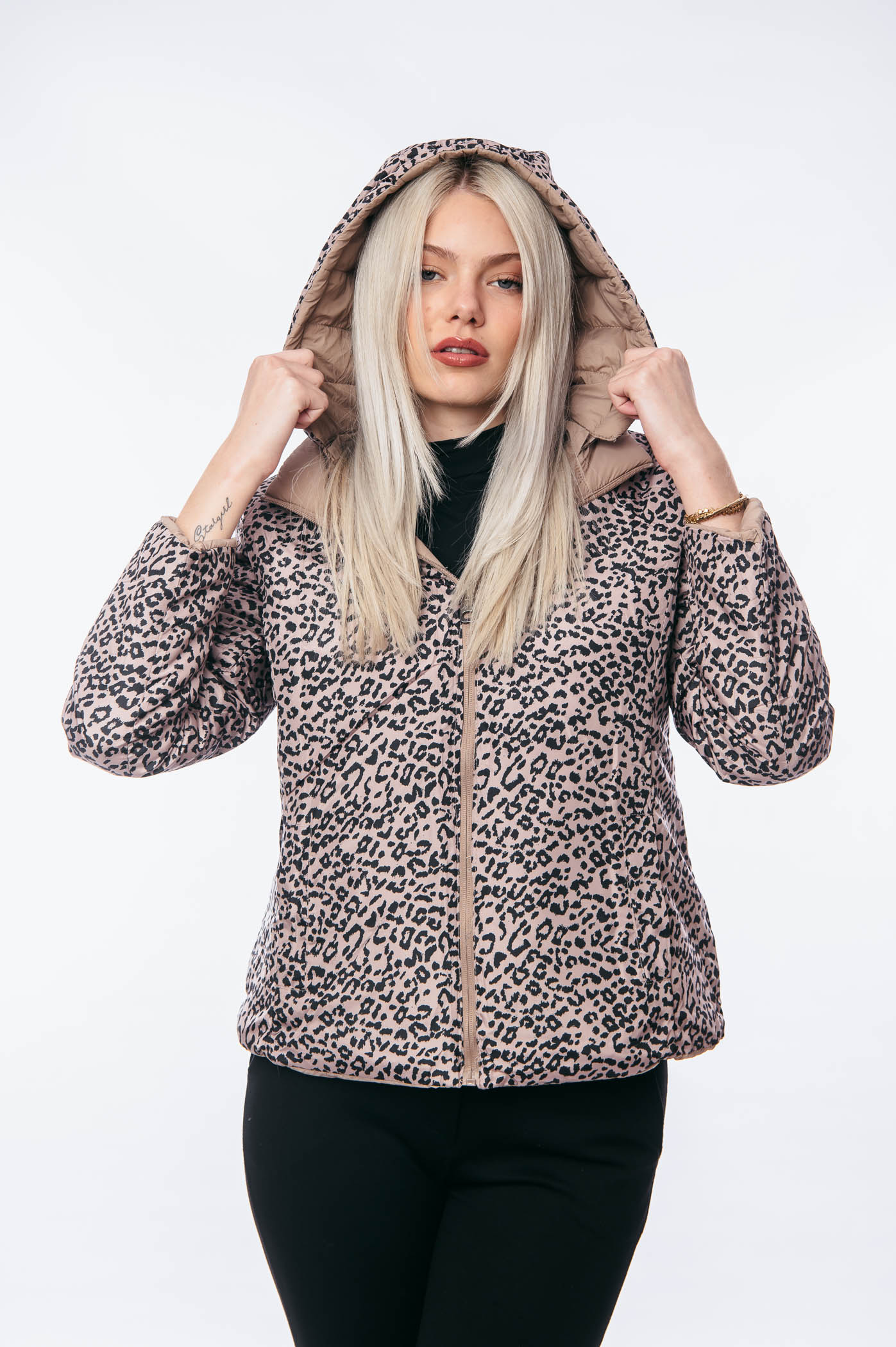 Μπουφάν κοντό διπλής όψεως animal print με αποσπώμενη κουκούλα.