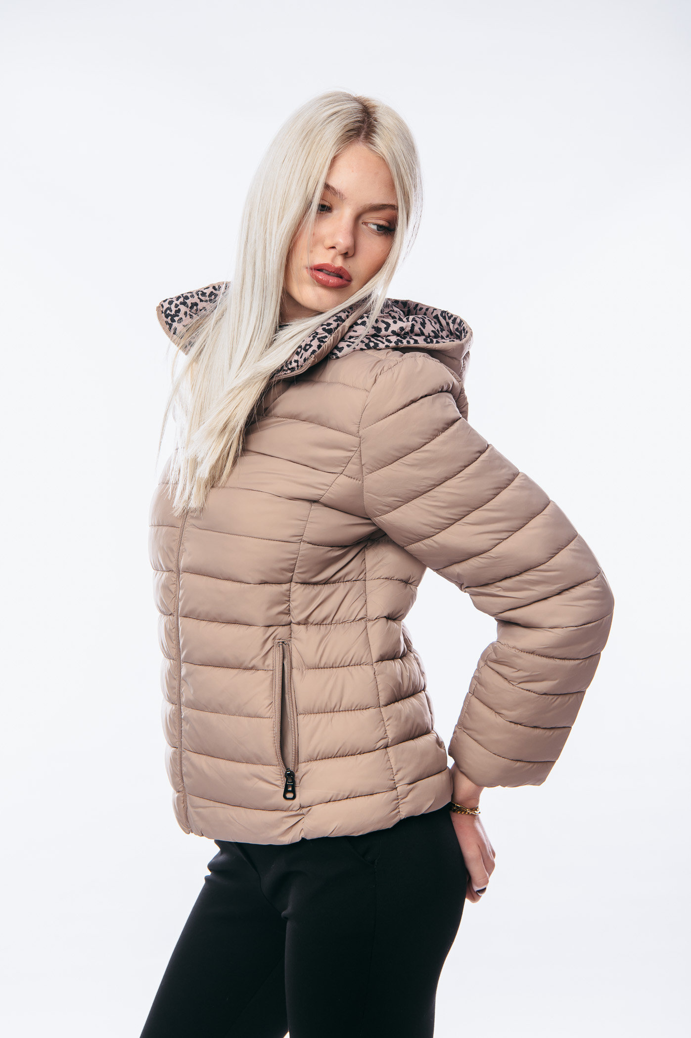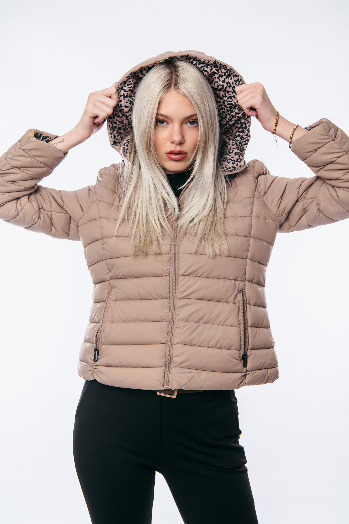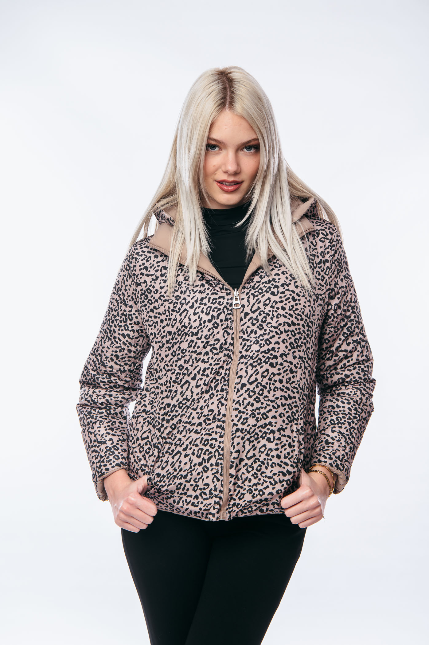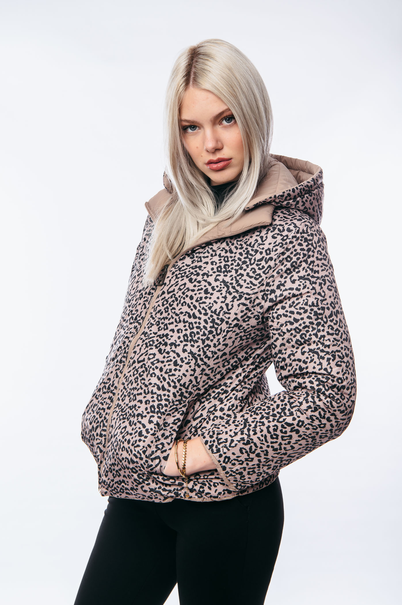 Μπουφάν κοντό διπλής όψεως animal print με αποσπώμενη κουκούλα.