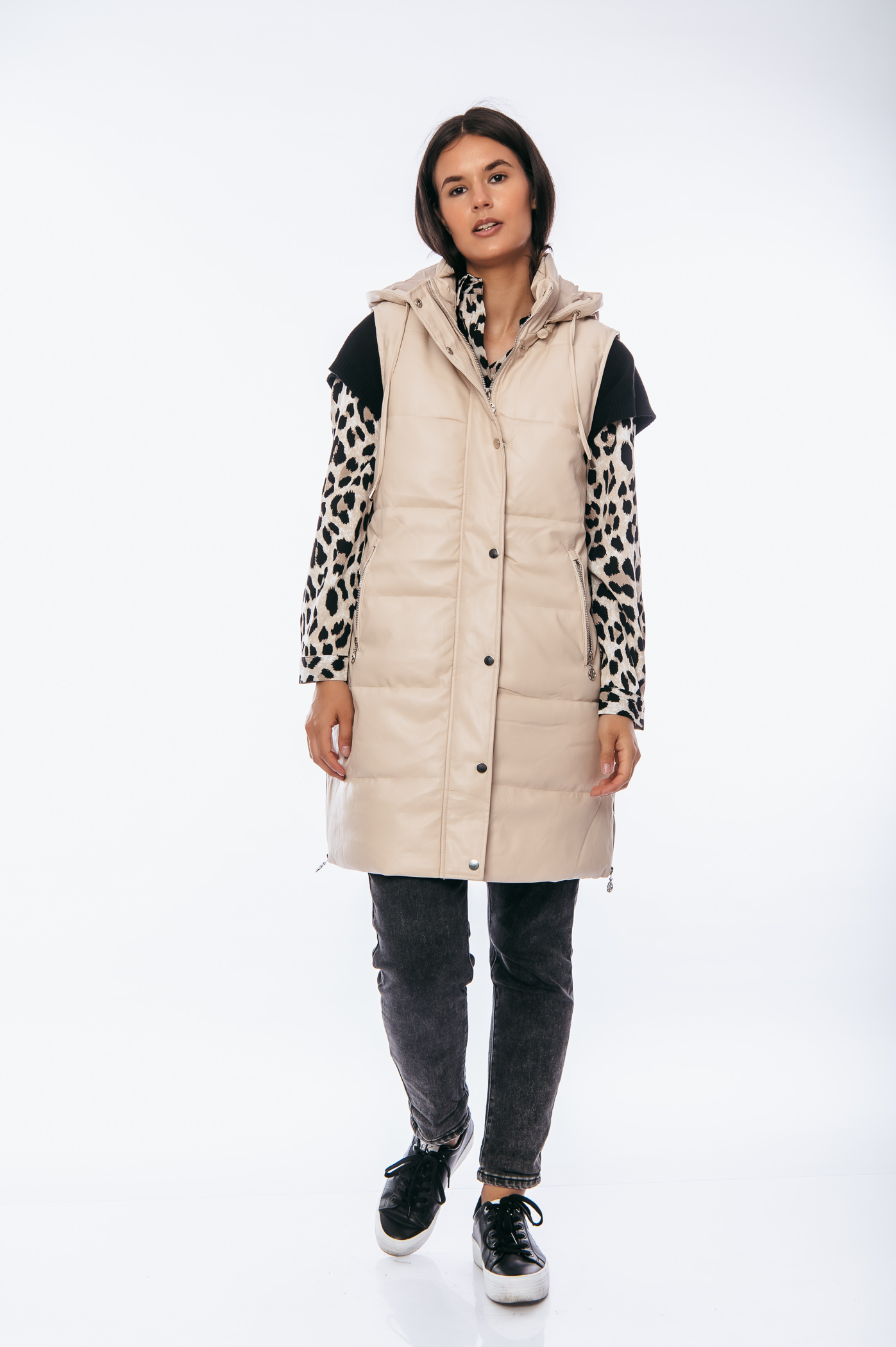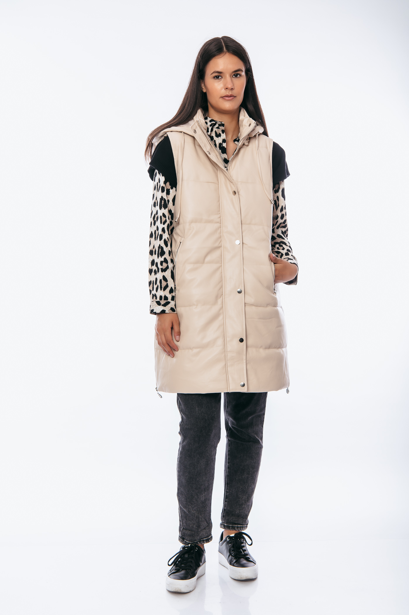 Αμάνικο τζάκετ δερματίνι μακρύ με τσέπες,κουμπιά και φερμουάρ και αποσπώμενη κουκούλα με κορδόνια.
