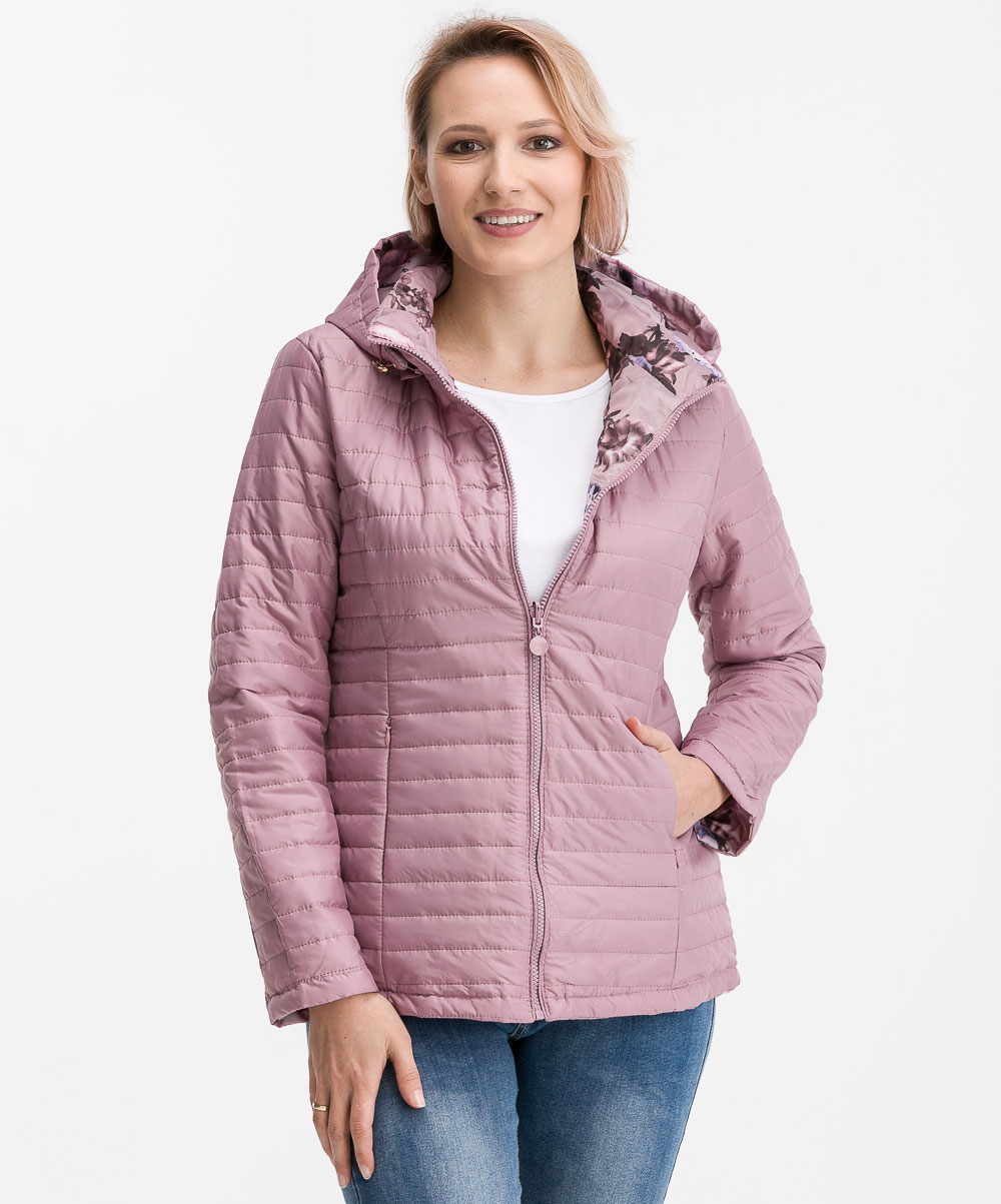 Μπουφάν διπλής όψεως, μονόχρωμο και φλοράλ αντίστοιχα με αποσπώμενη κουκούλα, κλείσιμο με φερμουάρ, γραμμή κανονική και ίσια γραμμή.