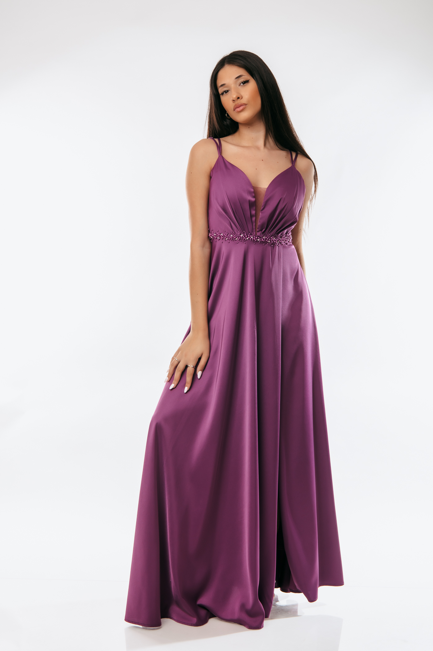 Φόρεμα αμπιγιέ σατέν με διακοσμητικές πέρλες και στρας στη μέση και φερμουάρ με ρυθμιζόμενες ράντες στο πίσω μέρος.