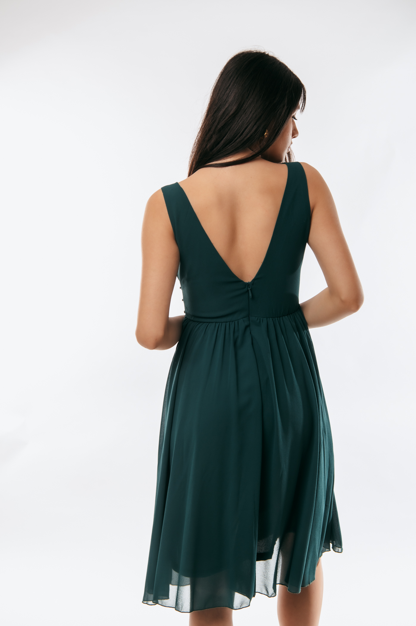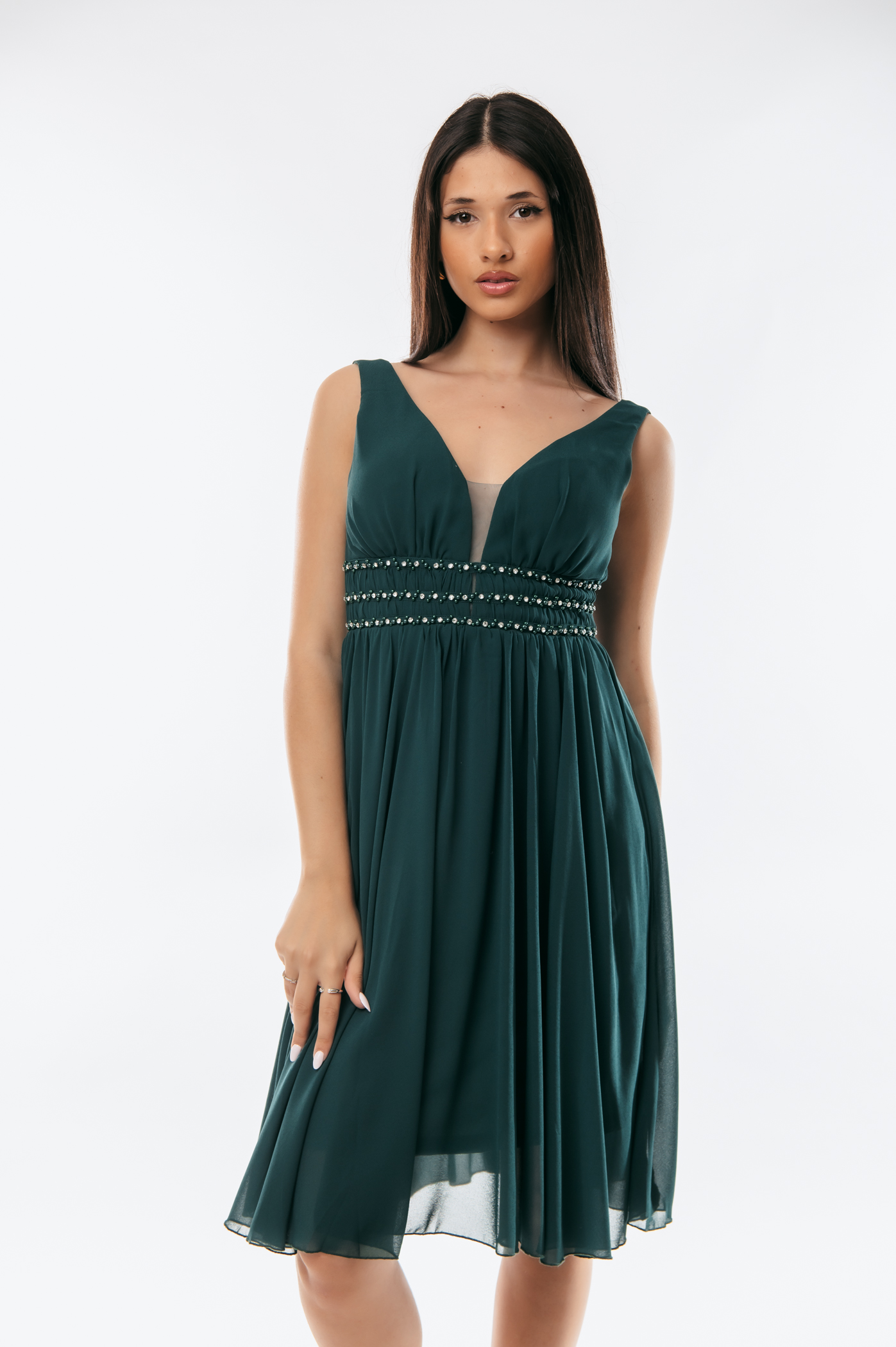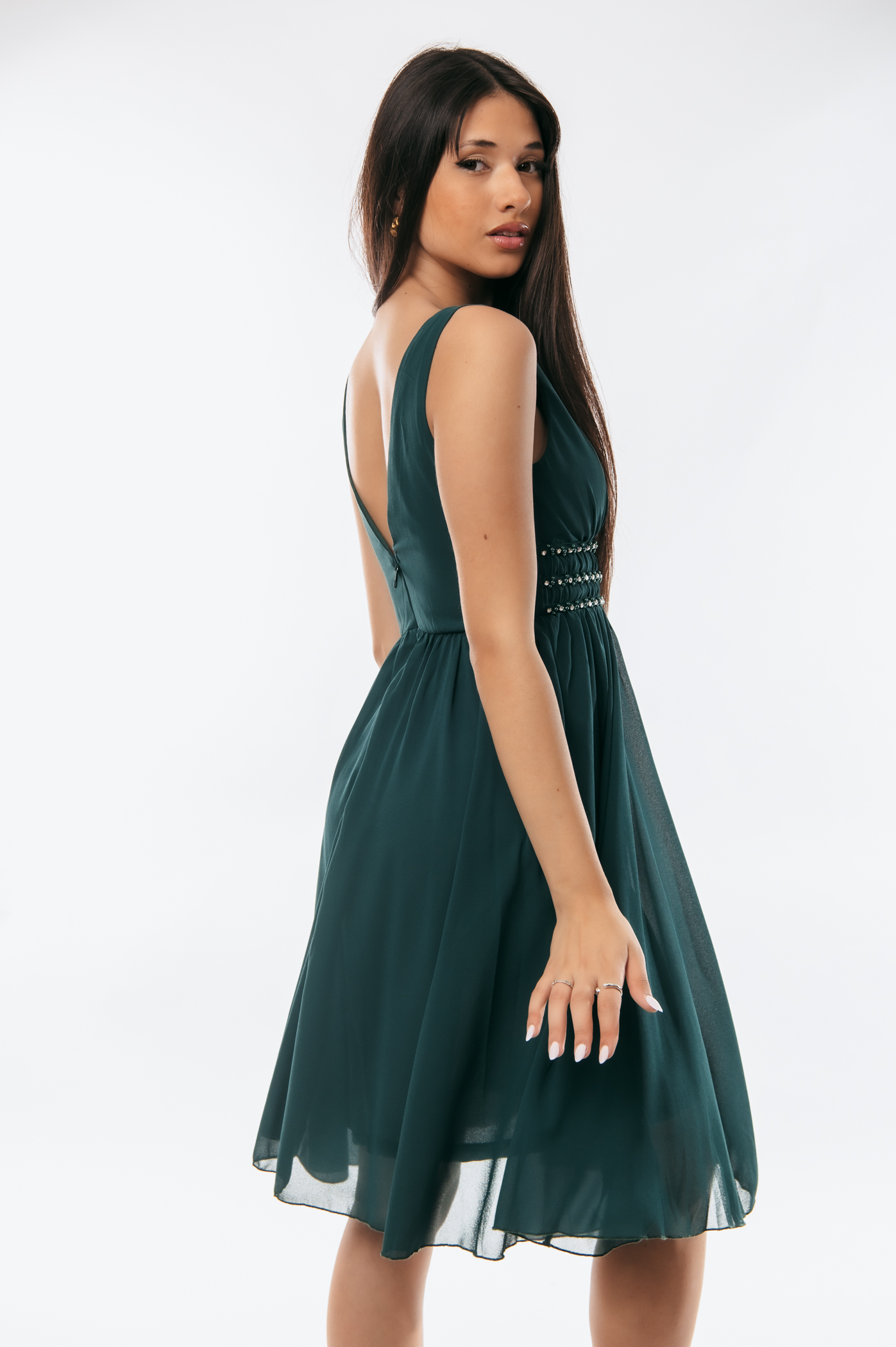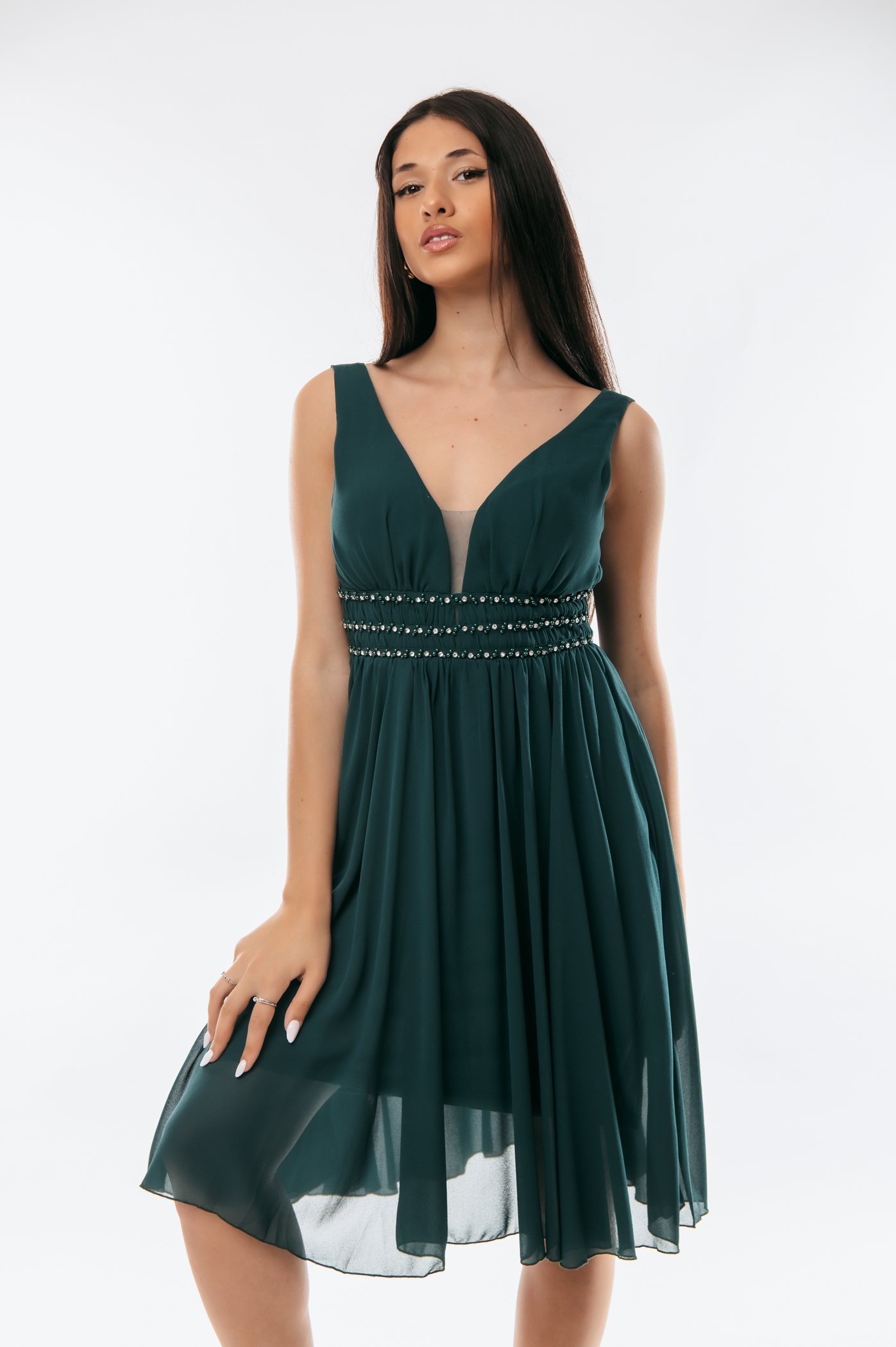 Φόρεμα κοντό αμπιγιέ με διακοσμητικά στρας και πέρλες και φερμουάρ στο πίσω μέρος.