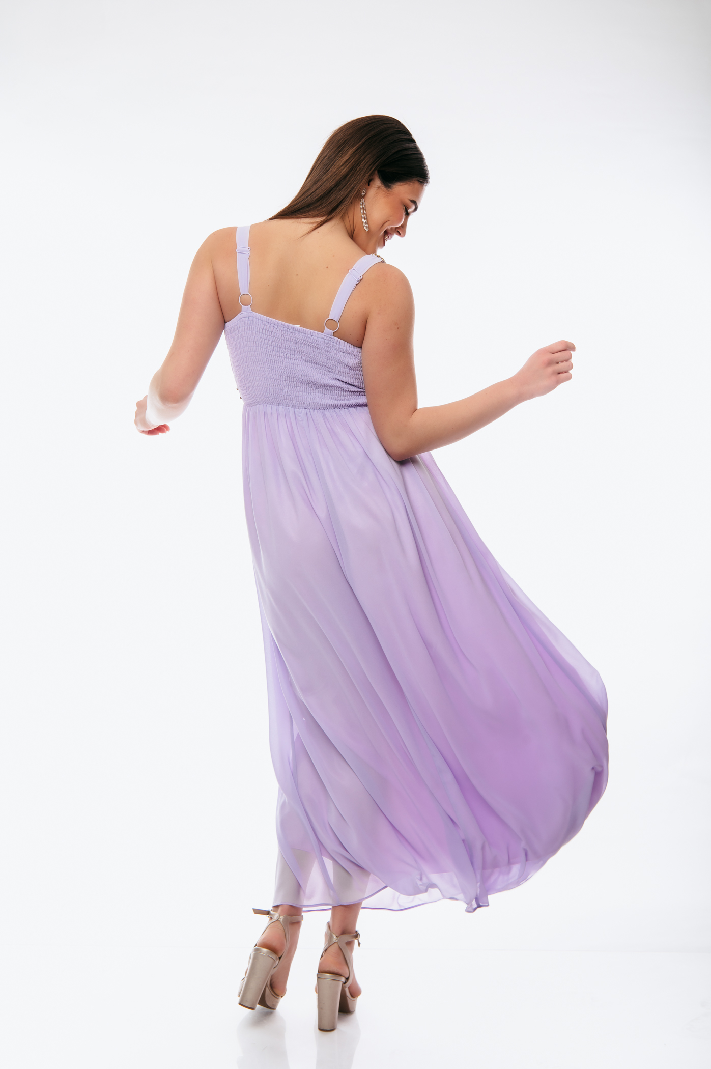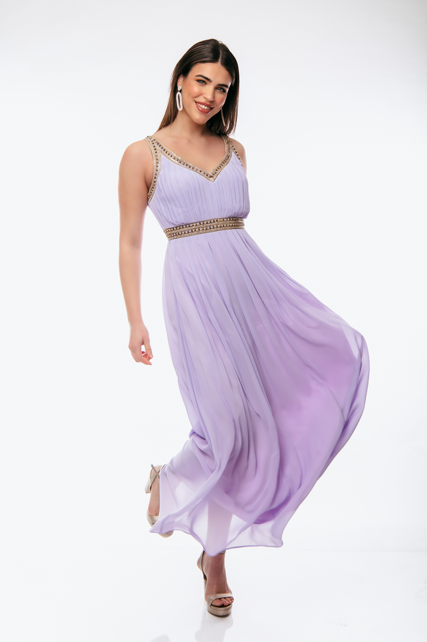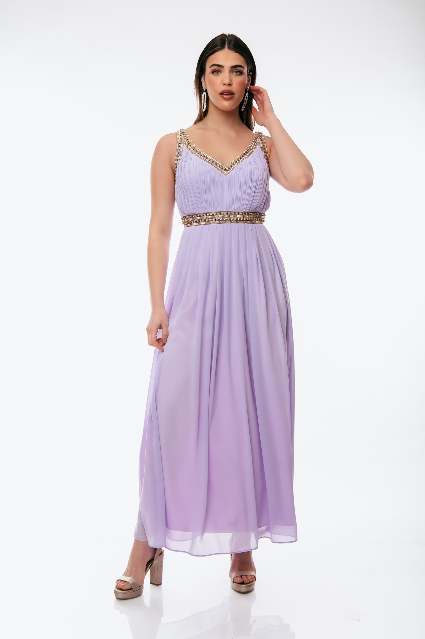 Φόρεμα αμπιγιέ με διακοσμητικές χάνδρες και ve πλισέ στο πάνω μέρος και σφιγκοφωλιά πίσω με ρυθμιζόμενες τιράντες.