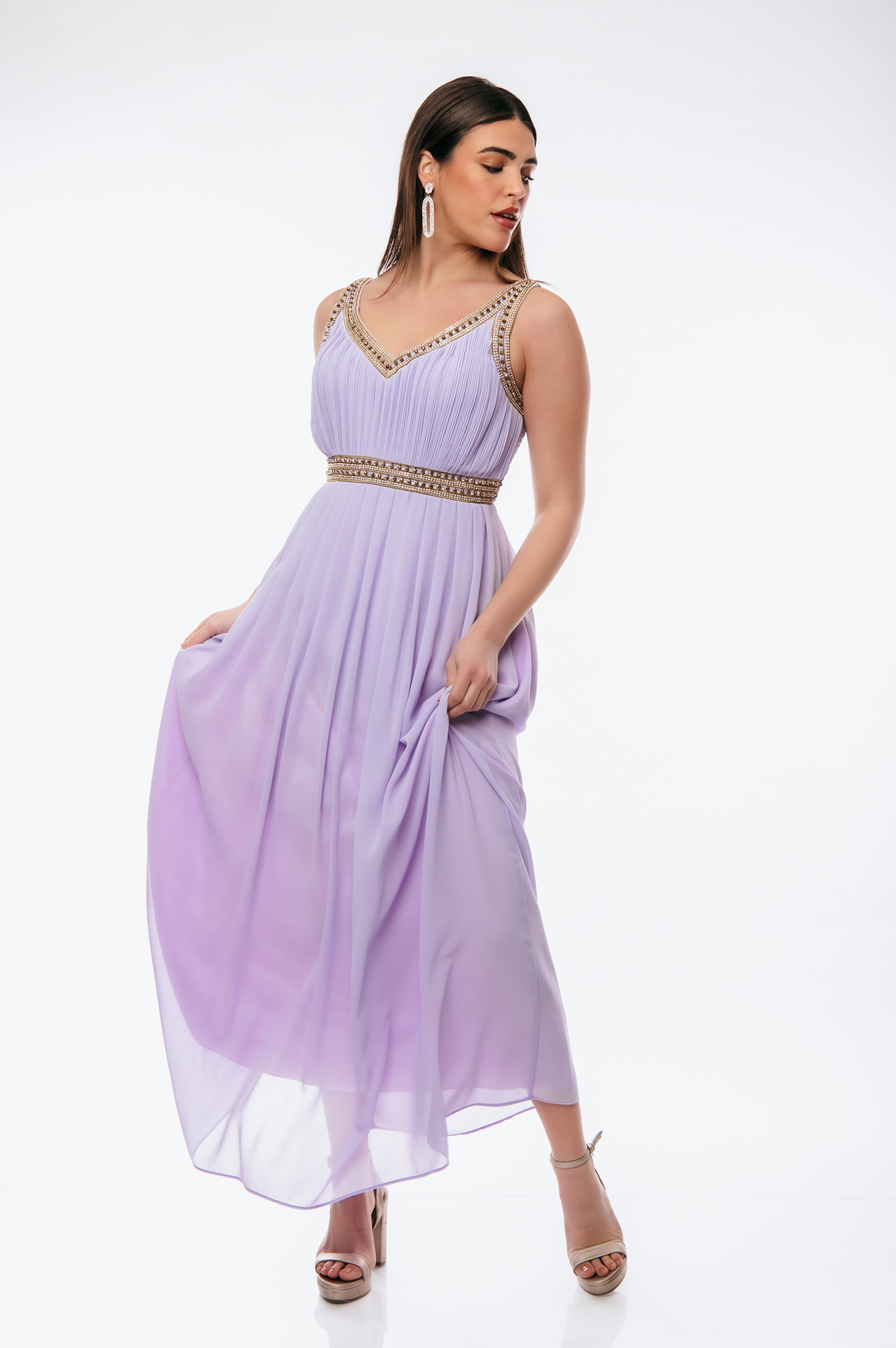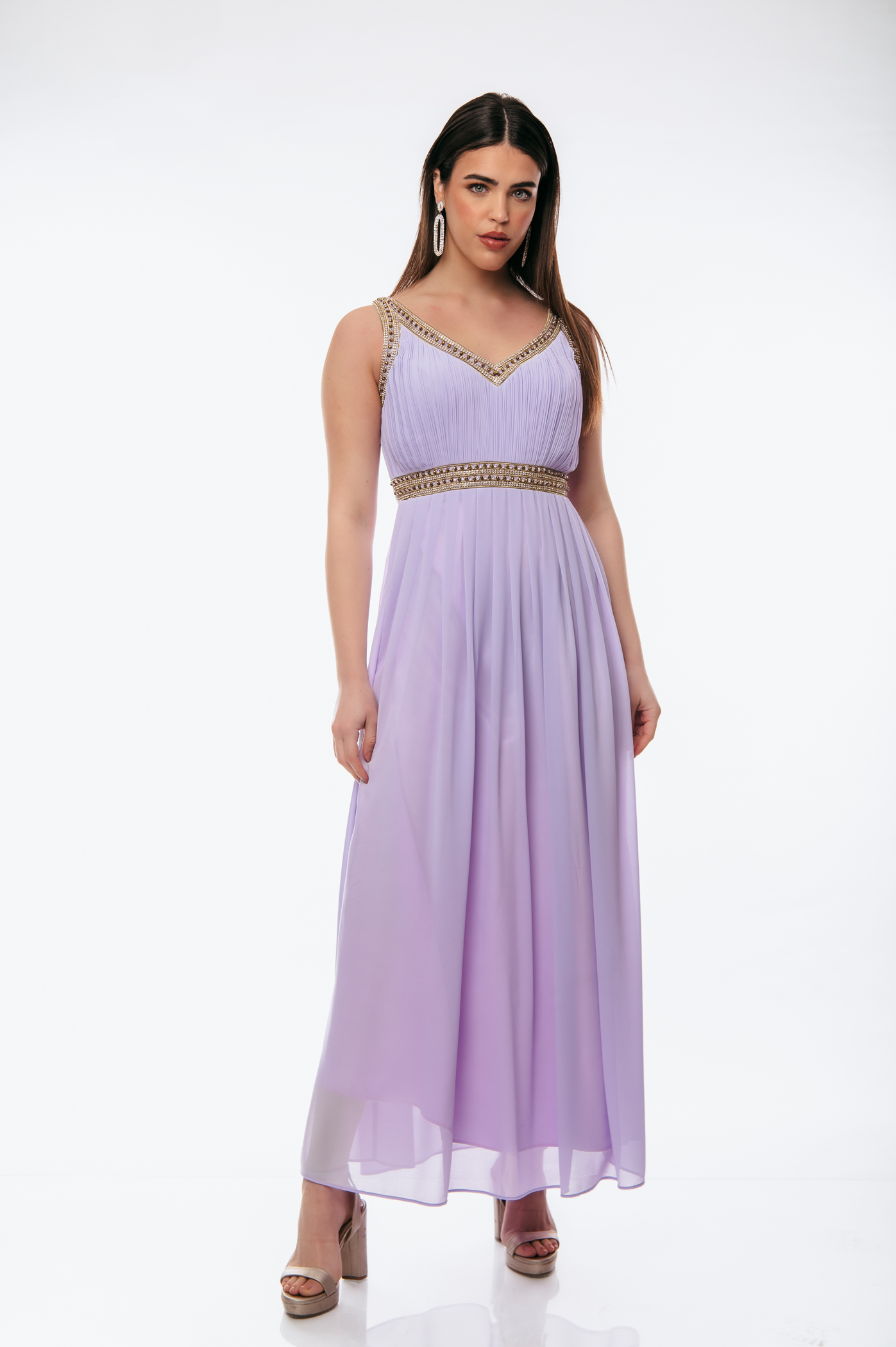 Φόρεμα αμπιγιέ με διακοσμητικές χάνδρες και ve πλισέ στο πάνω μέρος και σφιγκοφωλιά πίσω με ρυθμιζόμενες τιράντες.