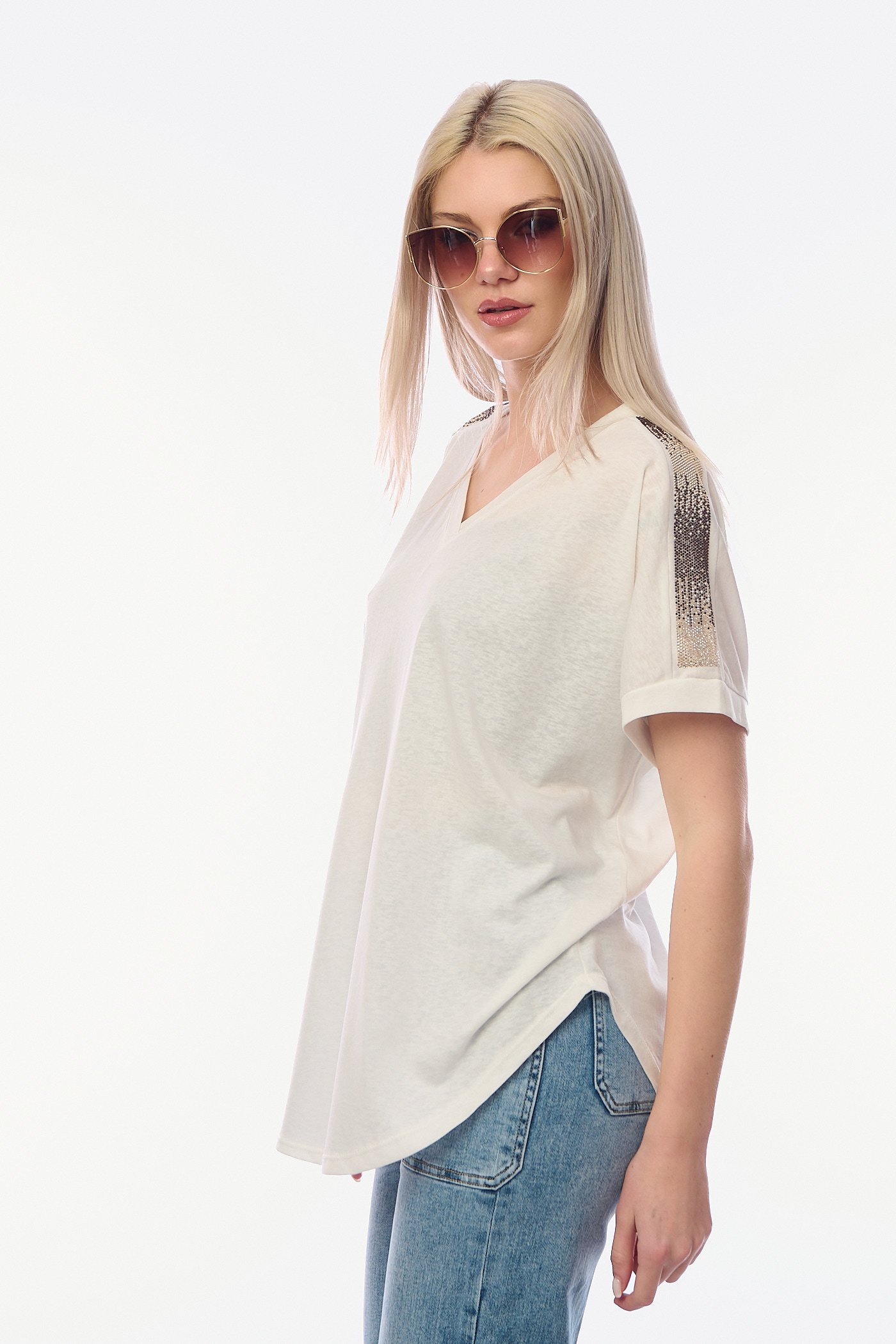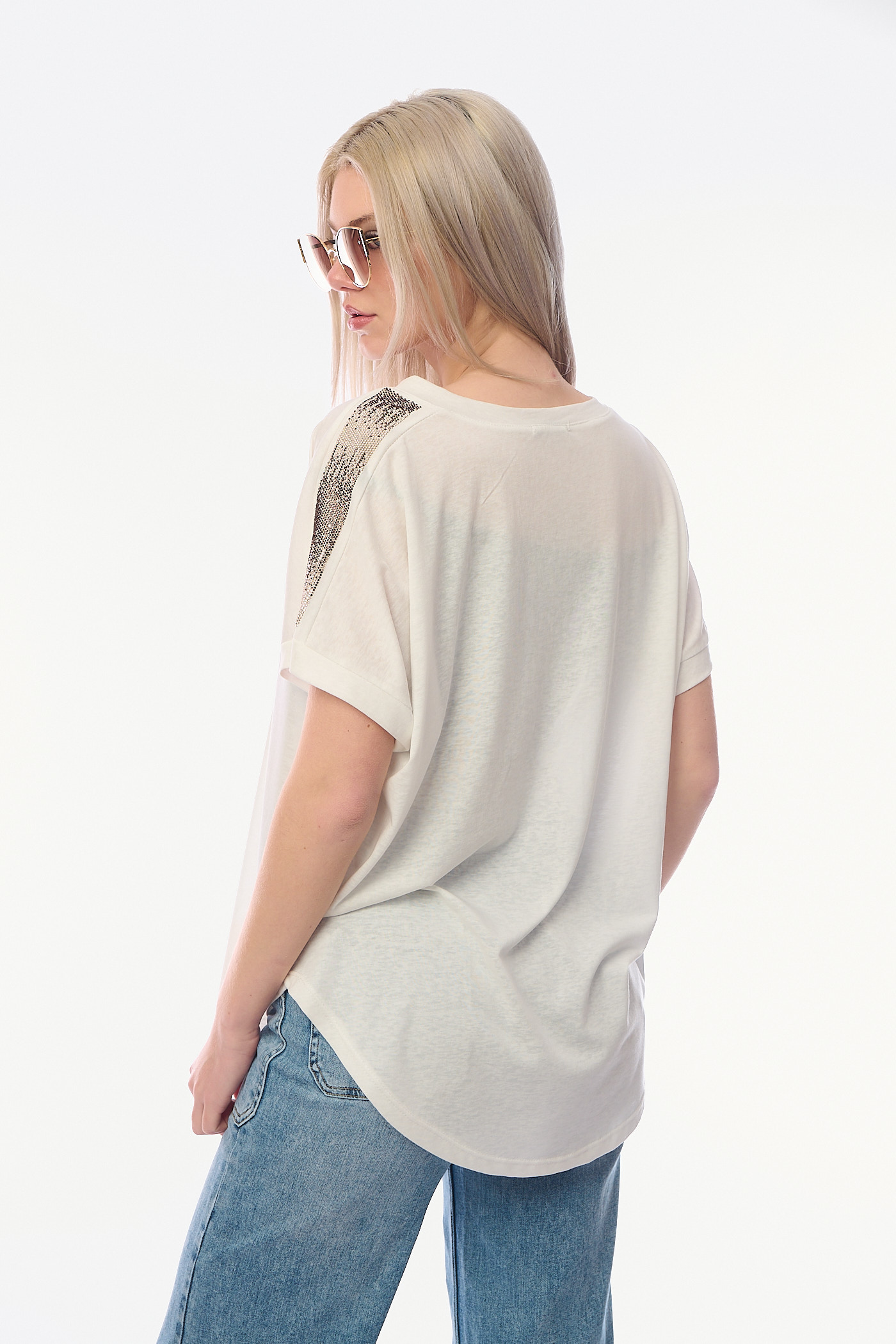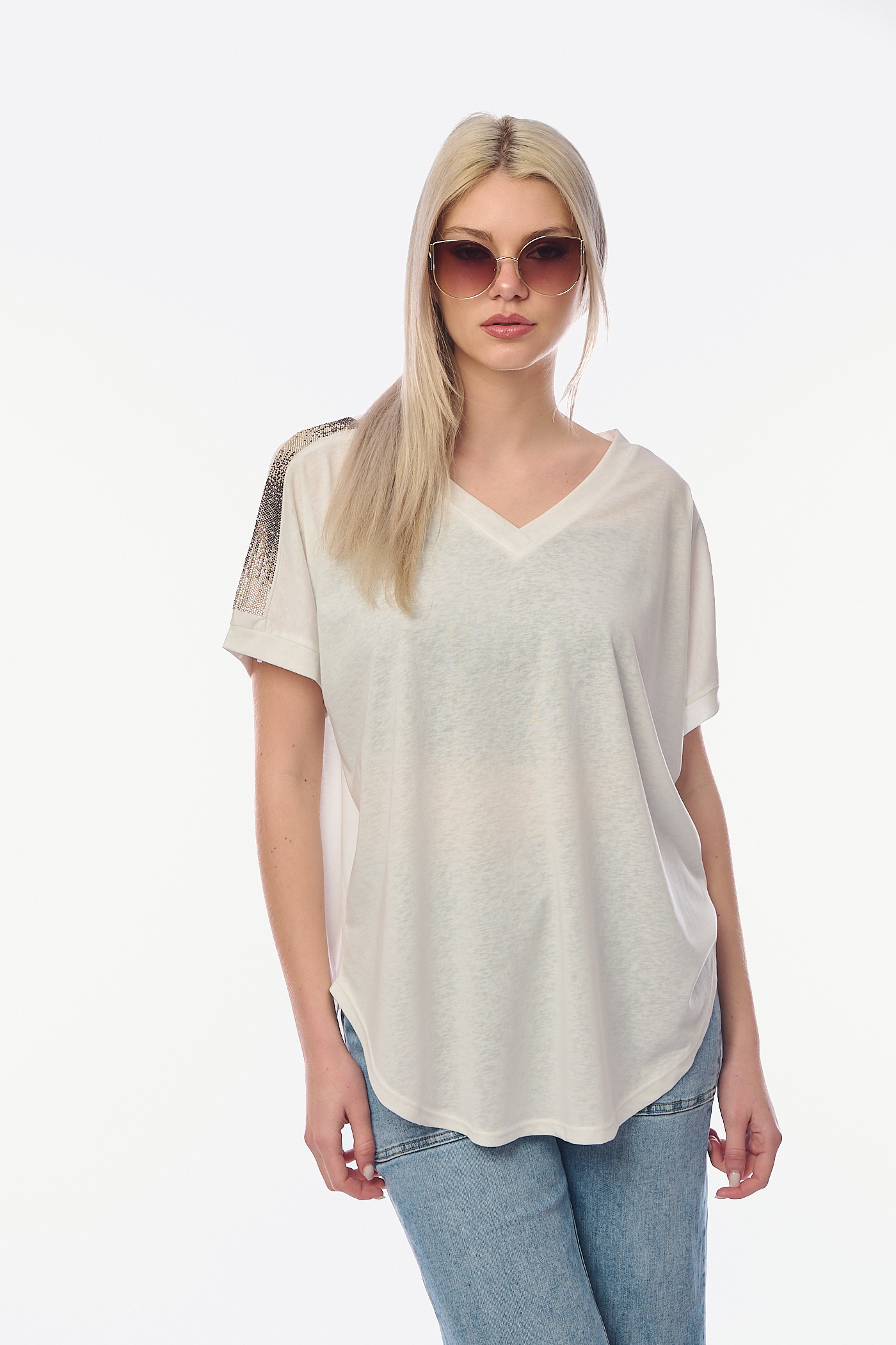 Γυναικείο T-shirt σε Λευκό Χρώμα με V-λαιμόκοψη και Διακοσμητικές Τρέσες από Στρας στους Ώμους-4468