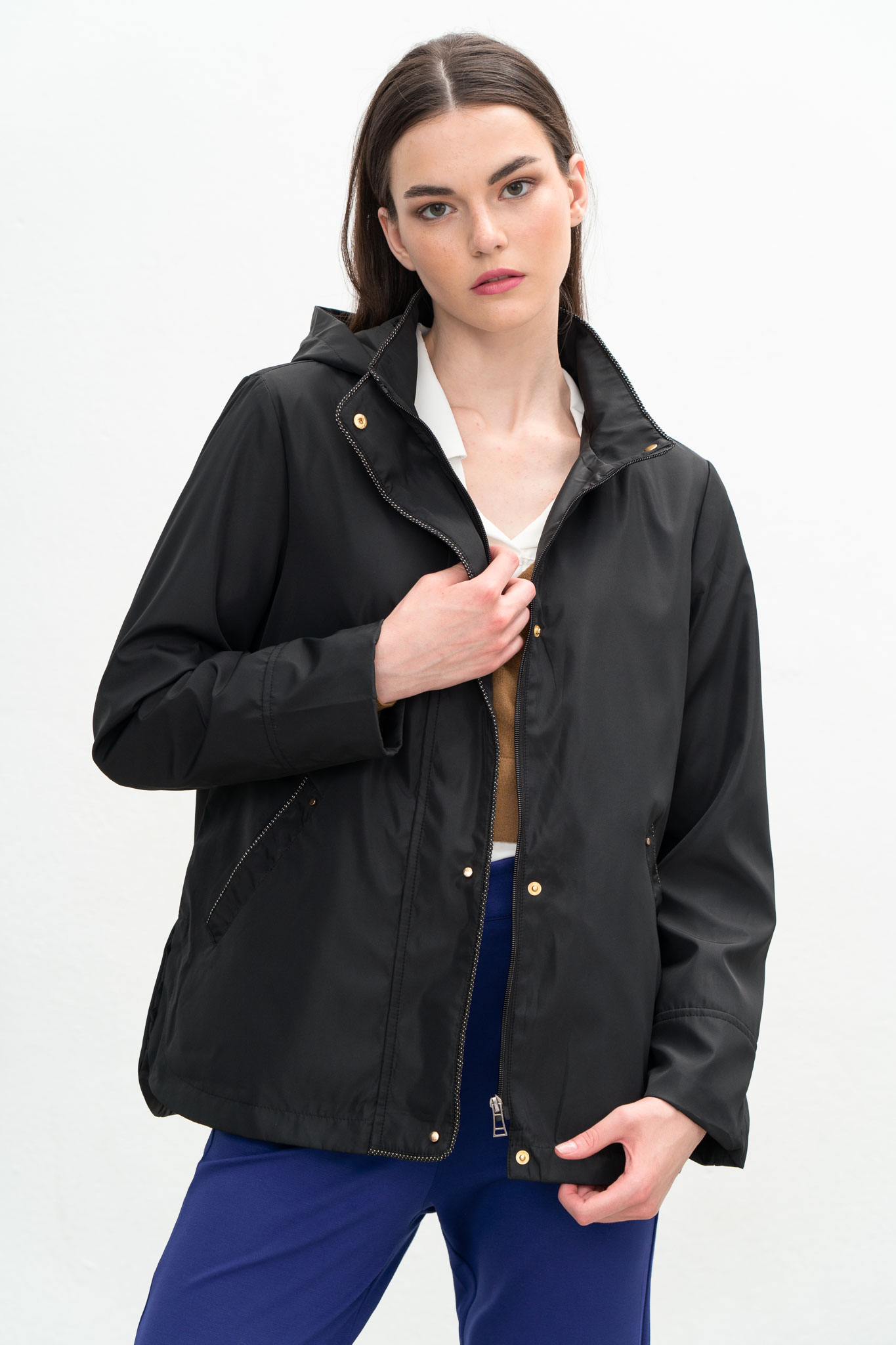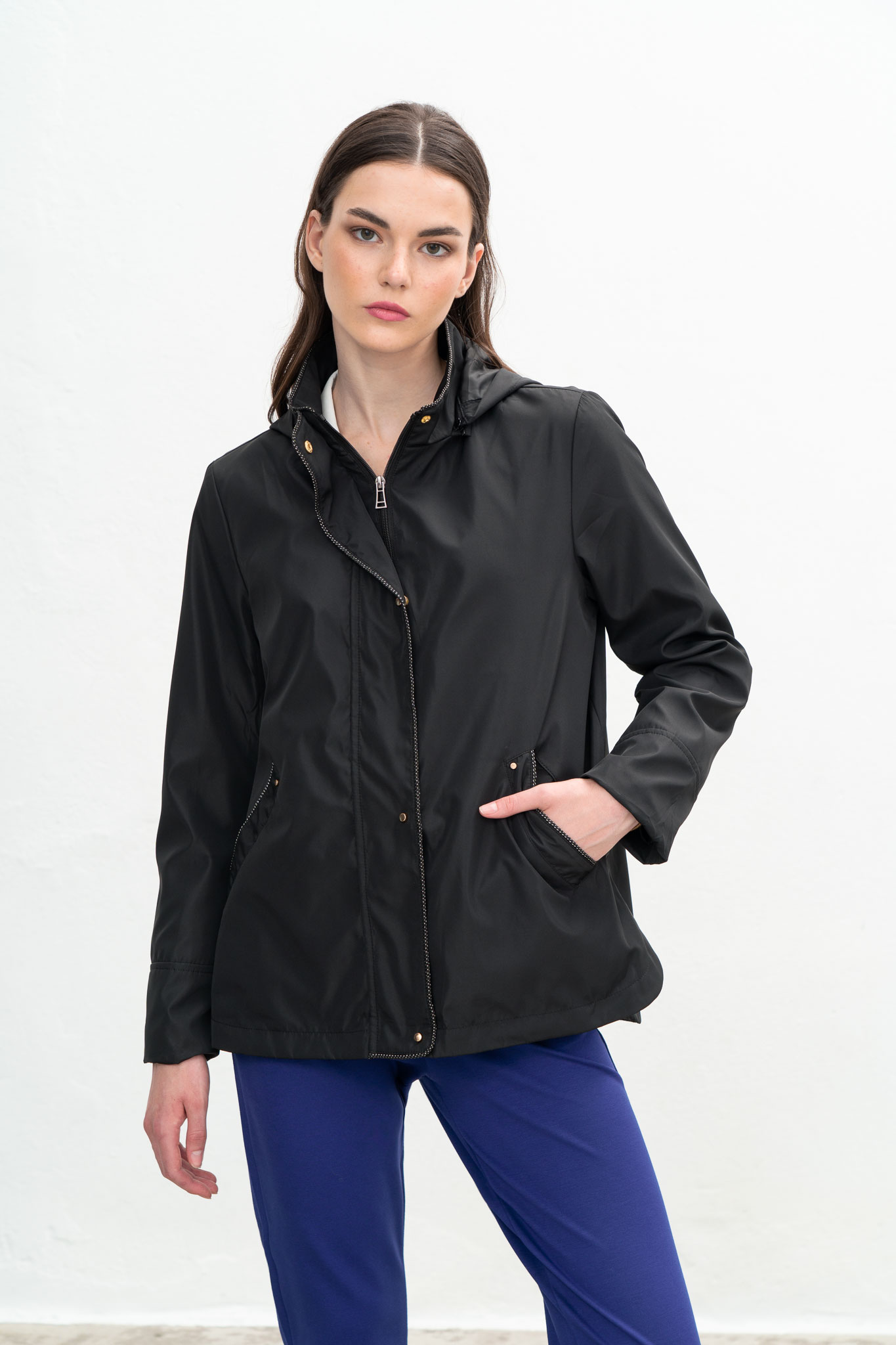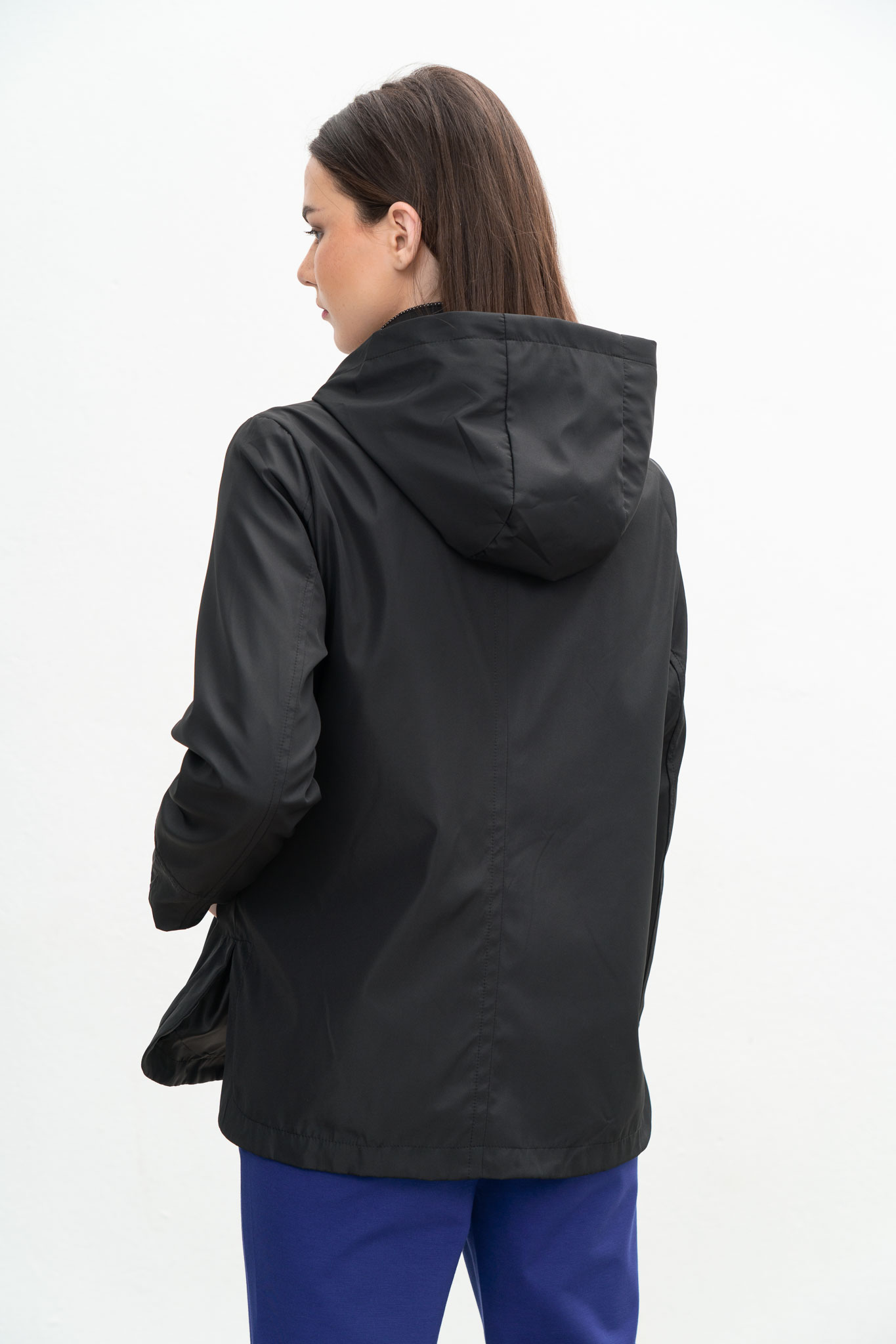 Καμπαρντίνα με άνοιγμα στο πλάϊ στο κάτω μέρος, κουκούλα αποσπώμενη και τσέπες.