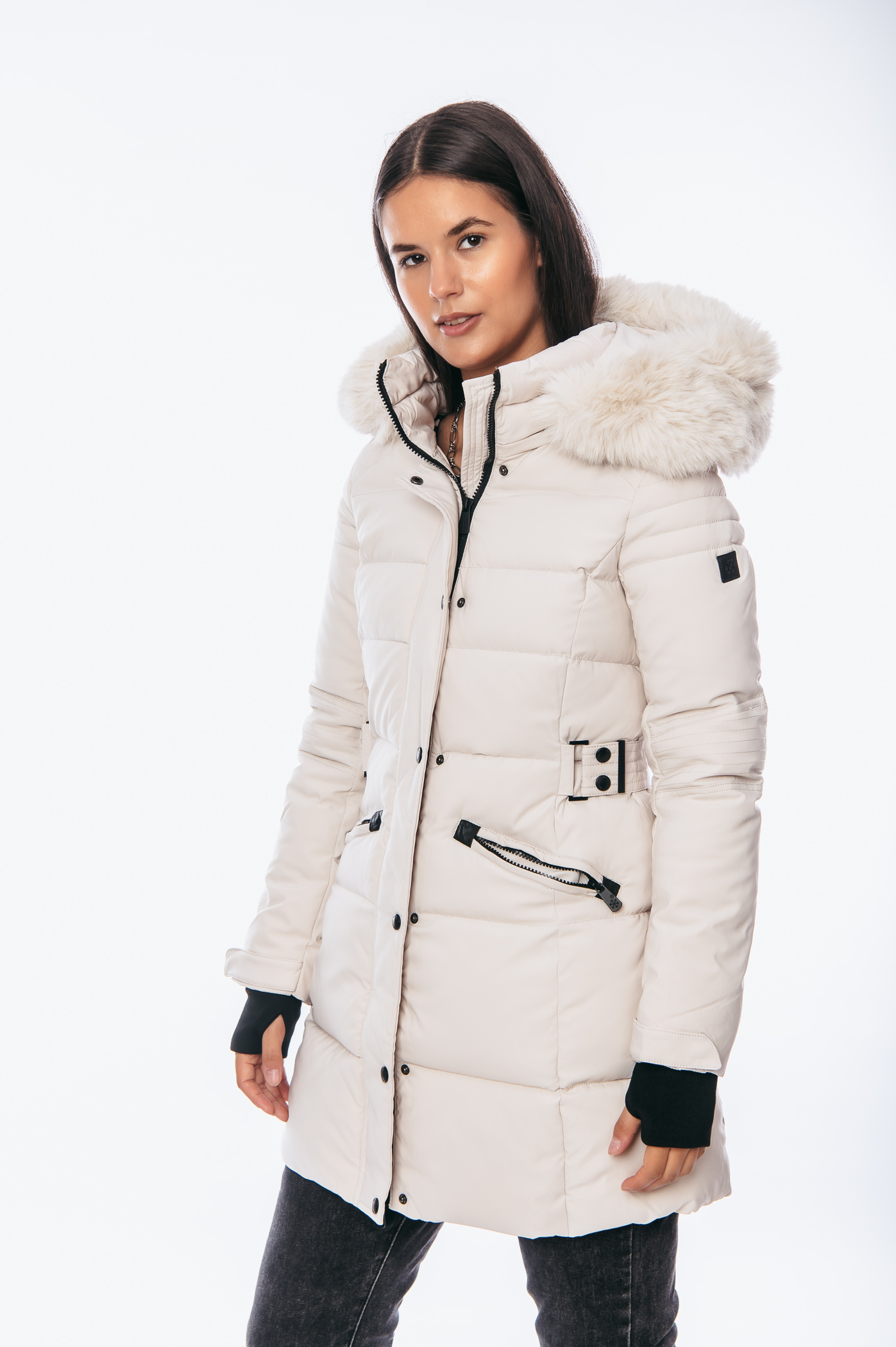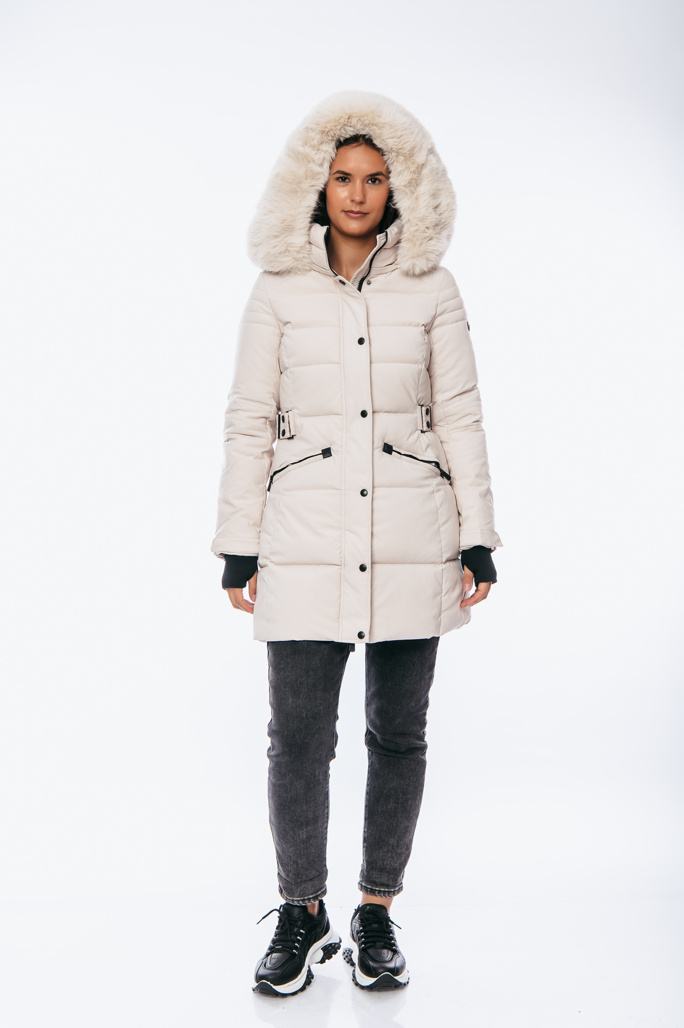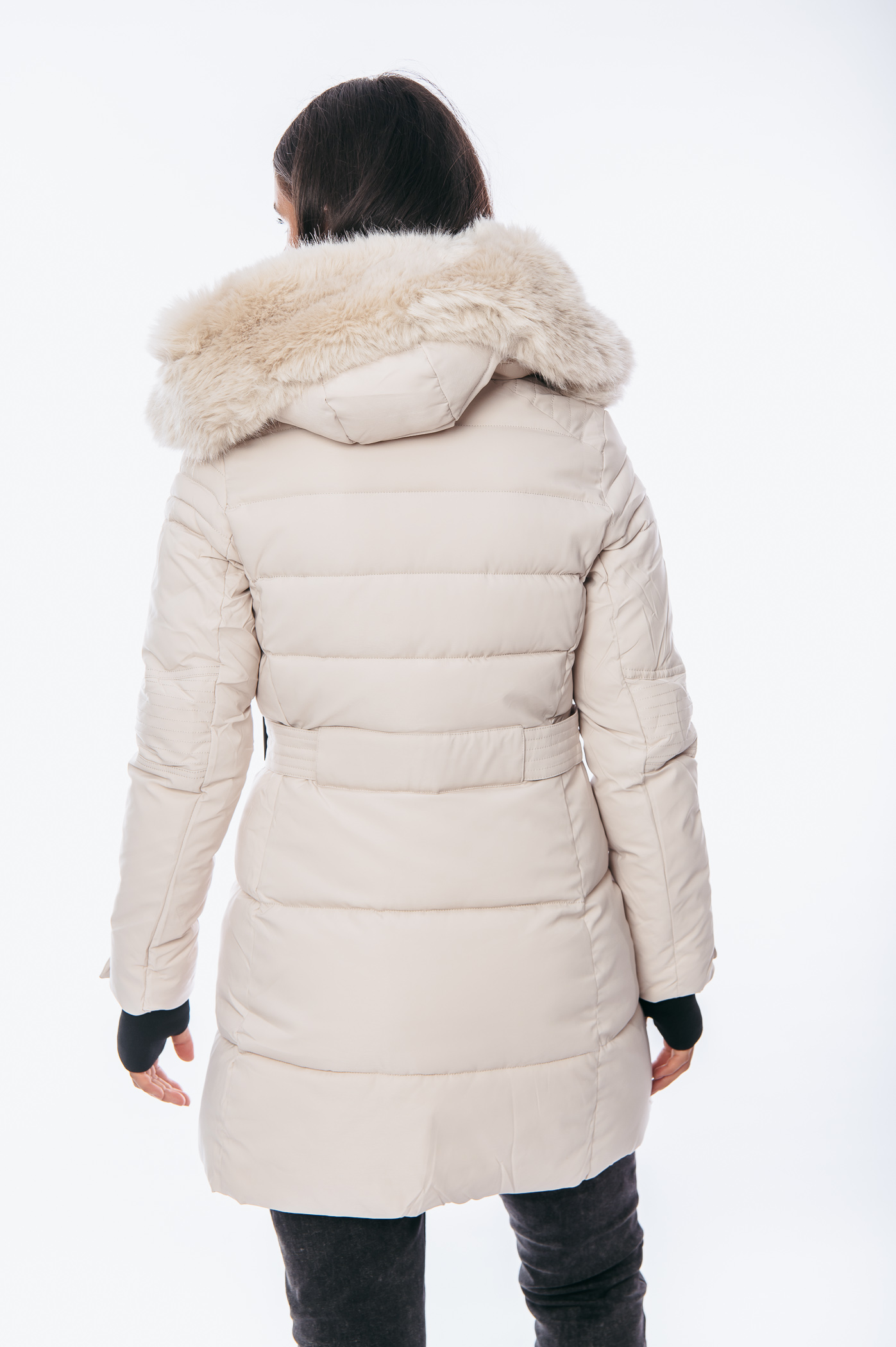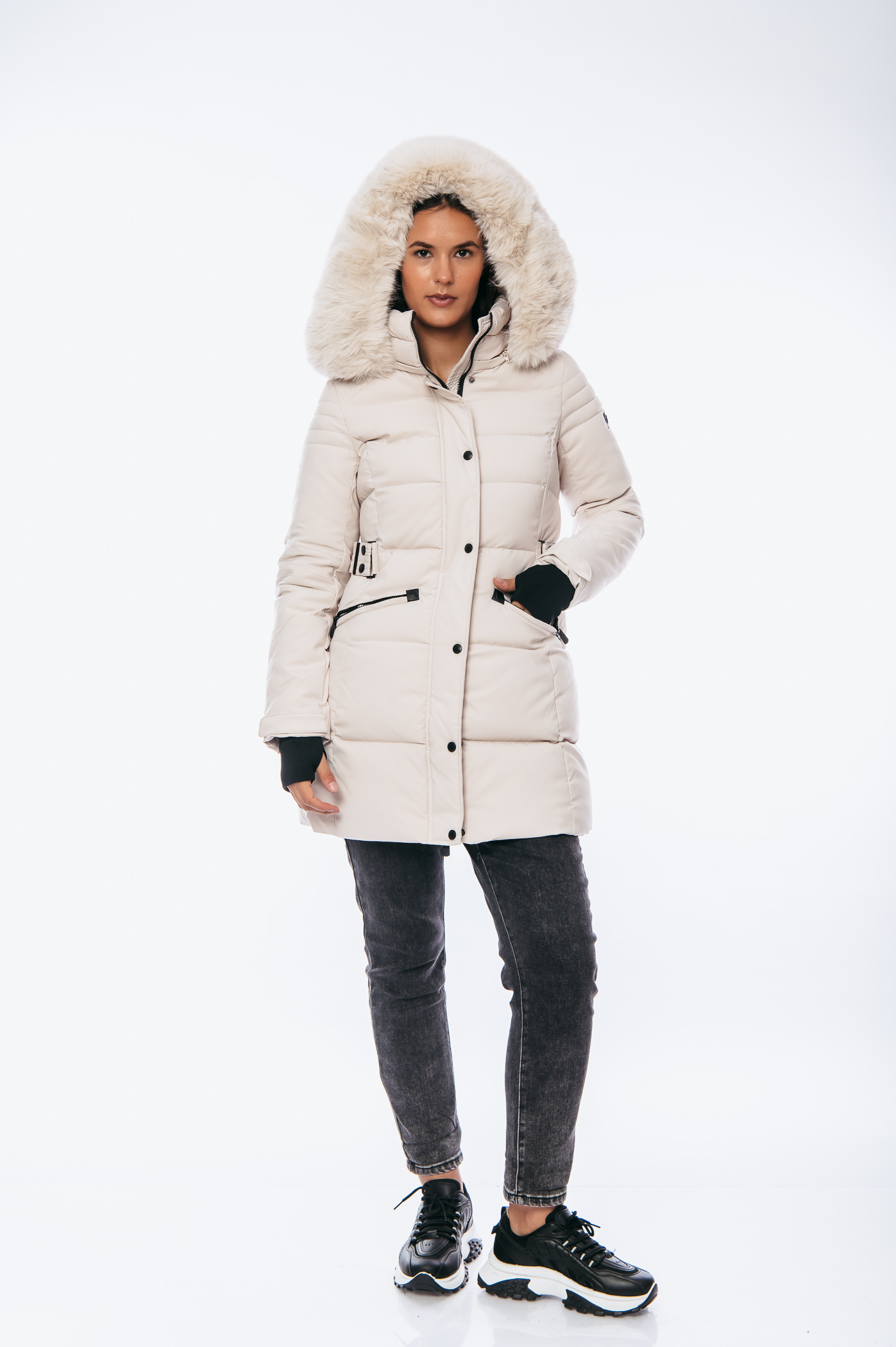 Μπουφάν μακρύ με τσέπες,αποσπώμενη κουκούλα και γούνα, λεπτομέρεια στο μανίκι και λάστιχο τύπου ζώνη αποσπώμενη με κουμπιά στο πίσω μέρος.