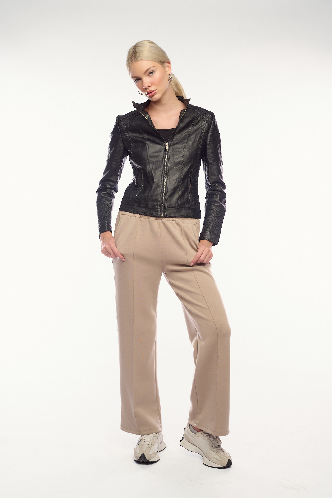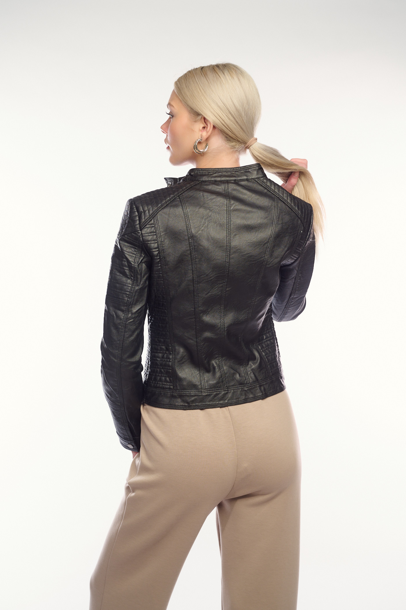 Πρόκειται για ένα κοντό, μαύρο δερματίνη μπουφάν σε εφαρμοστή γραμμή. Έχει ψηλό γιακά, οριζόντιες ραφές στο στήθος και φερμουάρ και τσέπες στο μπροστινό μέρος. Το μπουφάν διαθέτει επίσης διακριτικές ραφές στα μανίκια, προσδίδοντας μια μοντέρνα, biker αισθητική.