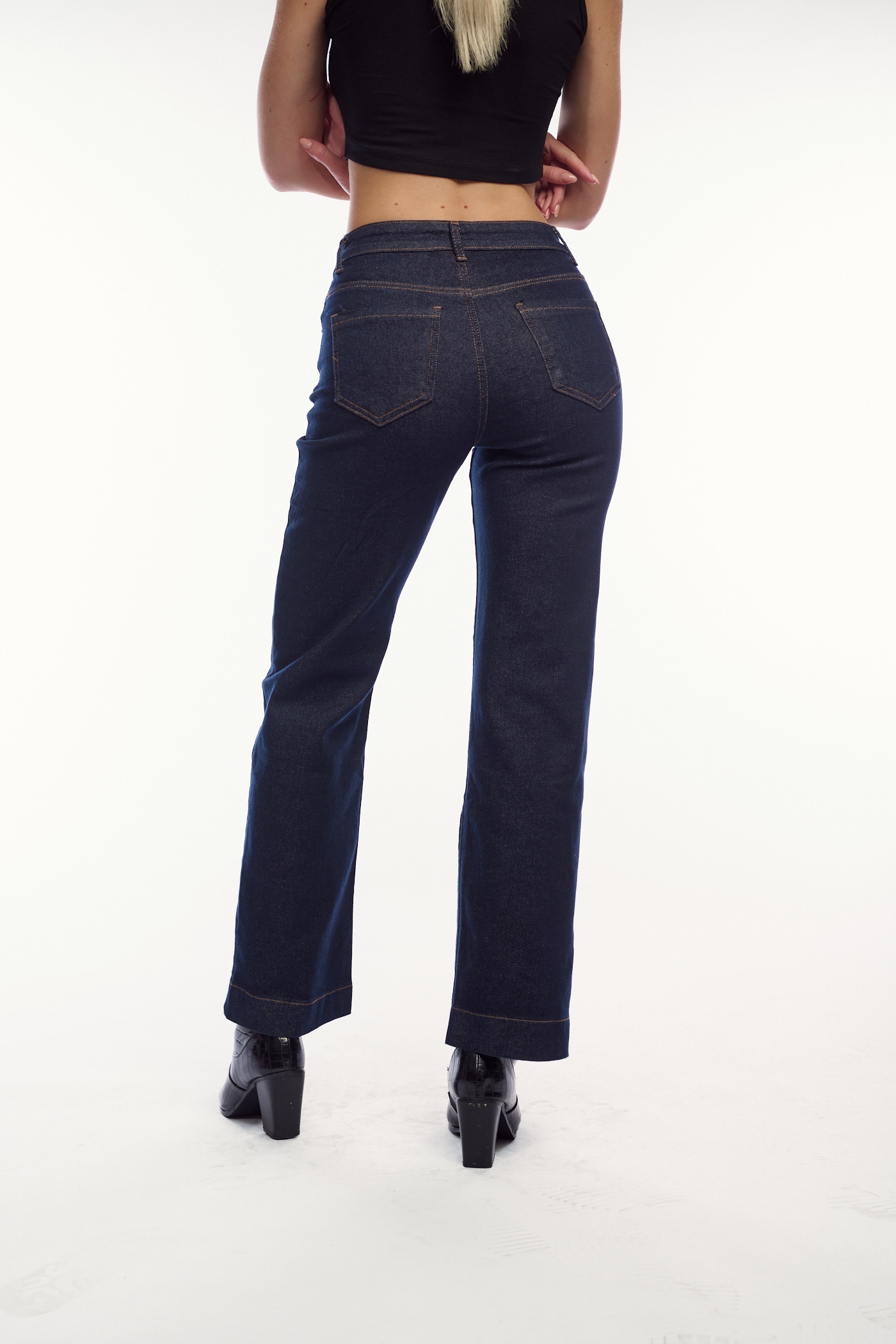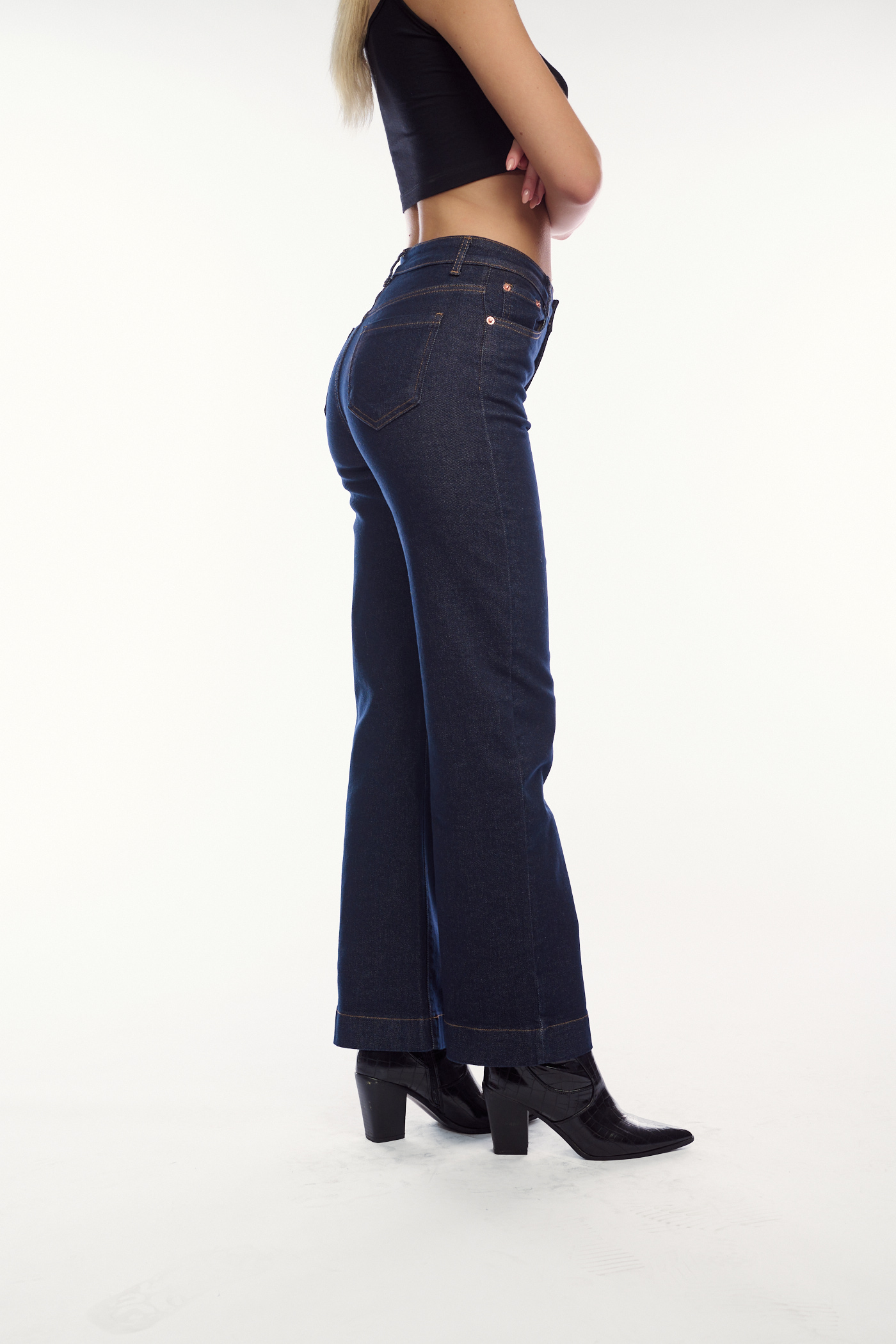 Πρόκειται για ένα ψηλόμεσο τζιν παντελόνι σε σκούρο μπλε χρώμα. Έχει ίσια, χαλαρή γραμμή καμπάνα που τελειώνει πάνω από τον αστράγαλο, δίνοντας μια μοντέρνα και κολακευτική σιλουέτα. Οι ραφές του είναι σε ένα διακριτικό καμηλό χρώμα. Φορέστε το με ένα μαύρο crop top και μαύρα μποτάκια με τακούνι, δημιουργώντας ένα casual αλλά εντυπωσιακό look.