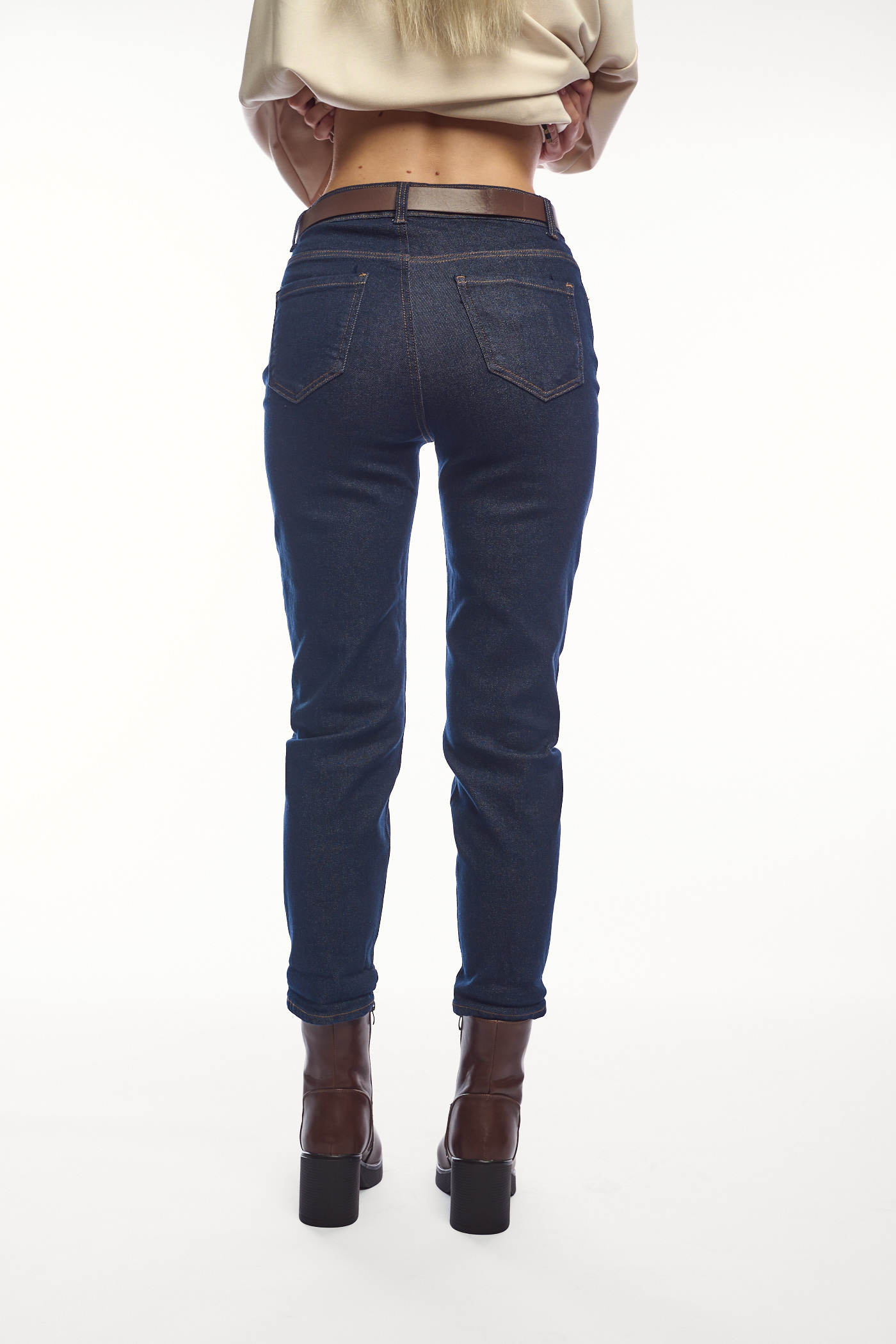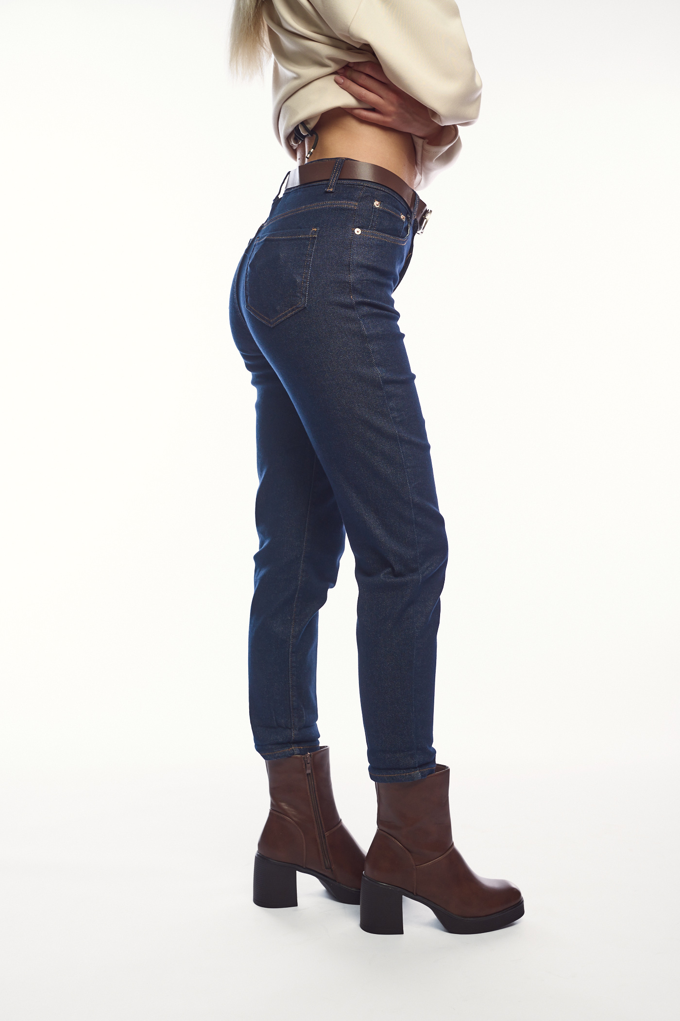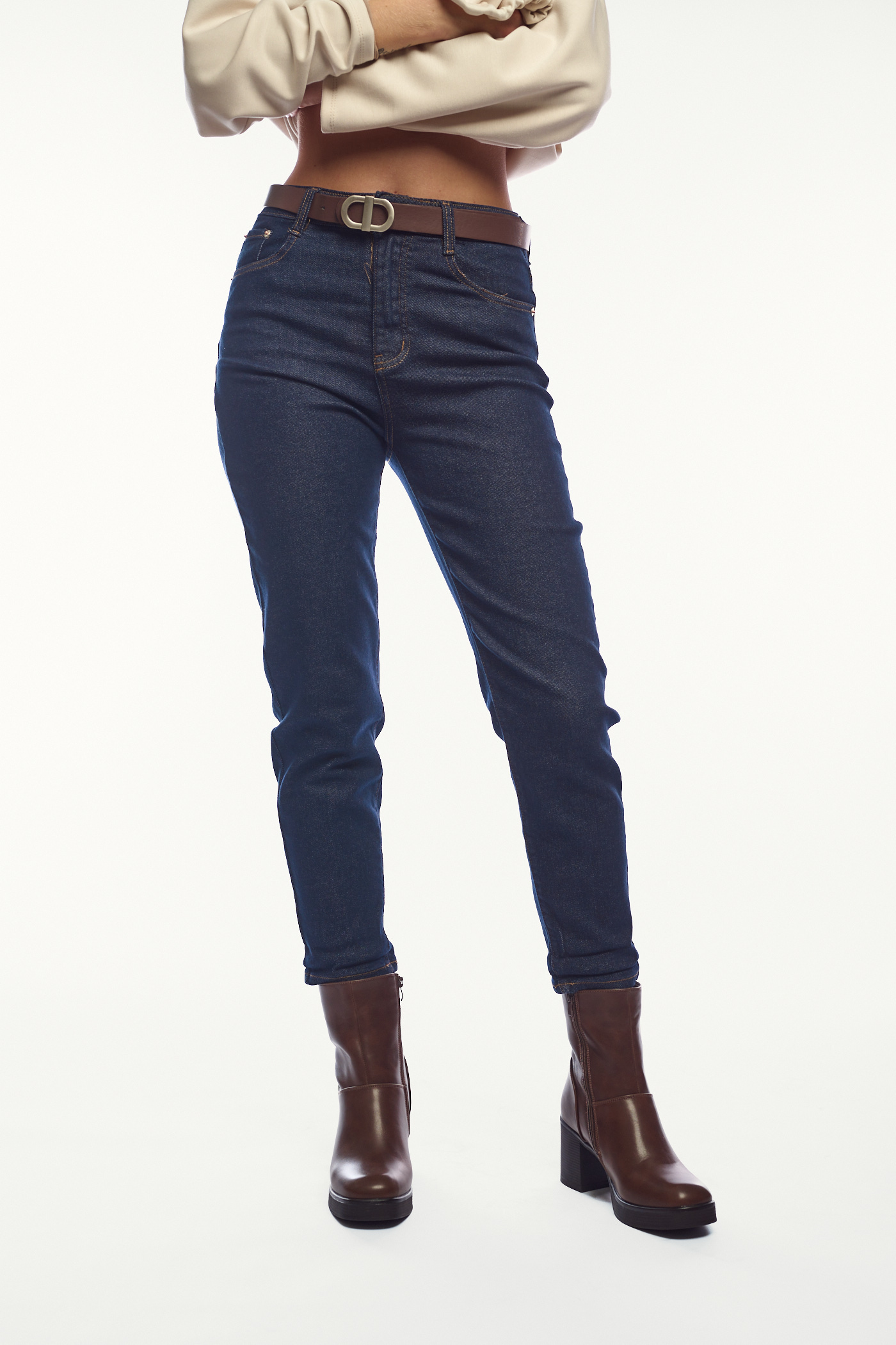 Ένα κλασικό ψηλόμεσο τζιν σε σκούρα μπλε απόχρωση με καμηλό εξώγαζα. Η γραμμή του είναι ίσια και στενή, τονίζοντας τη σιλουέτα, ενώ το ύφασμα είναι ελαστικό για άνετη εφαρμογή. Συνδυάστε το με καφέ ζώνη και καφέ μποτάκια για στυλάτες εμφανίσεις.