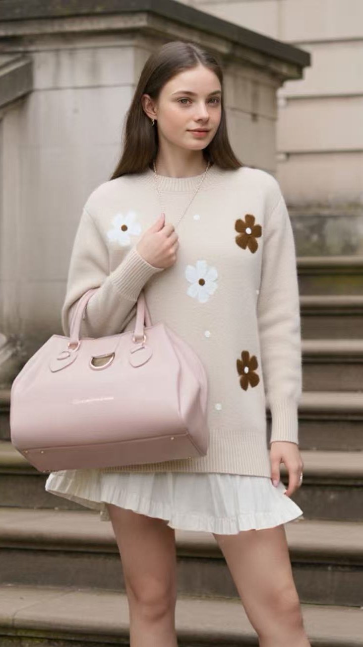 Το πουλόβερ έχει στρογγυλή λαιμόκοψη και άνετη, ελαφρώς μακριά γραμμή (tunic length), που το καθιστά ιδανικό για να φορεθεί πάνω από φούστα ή τζιν. Το κύριο διακοσμητικό στοιχείο είναι τα μεγάλα, κεντημένα λουλούδια που είναι διάσπαρτα στην μπροστινή του πλευρά. Τα λουλούδια έχουν αντίθετα χρώματα, συγκεκριμένα λευκό και σκούρο καφέ και συνοδεύονται από μικρότερες διακοσμητικές λεπτομέρειες