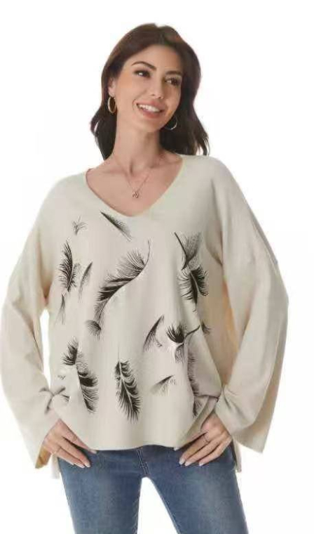Φαρδιά Μπλούζα με Απαλό Μπεζ και Σχέδιο Φτερά-J6372