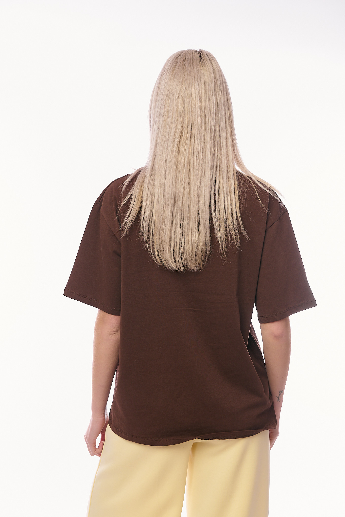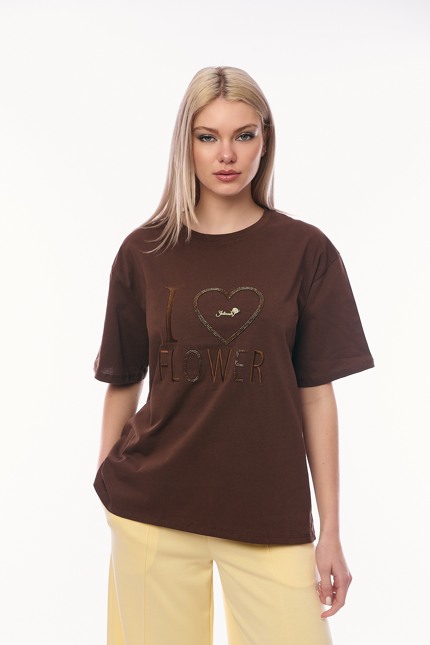 Το μπλουζάκι ξεχωρίζει για το κεντρικό του σχέδιο, όπου η φράση "I FLOWER" είναι κεντημένη με ανάγλυφη κλωστή σε ταιριαστό καφέ χρώμα, ενώ μια μεγάλη καρδιά από λαμπερά στρασάκια πλαισιώνει το σύνολο. Διαθέτει κλασική στρογγυλή λαιμόκοψη και άνετα κοντά μανίκια σε oversized γραμμή, προσφέροντας μια χαλαρή σιλουέτα που κολακεύει κάθε σώμα. Η πλούσια σοκολατί απόχρωσή του δημιουργεί έναν υπέροχο συνδυασμό με την κίτρινη παντελόνα της συλλογής μας, προσφέροντας ένα σύγχρονο look που αποπνέει θηλυκότητα και φρεσκάδα. Το ύφασμά του είναι ελαστικό.