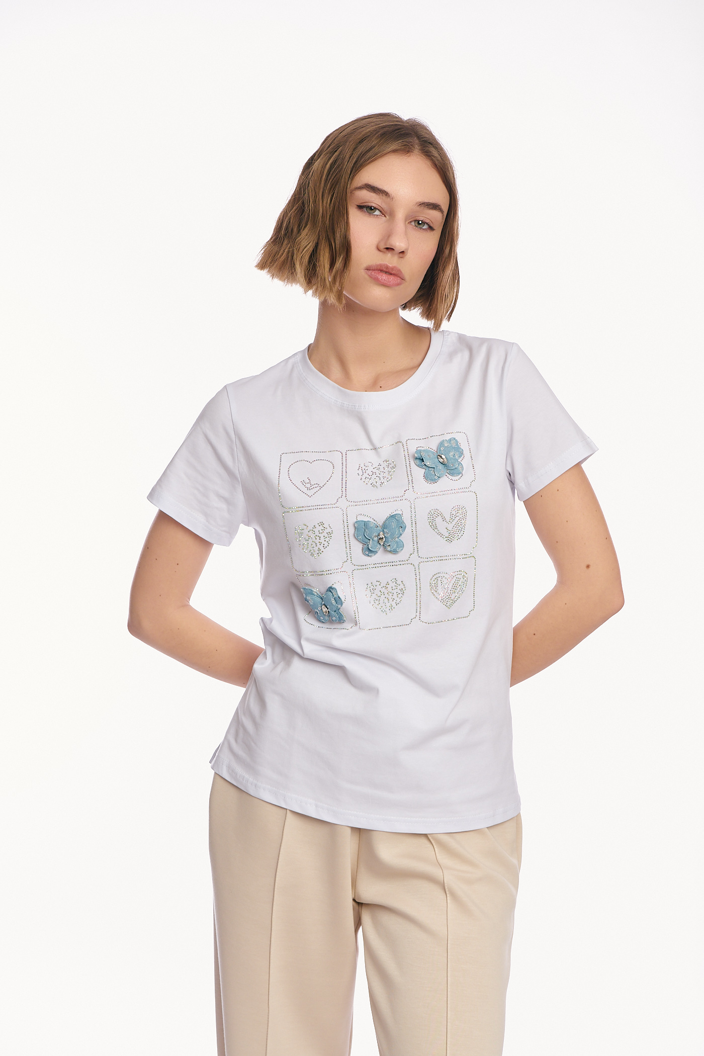 • Γυναικείο Λευκό T-shirt με Κεντημένα Πλαίσια, Τρισδιάστατες Γαλάζιες Πεταλούδες και Σχέδια Καρδιές με Στρας-4467B
