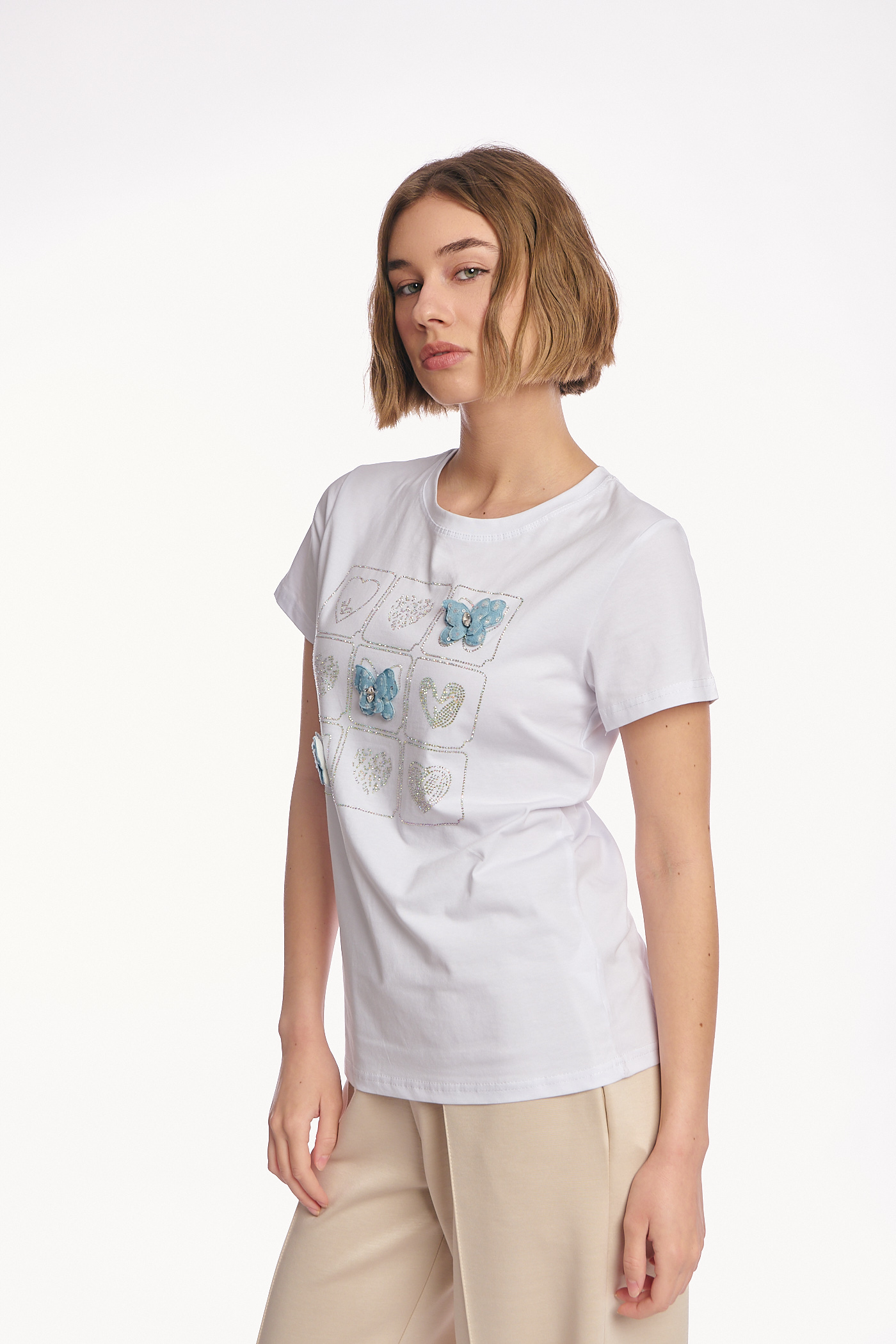 Γυναικείες Μπλούζες : Γυναικείο Λευκό T-shirt με Κεντημένα Πλαίσια, Τρισδιάστατες Γαλάζιες Πεταλούδες και Σχέδια Καρδιές με Στρας-4467B