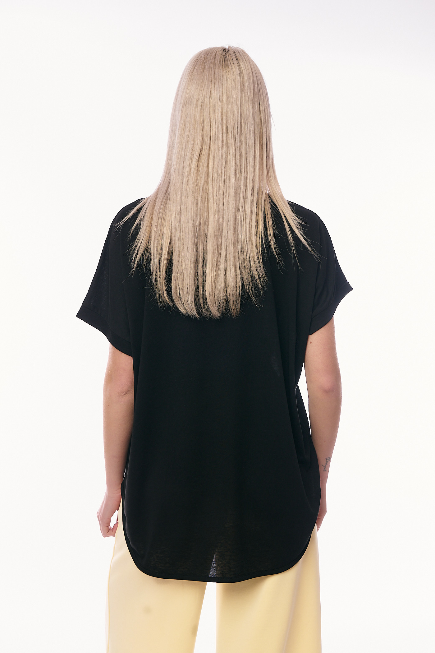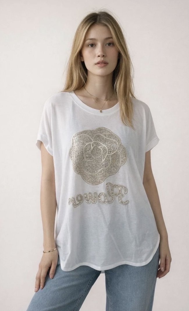 Το μπλουζάκι ξεχωρίζει για το κεντρικό του θέμα, ένα μεγάλο ανάγλυφο λουλούδι που σχηματίζεται από πυκνά τοποθετημένα χρυσά στρασάκια, ενώ από κάτω αναγράφεται η λέξη "Flower" με την ίδια λαμπερή τεχνική. Διαθέτει χαλαρή, oversized γραμμή με στρογγυλή λαιμόκοψη και κοντά μανίκια που καταλήγουν σε διακριτικό ρεβέρ, προσφέροντας άνεση και στυλ σε κάθε κίνηση. Το ασύμμετρο τελείωμα, ελαφρώς μακρύτερο στο πίσω μέρος, δίνει μια μοντέρνα νότα στη σιλουέτα. Διαθέσιμο σε λευκό και μαύρο χρώμα.