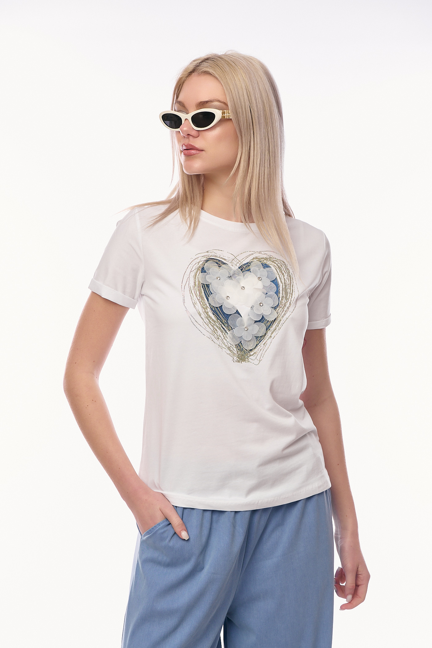 Λευκό με Μπλε T-shirt με Καρδιά από Χρυσές Κλωστές & 3D Λουλούδια-RJ78008G