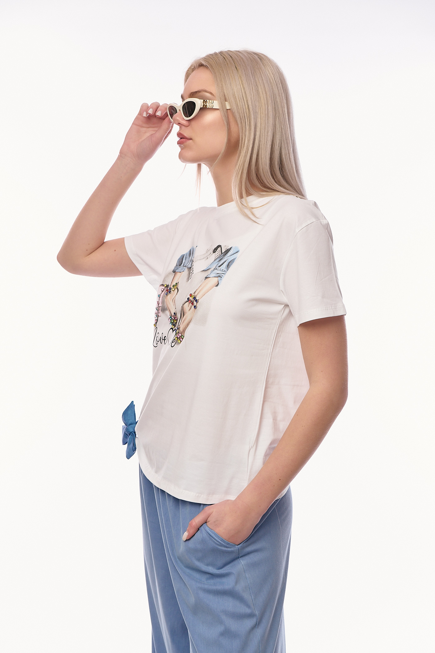Λευκό T-shirt με Love Me Print, Πολύχρωμα Στρας & Μπλε Φιόγκο-186