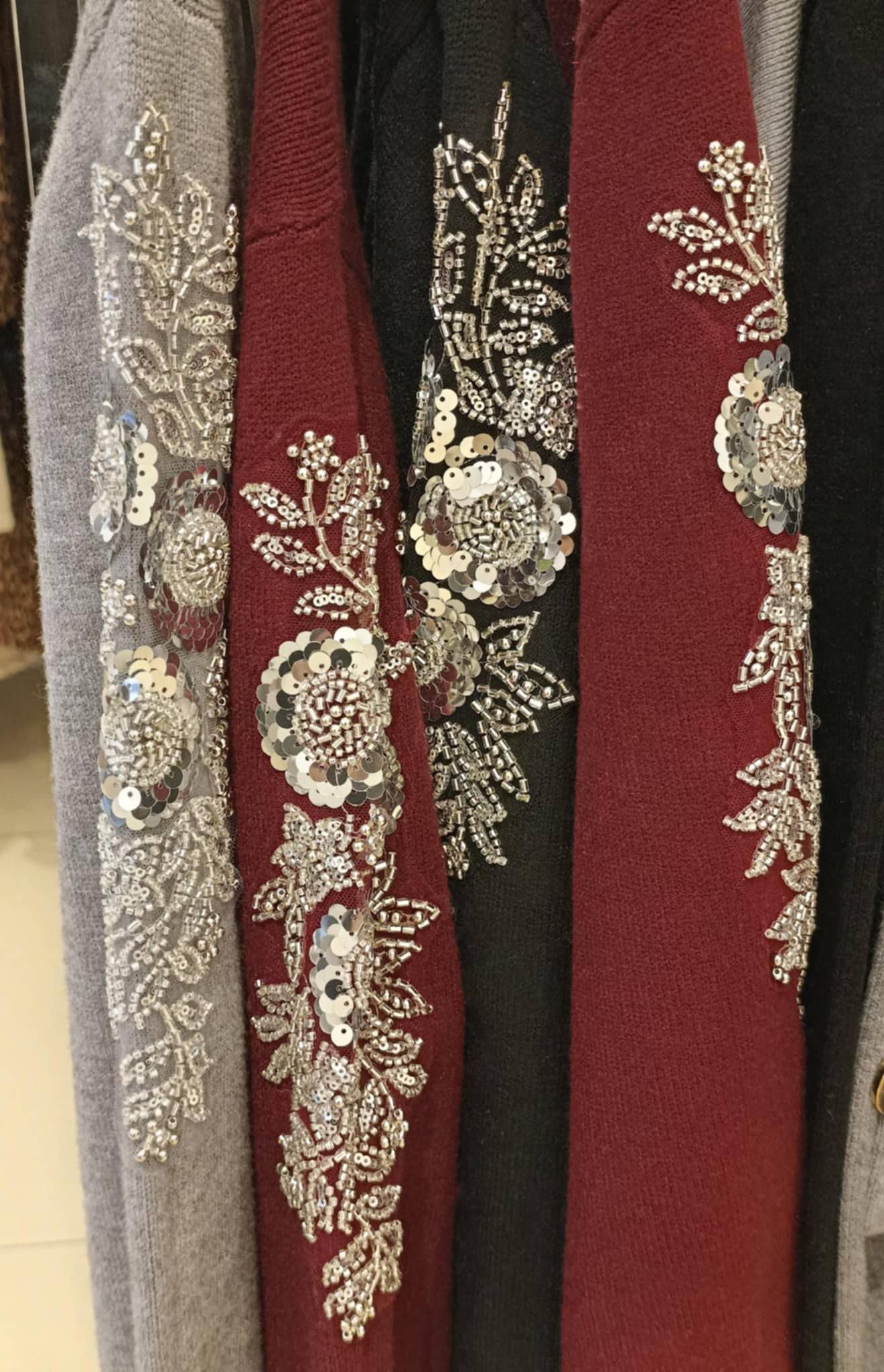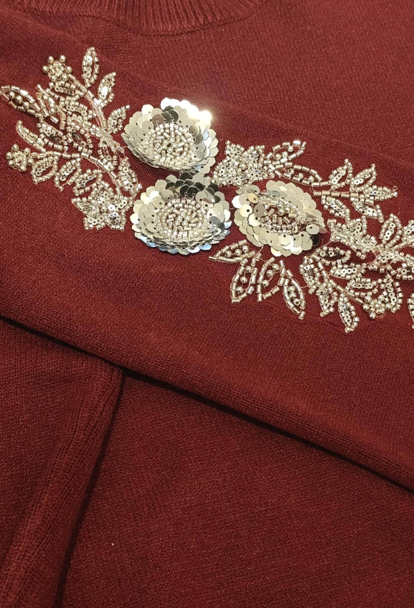 Ένα κομψό και φωτεινό πουλόβερ σε καφέ χρώμα, ιδανικό για να δώσει λάμψη στις καθημερινές σας εμφανίσεις. Η κλασική γραμμή crew neck και η λεπτή πλέξη του το καθιστούν άνετο, ενώ το εντυπωσιακό κέντημα από ασημένιες παγιέτες και χάντρες στους ώμους και τα μανίκια προσθέτει έναν αέρα πολυτέλειας. Τα μανίκια έχουν χαλαρή εφαρμογή και καταλήγουν σε ριμπ μανσέτα. Συνδυάστε το με τζιν ή σκούρα παντελόνια για να αναδείξετε τη διακριτική του λάμψη.