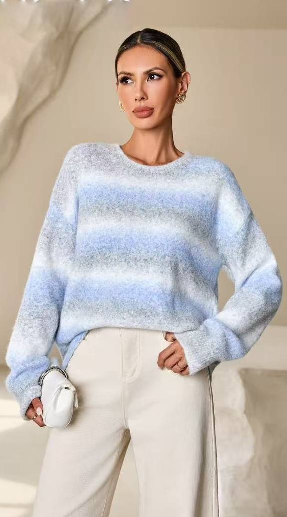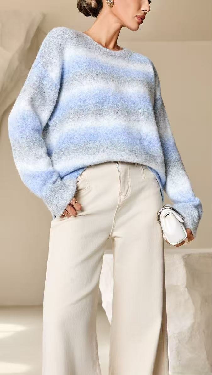 Αυτό το χνουδωτό, πλεκτό πουλόβερ είναι η επιτομή της άνεσης και του χειμερινού στυλ. Το πουλόβερ διαθέτει οριζόντιες ρίγες με ντεγκραντέ (ombré) εφέ, συνδυάζοντας απαλές αποχρώσεις του μπλε, του γκρι και του λευκού. Αυτός ο συνδυασμός χρωμάτων θυμίζει ουρανό ή παγωμένη θάλασσα, προσδίδοντας μια ήρεμη και κομψή νότα. Η χνουδωτή και αφράτη πλέξη (fluffy knit) προσφέρει εξαιρετική απαλότητα και ζεστασιά. Έχει χαλαρή (relaxed) και άνετη γραμμή (oversized/boyfriend style) και τελείωμα σε κανονικό μήκος.