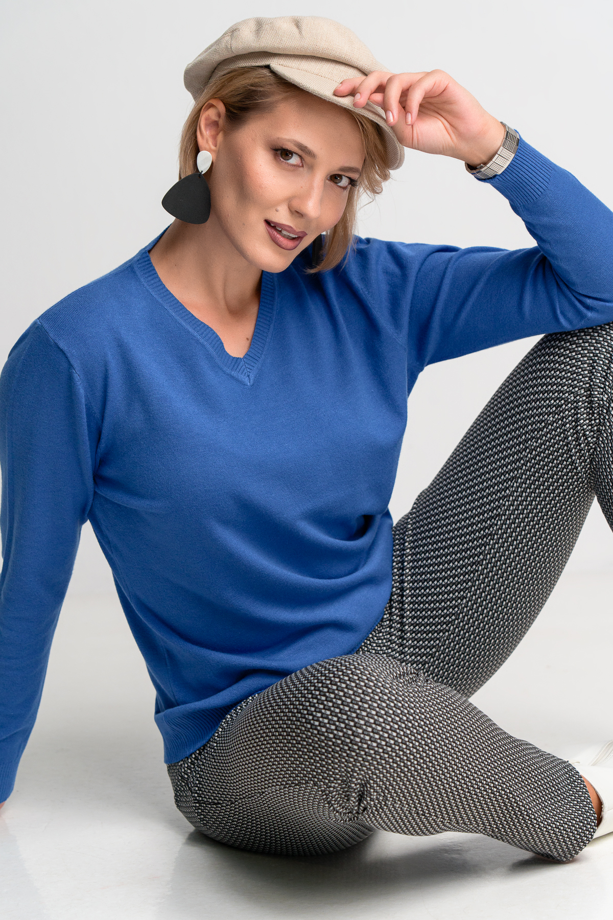 Πουλόβερ πλεκτό με βε λαιμόκοψη, κανπνική εφαρμογή, ίσια γραμμή.